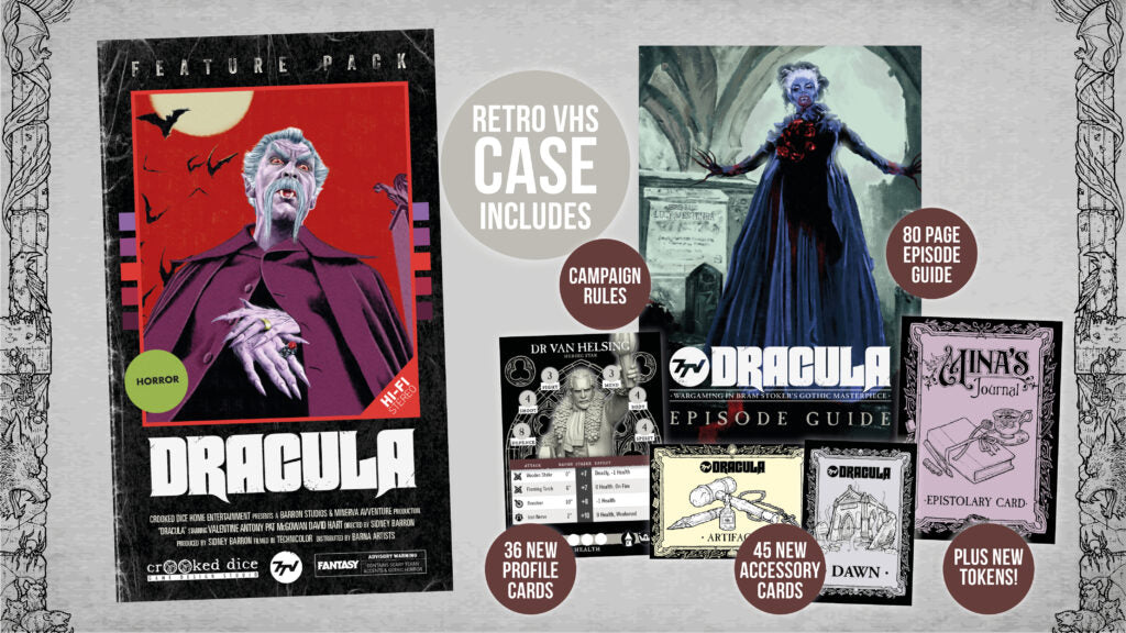 Play a cast of heroic vampire hunters or the forces of darkness controlled by the diabolic Count Dracula. Recreate epic clashes in Transylvania, Whitby, the Westenra Tomb, Carfax Abbey and Castle Dracula. The feature pack includes bespoke chapters, characters and artifacts – plus adds new mechanics inspired by the classic novel.