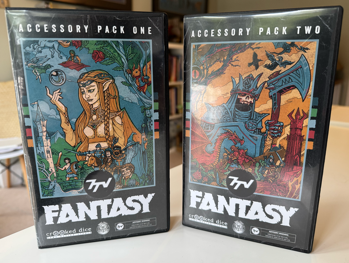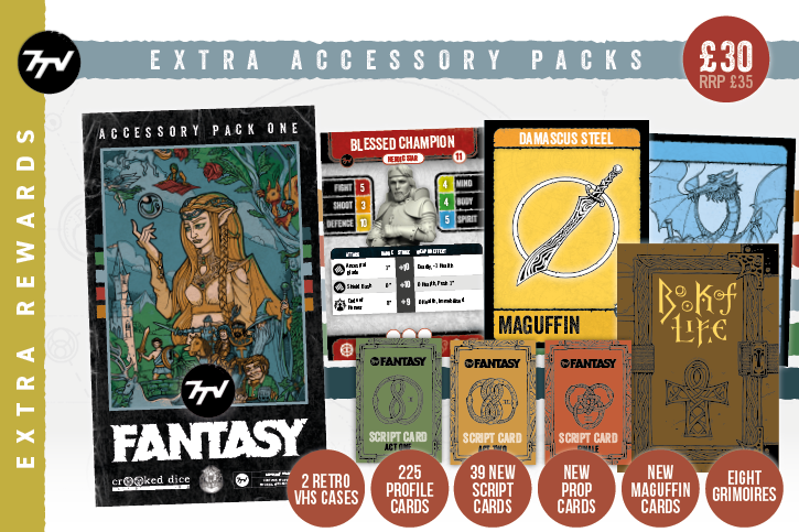 Upgrade your tabletop with these bumper two set pack of printed accessory cards designed to be used with the 7TV Fantasy Genre Guide. This pack is packaged in TWO retro VHS case and includes:
