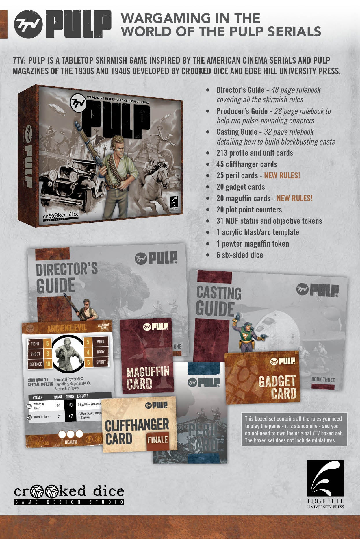 7TV: Pulp is a tabletop skirmish game inspired by the American cinema serials and pulp magazines of the 1930s and 1940s. Designed to work with the 7TV 2nd edition rules, 7TV: Pulp rules contained within this box are stand alone, but are intended to allow players to run games within the many fantastic, hardboiled or thrilling worlds of the pulp genre.
