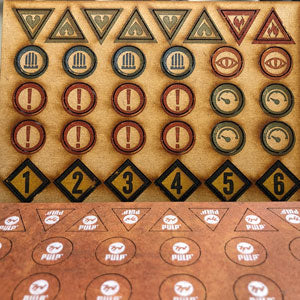 This set of counters have everything you need to play games of 7TV PULP. If you intend to play bigger games you may want additional sets. The token set is colour MDF – printed both sides and includes: