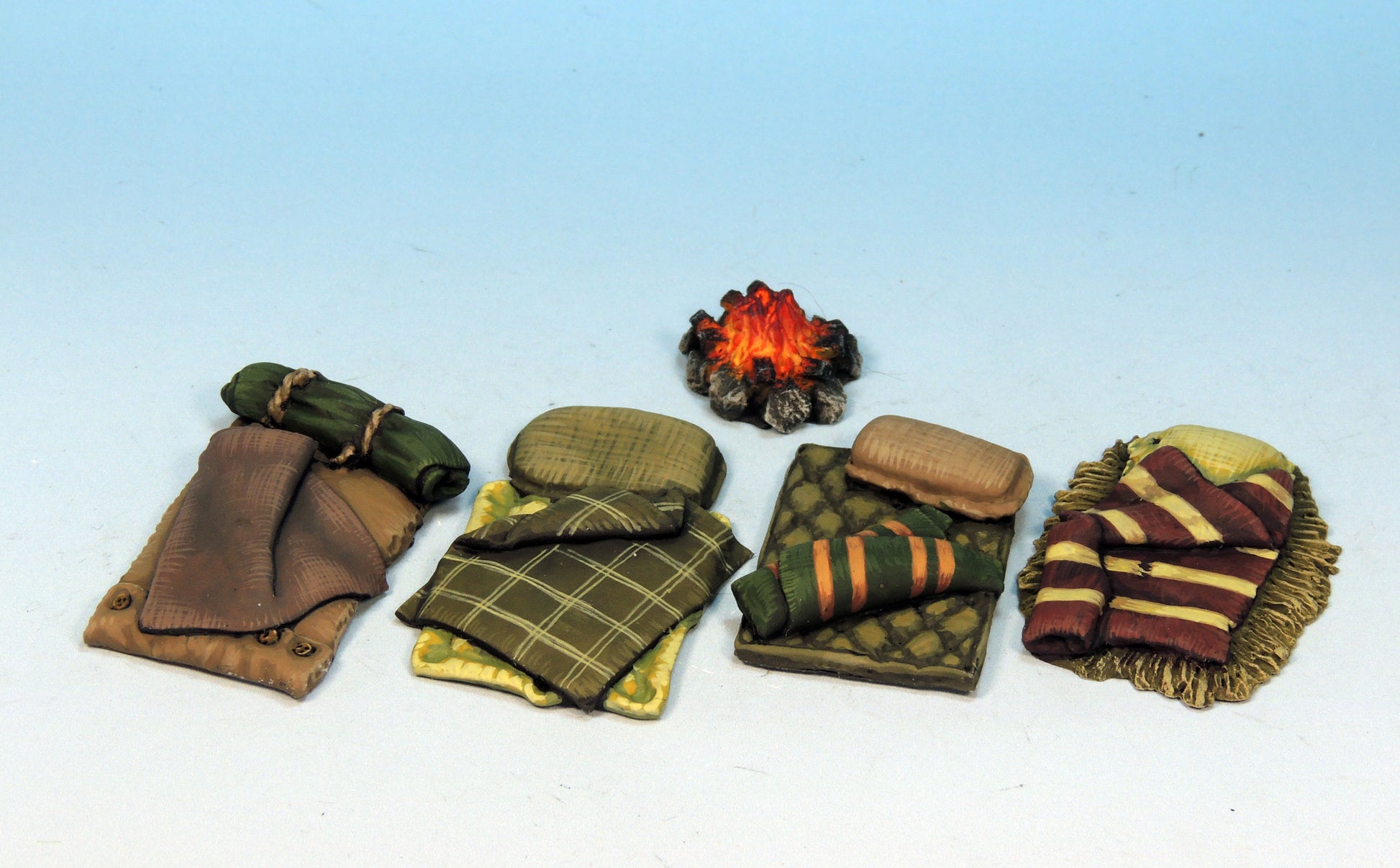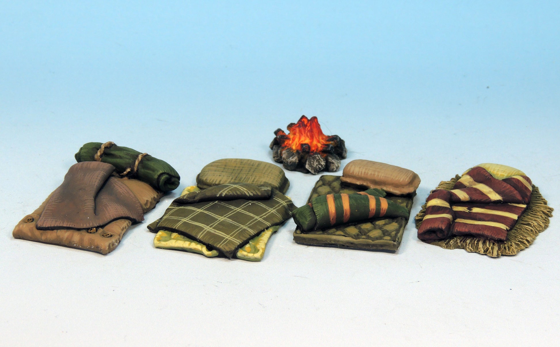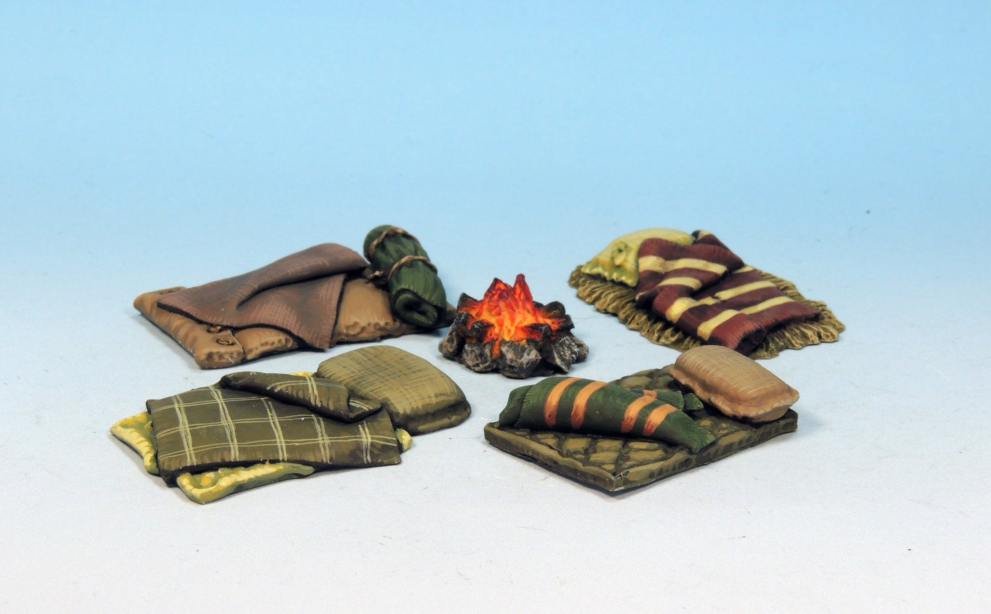 Includes four bedrolls and one campfire. This five piece scenic set was sculpted by Iain Gonzalez. Cast in resin. Supplied unpainted. Includes three pieces.