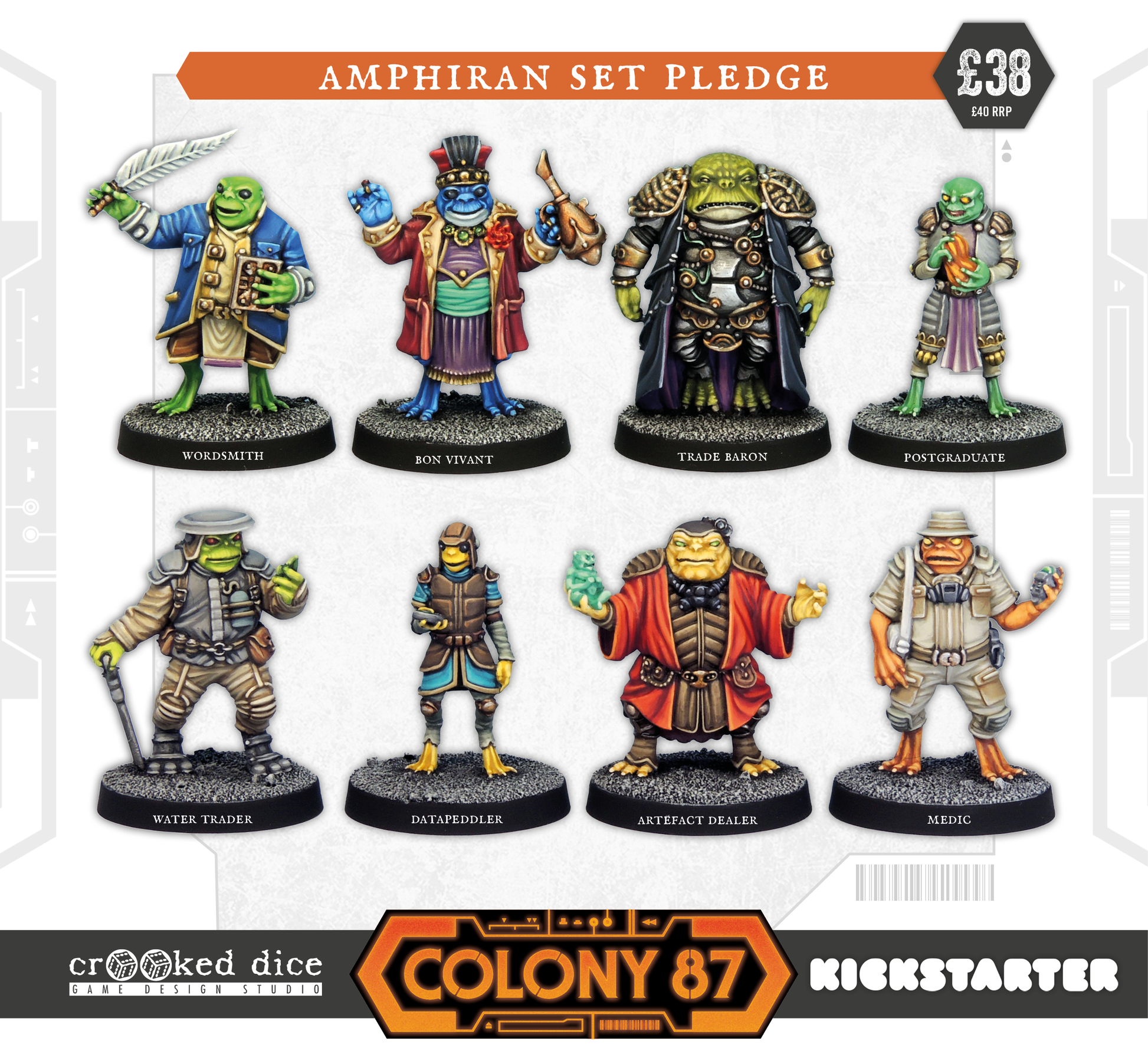 8 iconic denizens for a retro sci-fi future: Wordsmith, Bon Vivant, Trade Baron, Postgraduate, Water Trader, Datapeddler, Artefact Dealer and Medic.