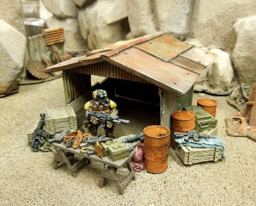 Need to shop for ammo or a weapons upgrade? Then pay a visit to your neighbourhood arms dealer. This set consists of six pieces: three drum and crate stacks, two trestles and counter top.