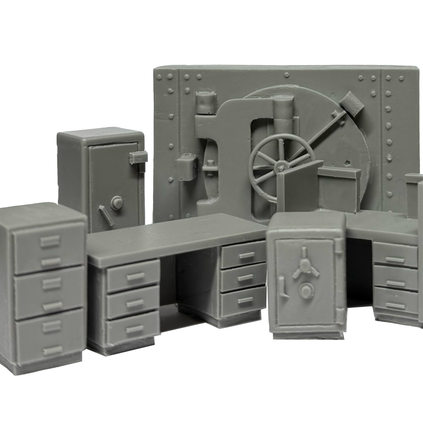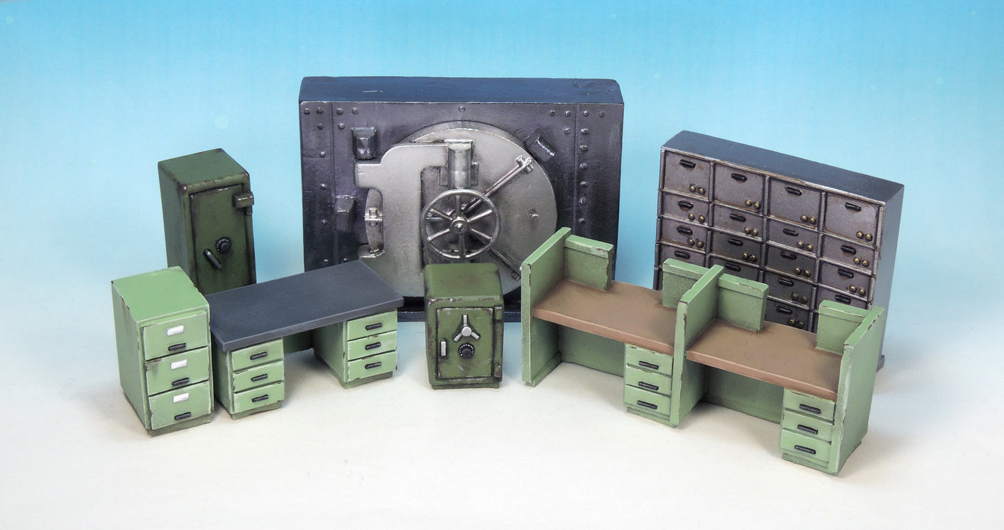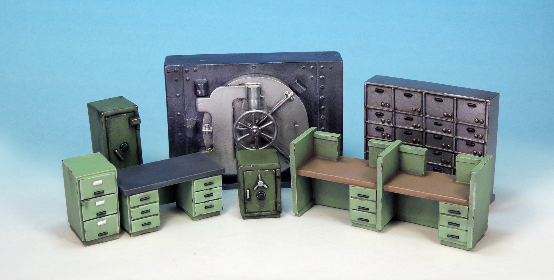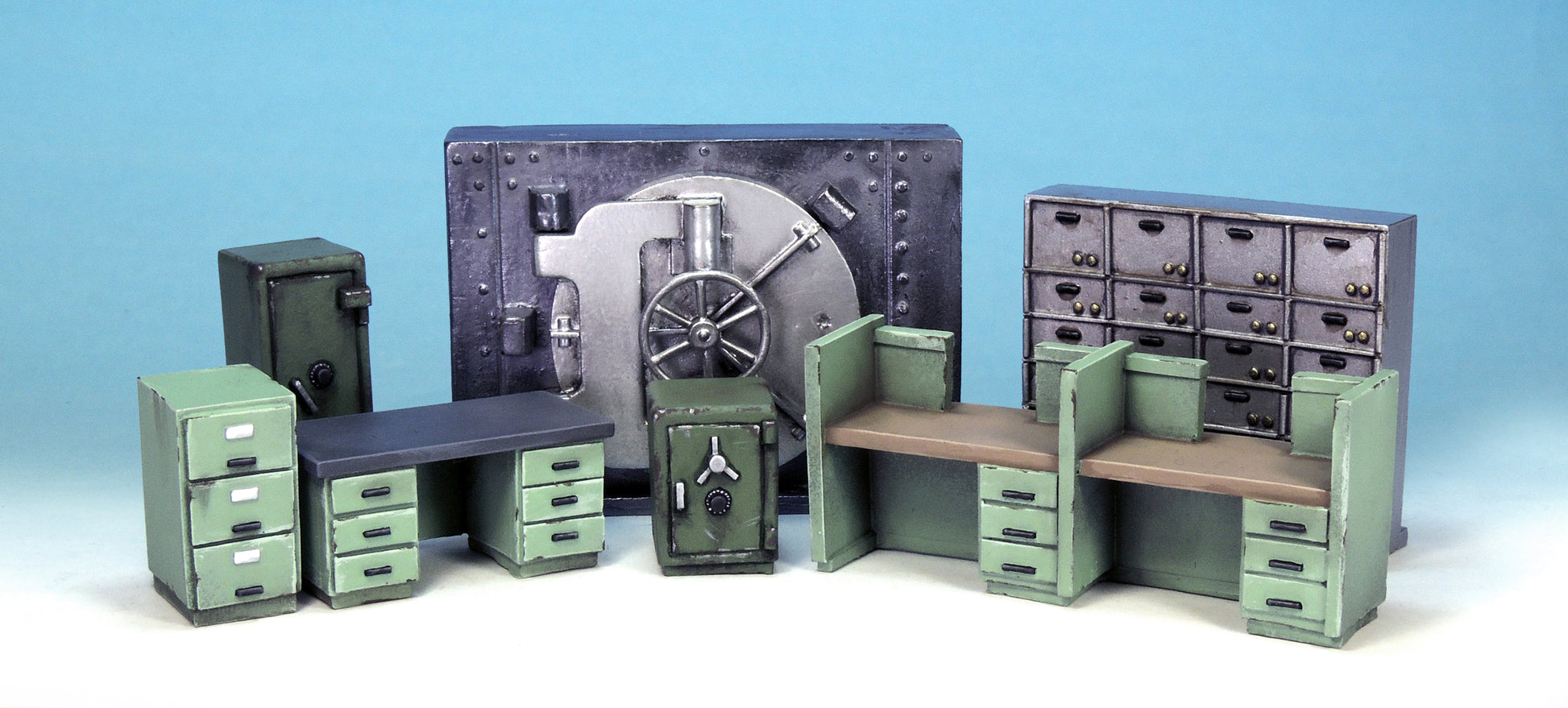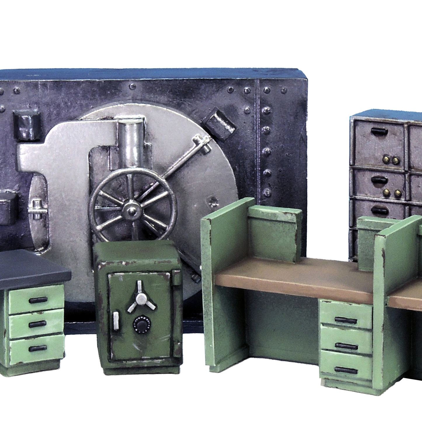 This kit contains nine pieces: vault door (three parts), safety deposit boxes, teller counter, small safe, large safe, filing cabinet and manager’s desk.
