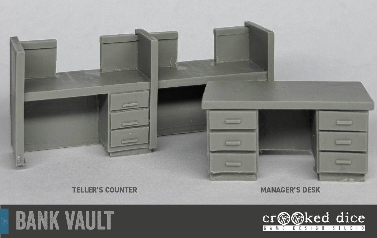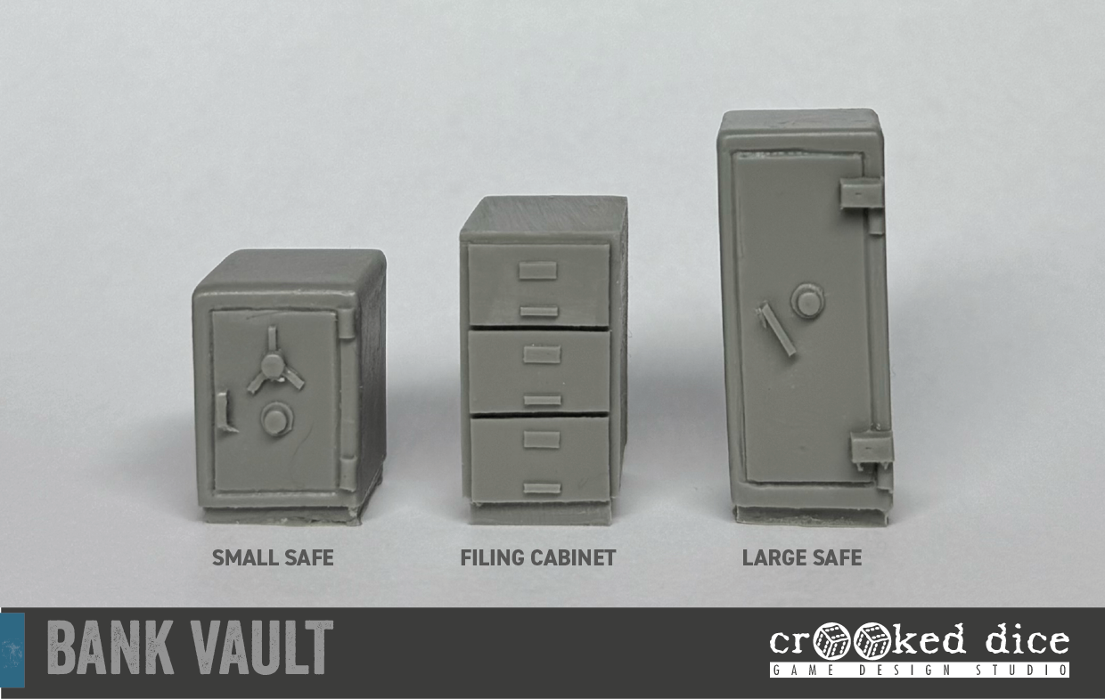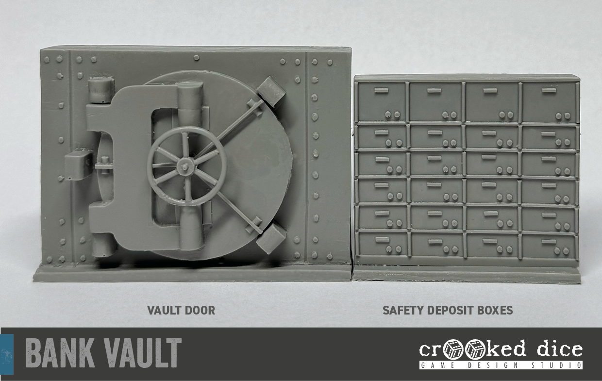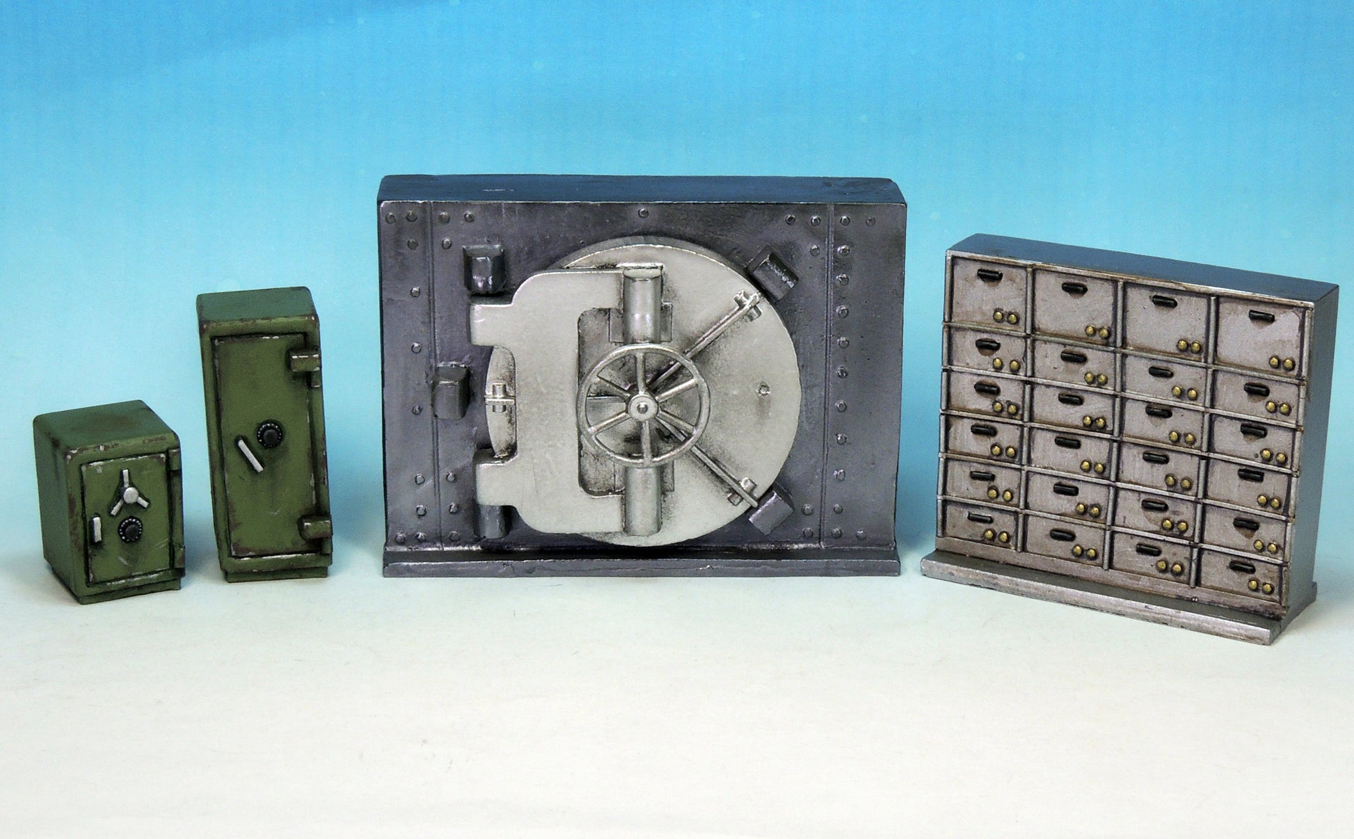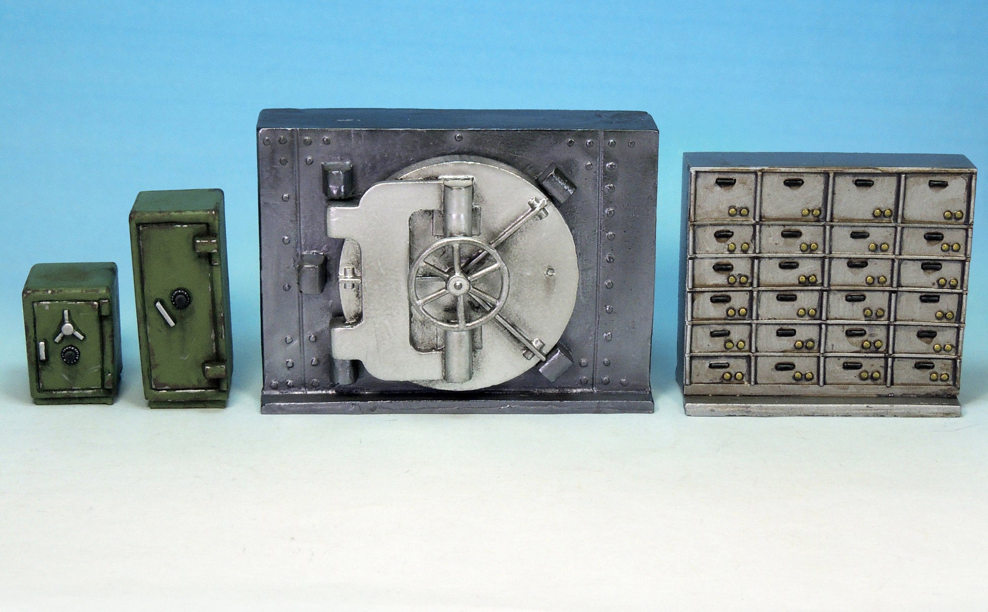 This kit contains nine pieces: vault door (three parts), safety deposit boxes, teller counter, small safe, large safe, filing cabinet and manager’s desk.