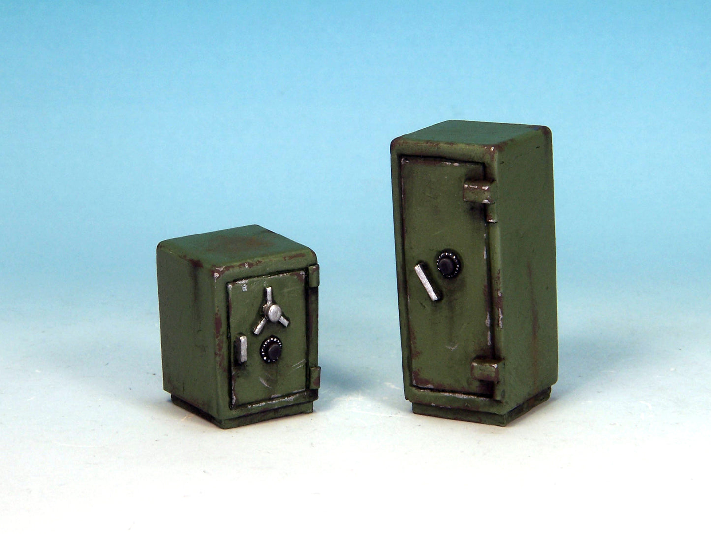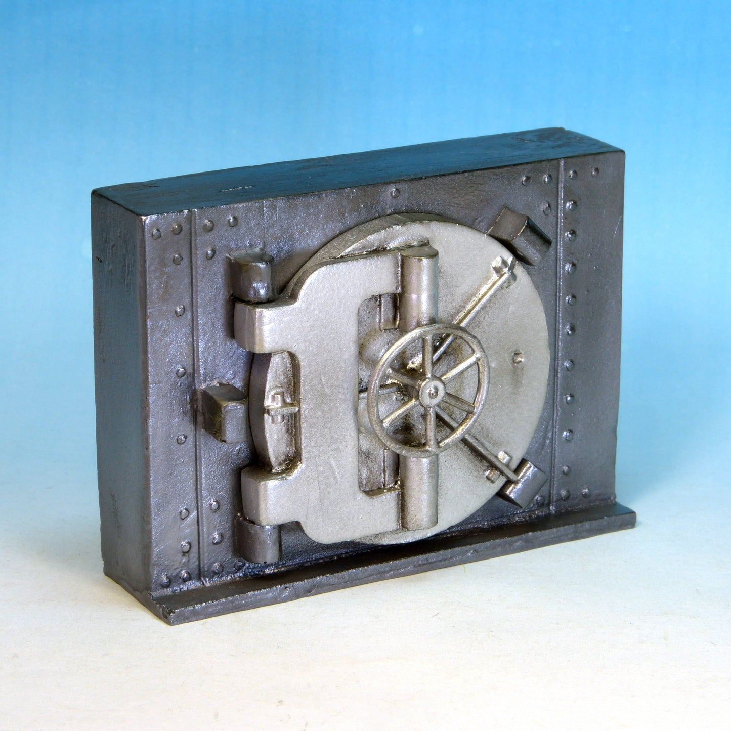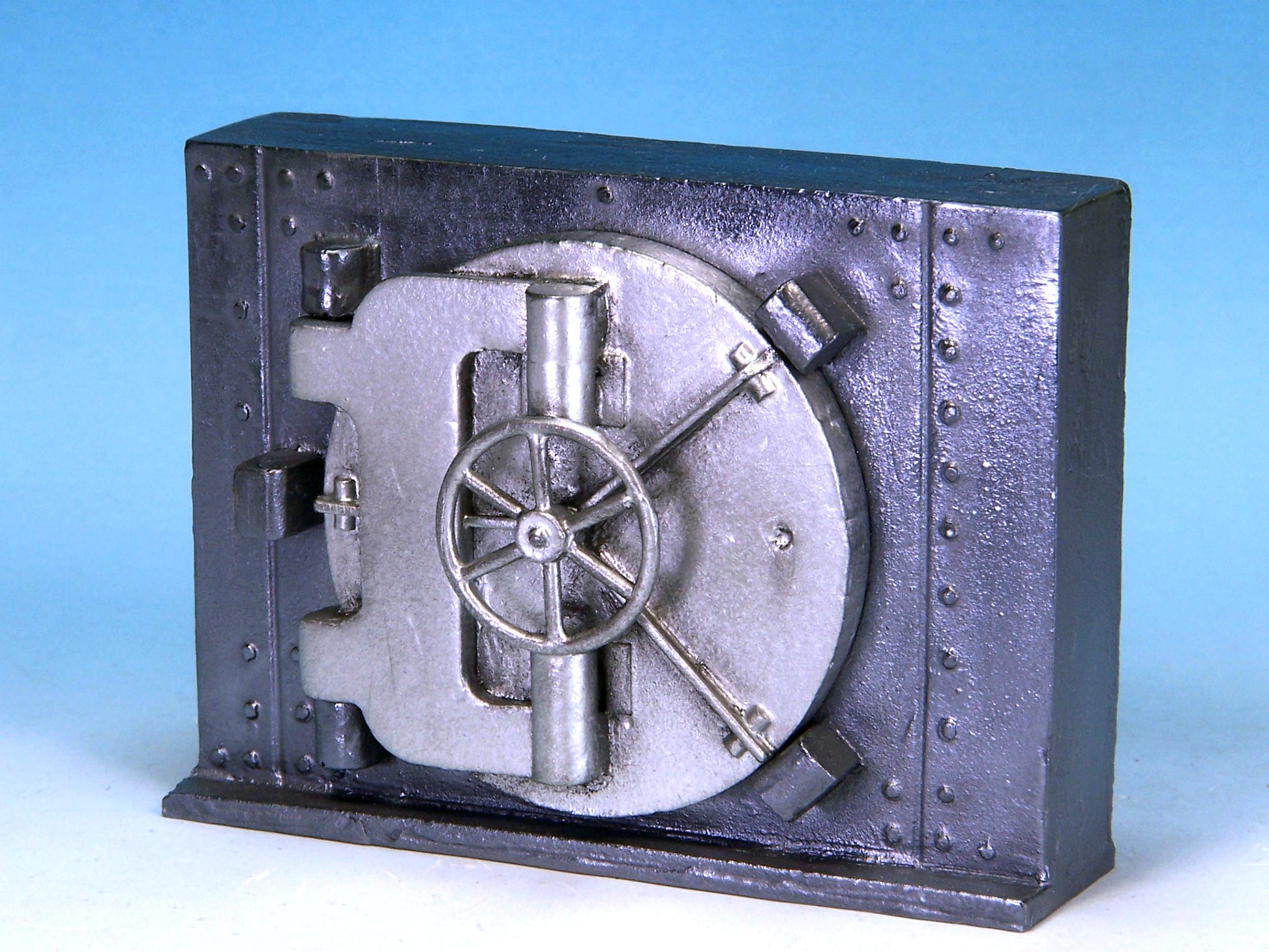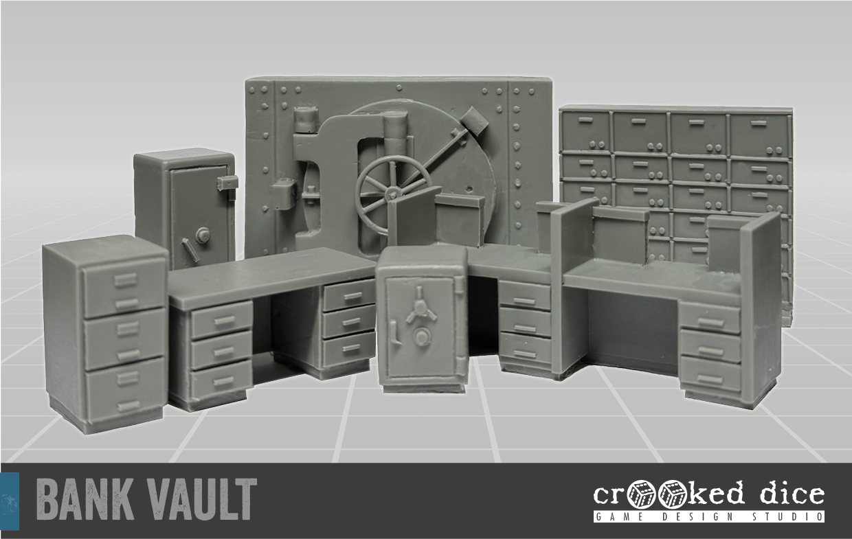 This kit contains nine pieces: vault door (three parts), safety deposit boxes, teller counter, small safe, large safe, filing cabinet and manager’s desk.