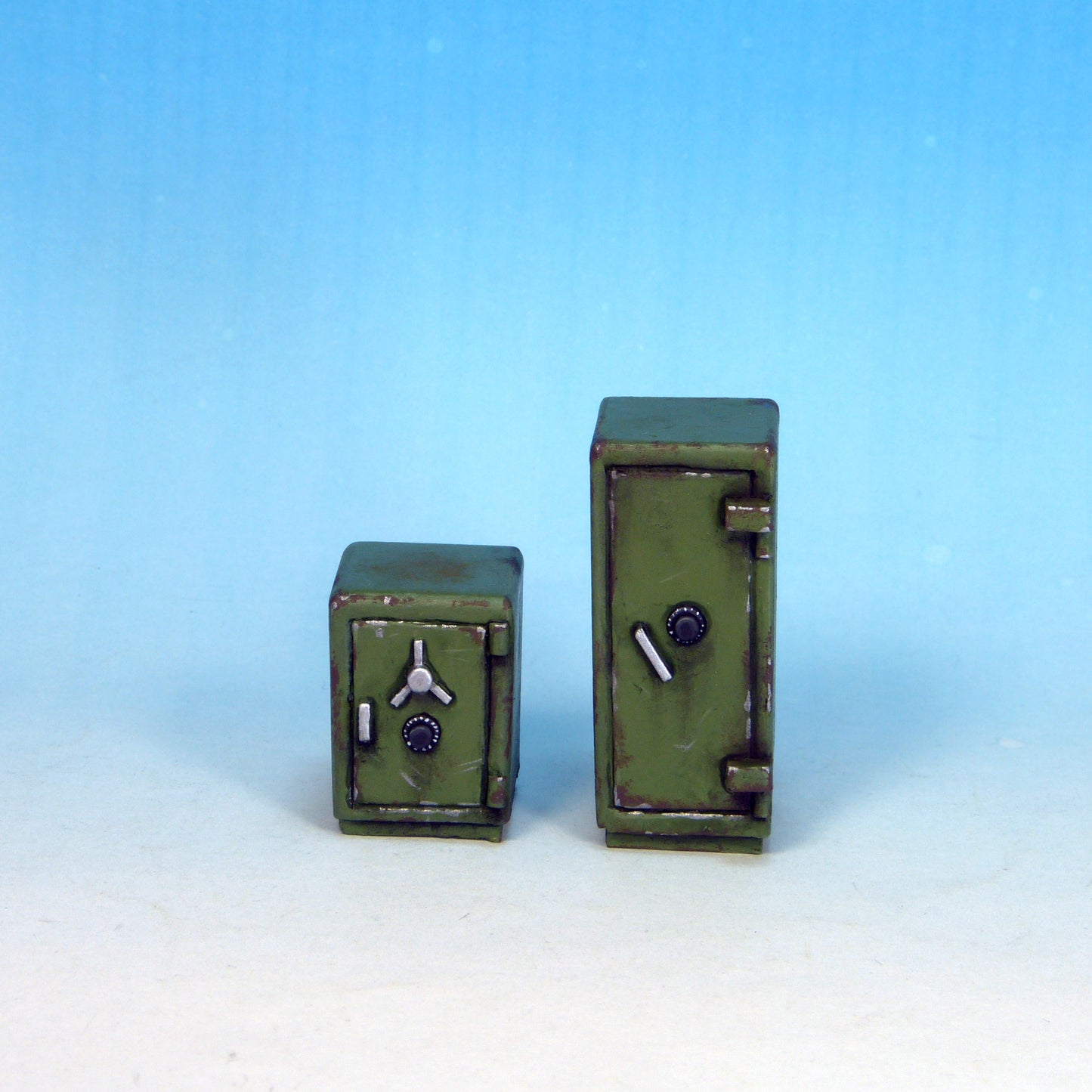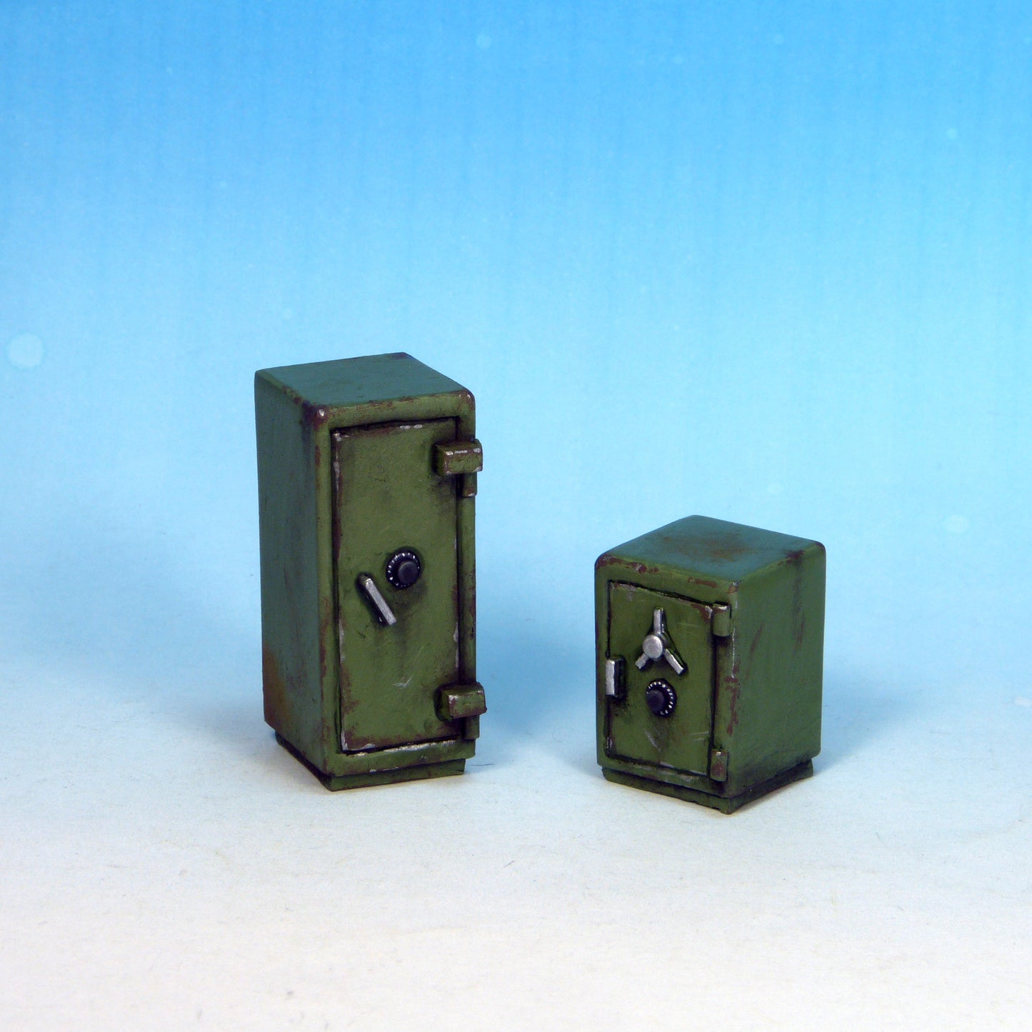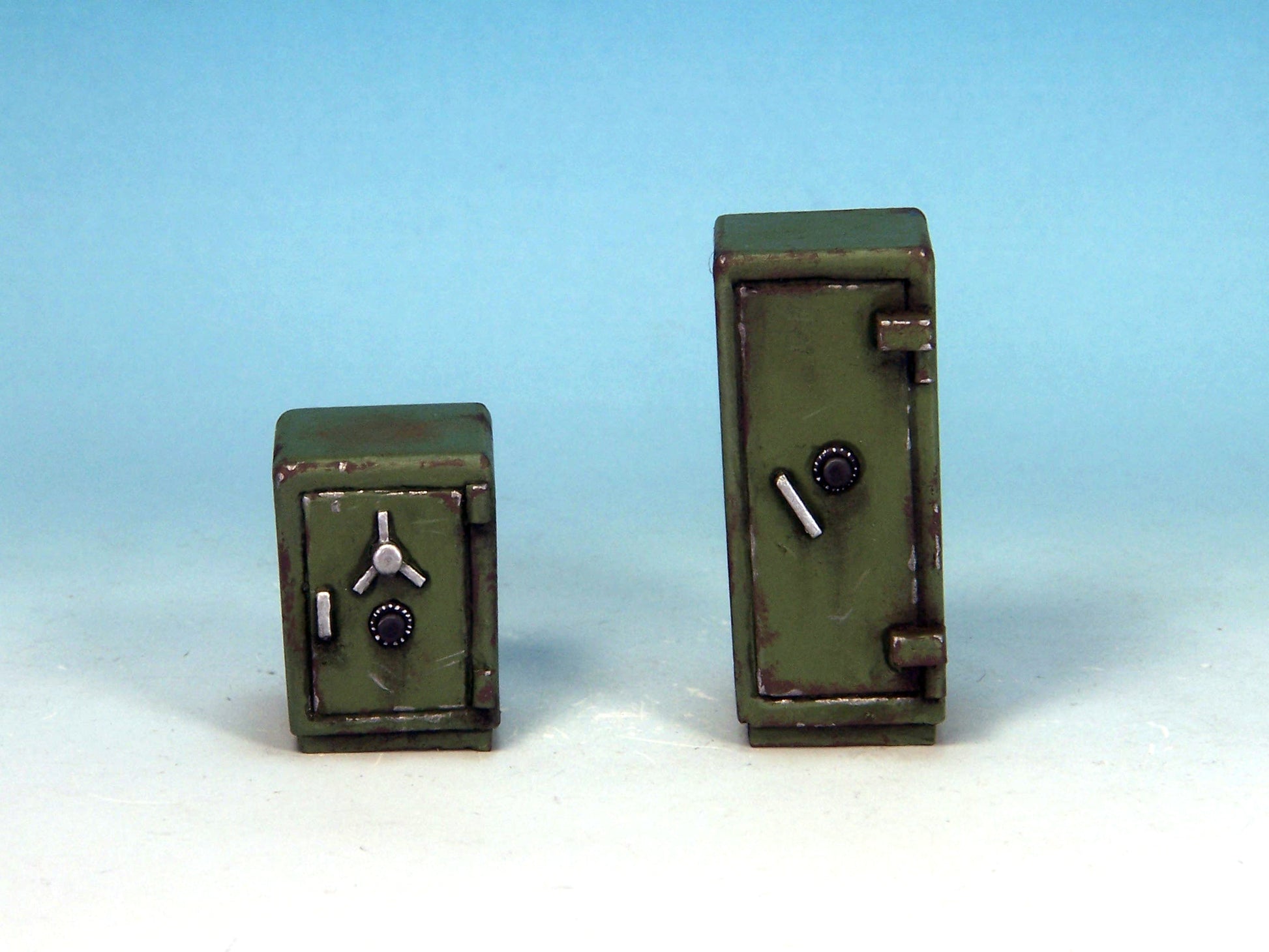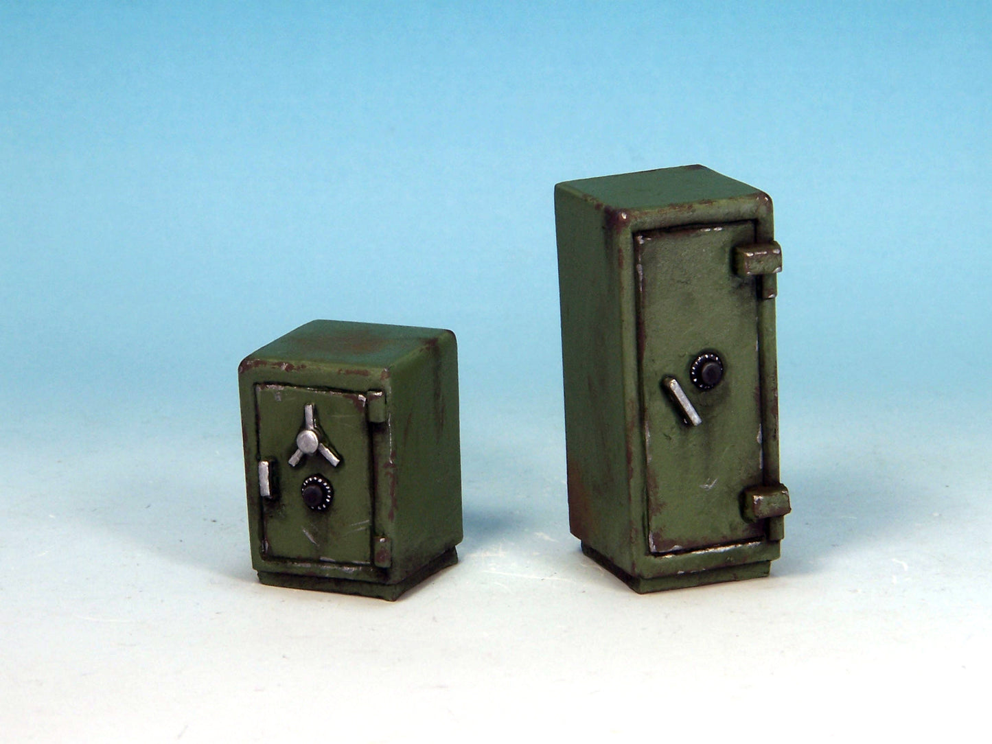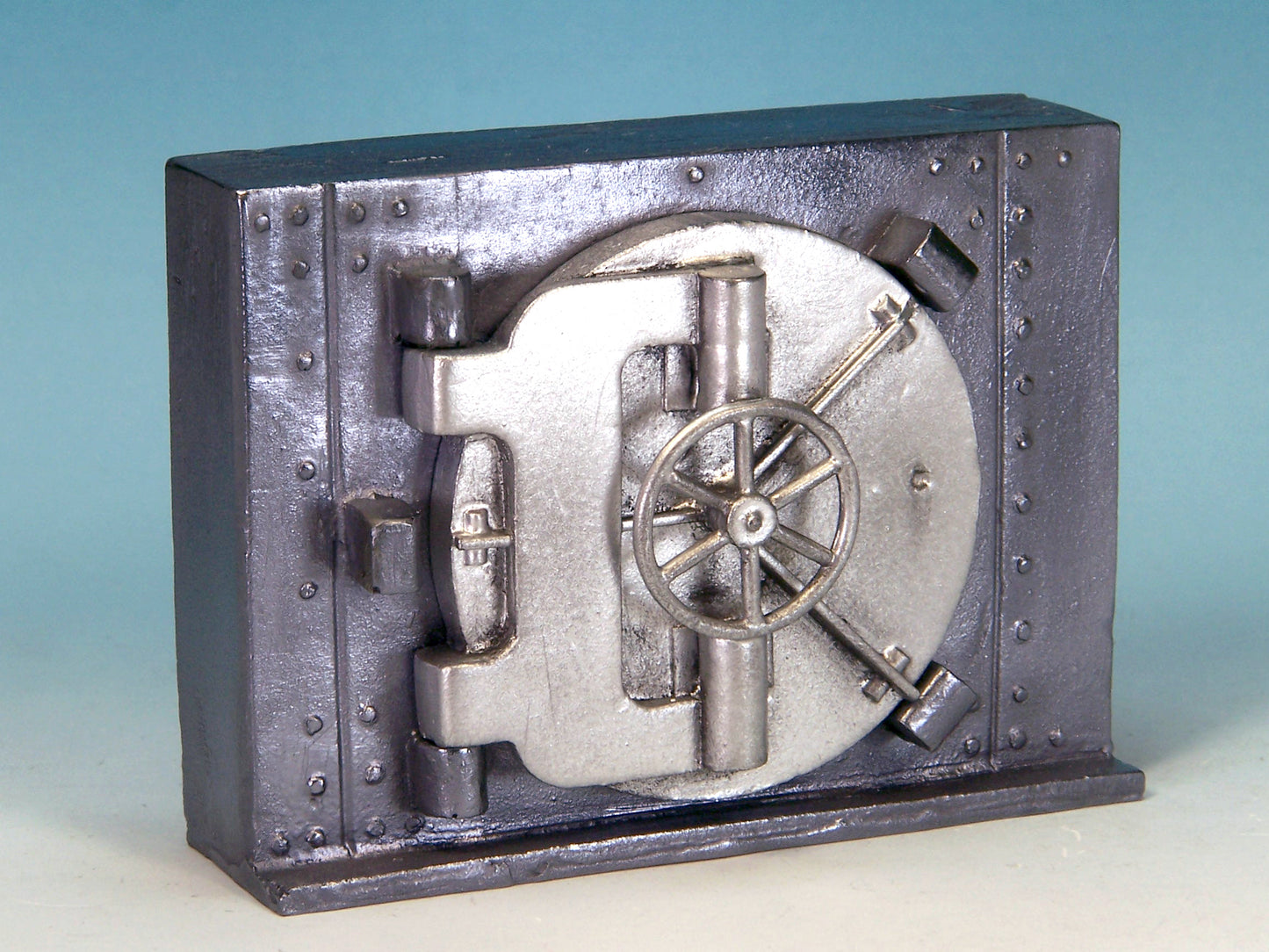 This kit contains nine pieces: vault door (three parts), safety deposit boxes, teller counter, small safe, large safe, filing cabinet and manager’s desk.