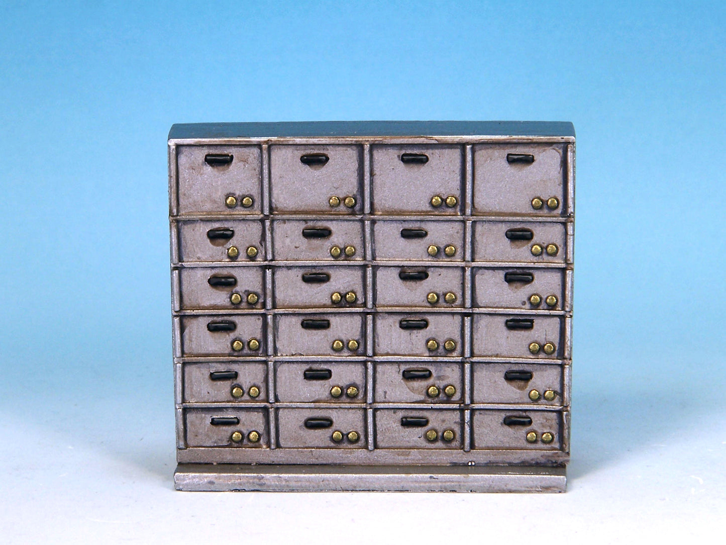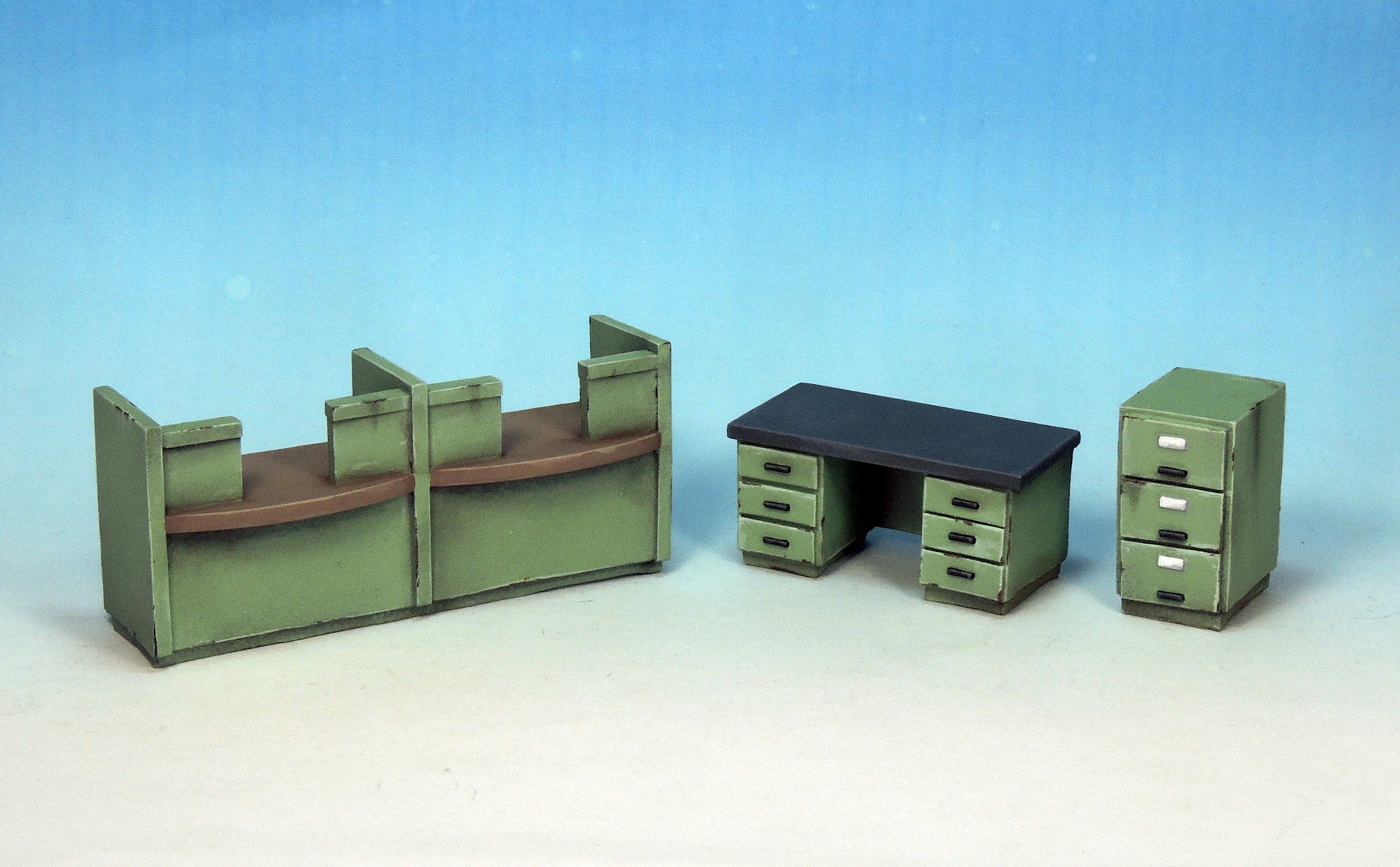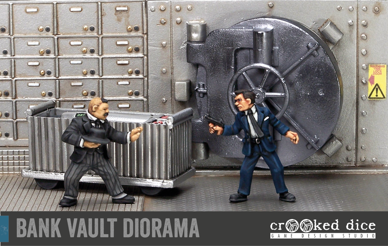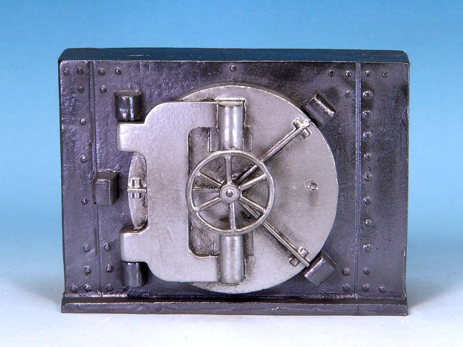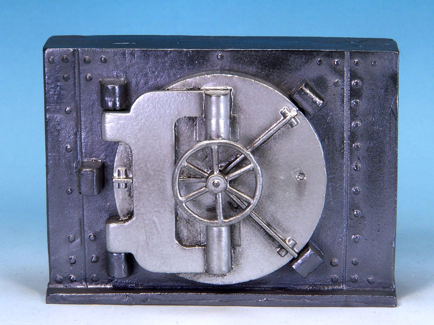 This kit contains nine pieces: vault door (three parts), safety deposit boxes, teller counter, small safe, large safe, filing cabinet and manager’s desk.