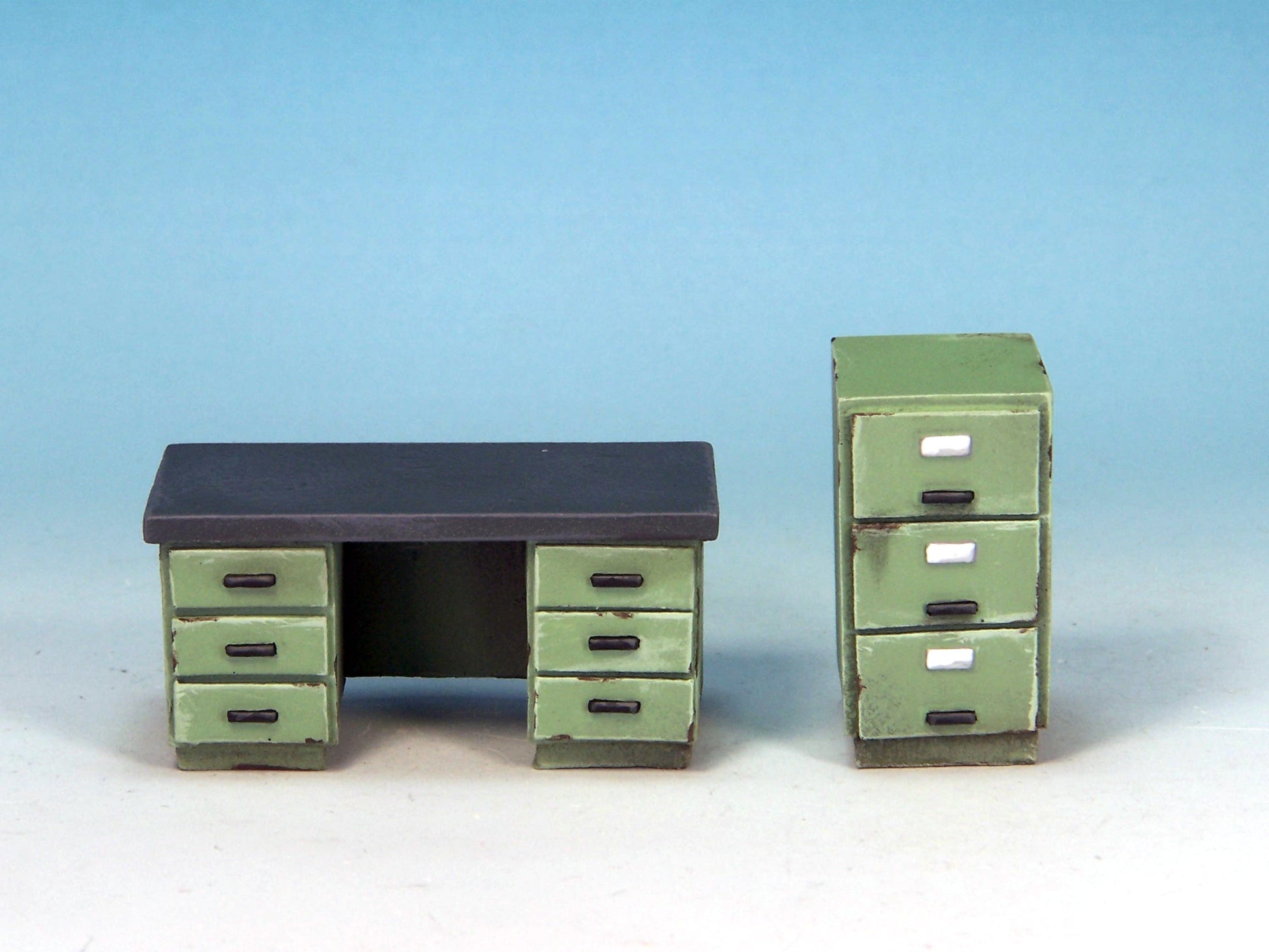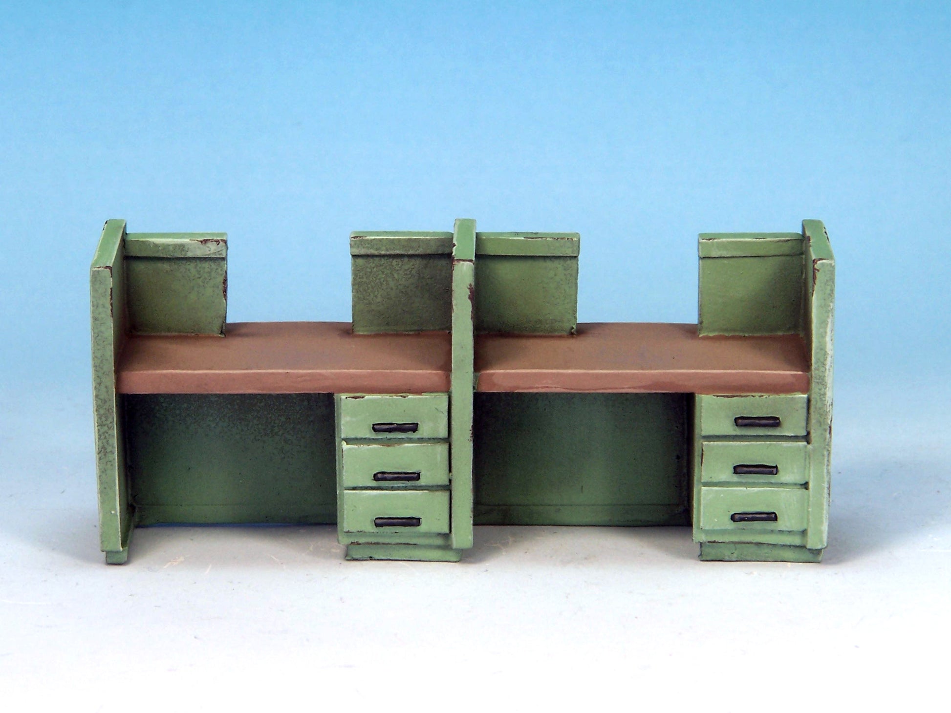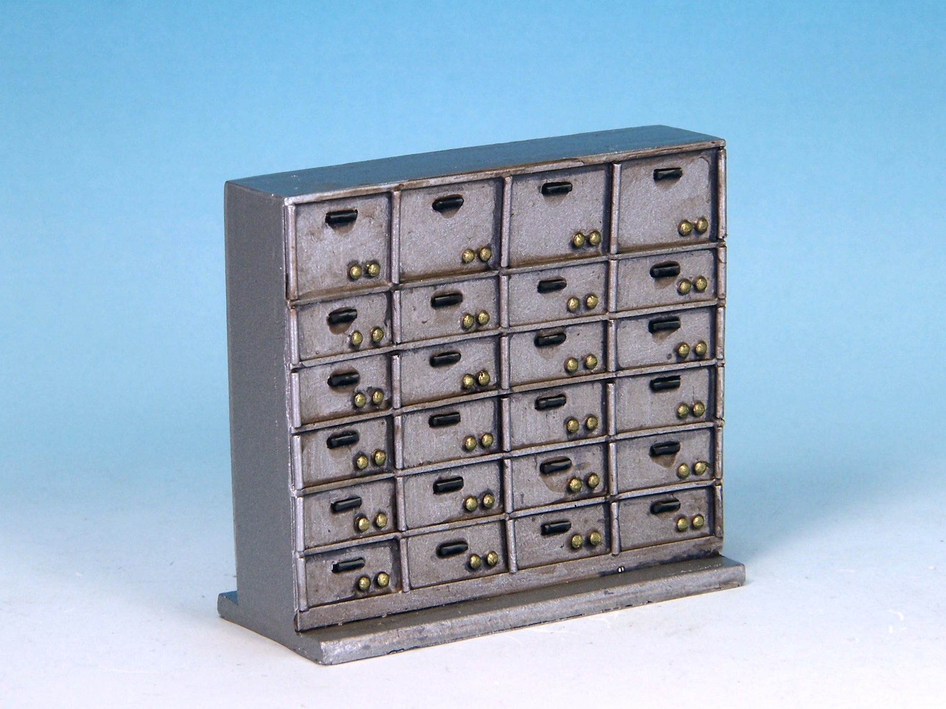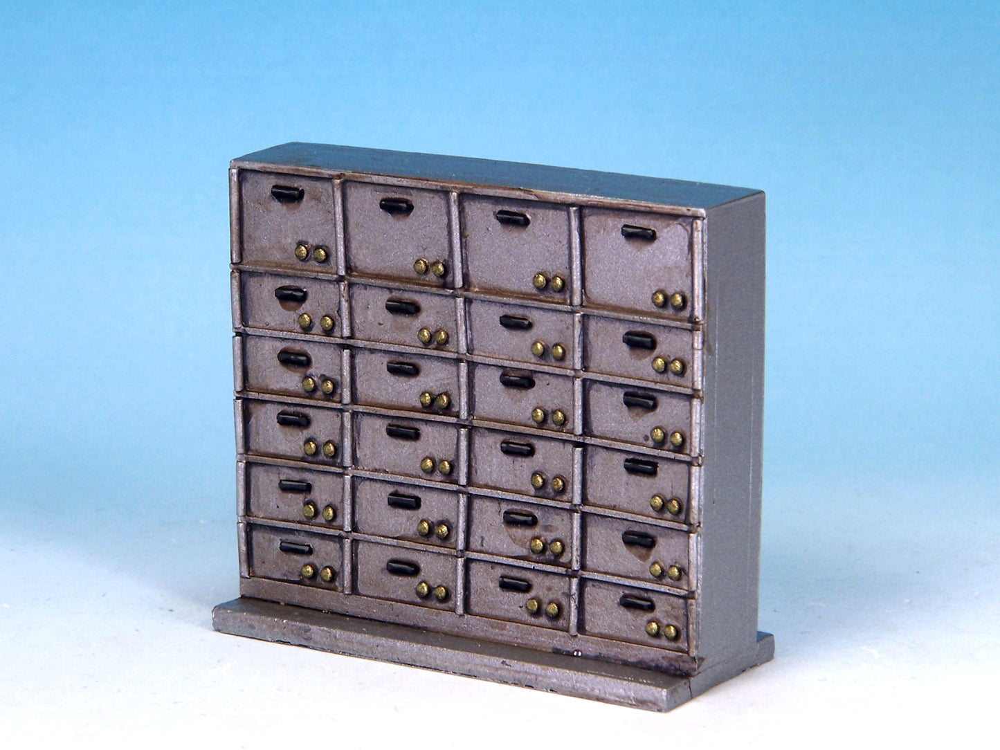 This kit contains nine pieces: vault door (three parts), safety deposit boxes, teller counter, small safe, large safe, filing cabinet and manager’s desk.