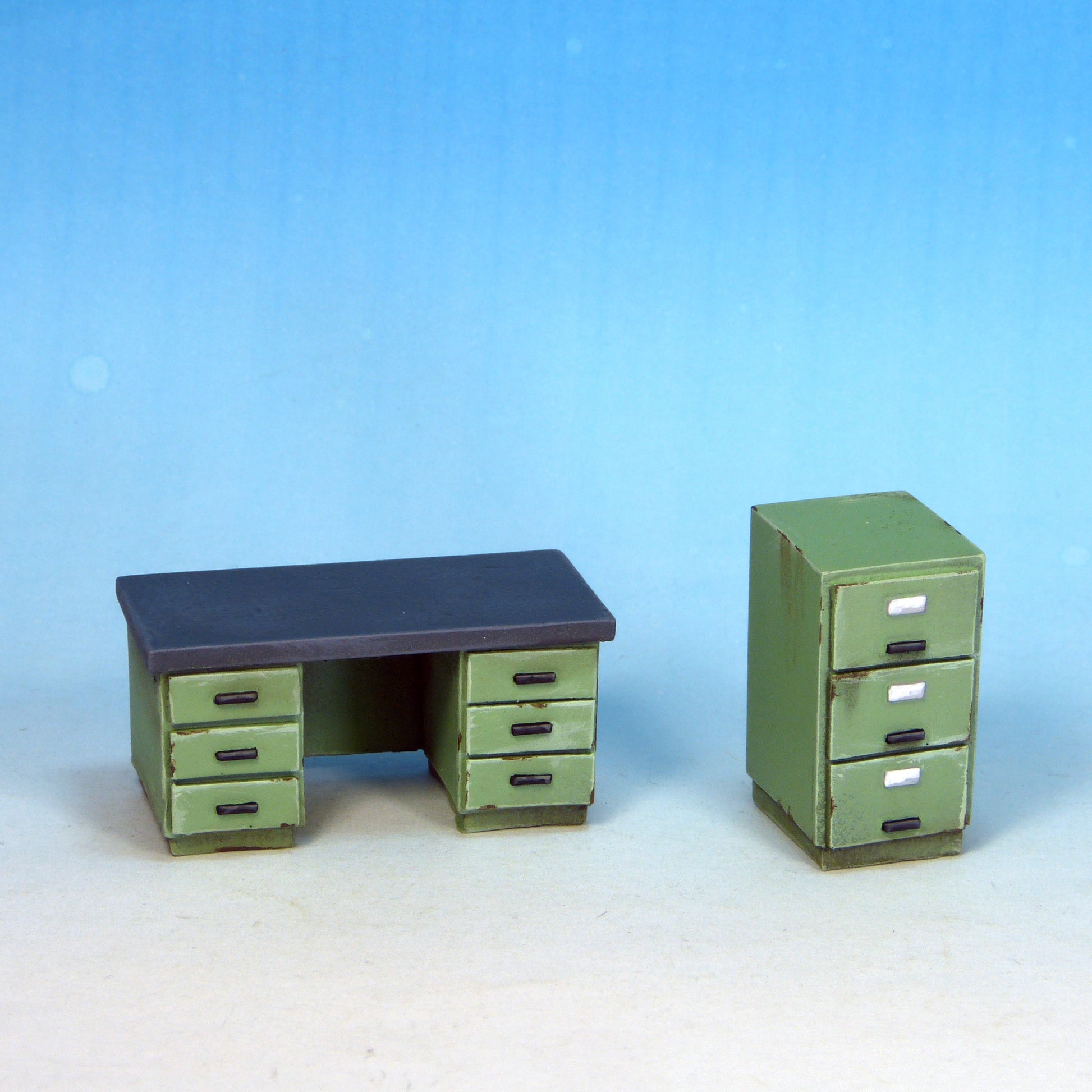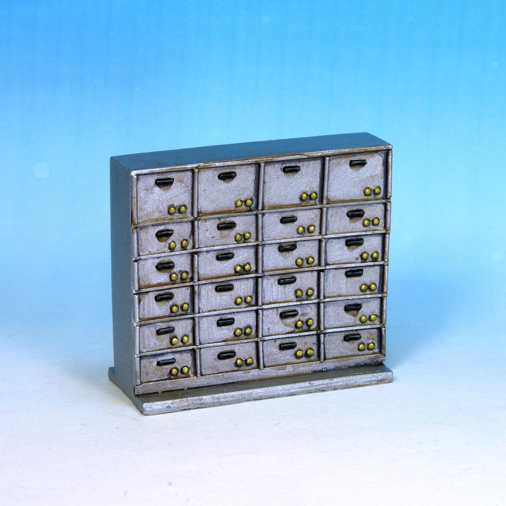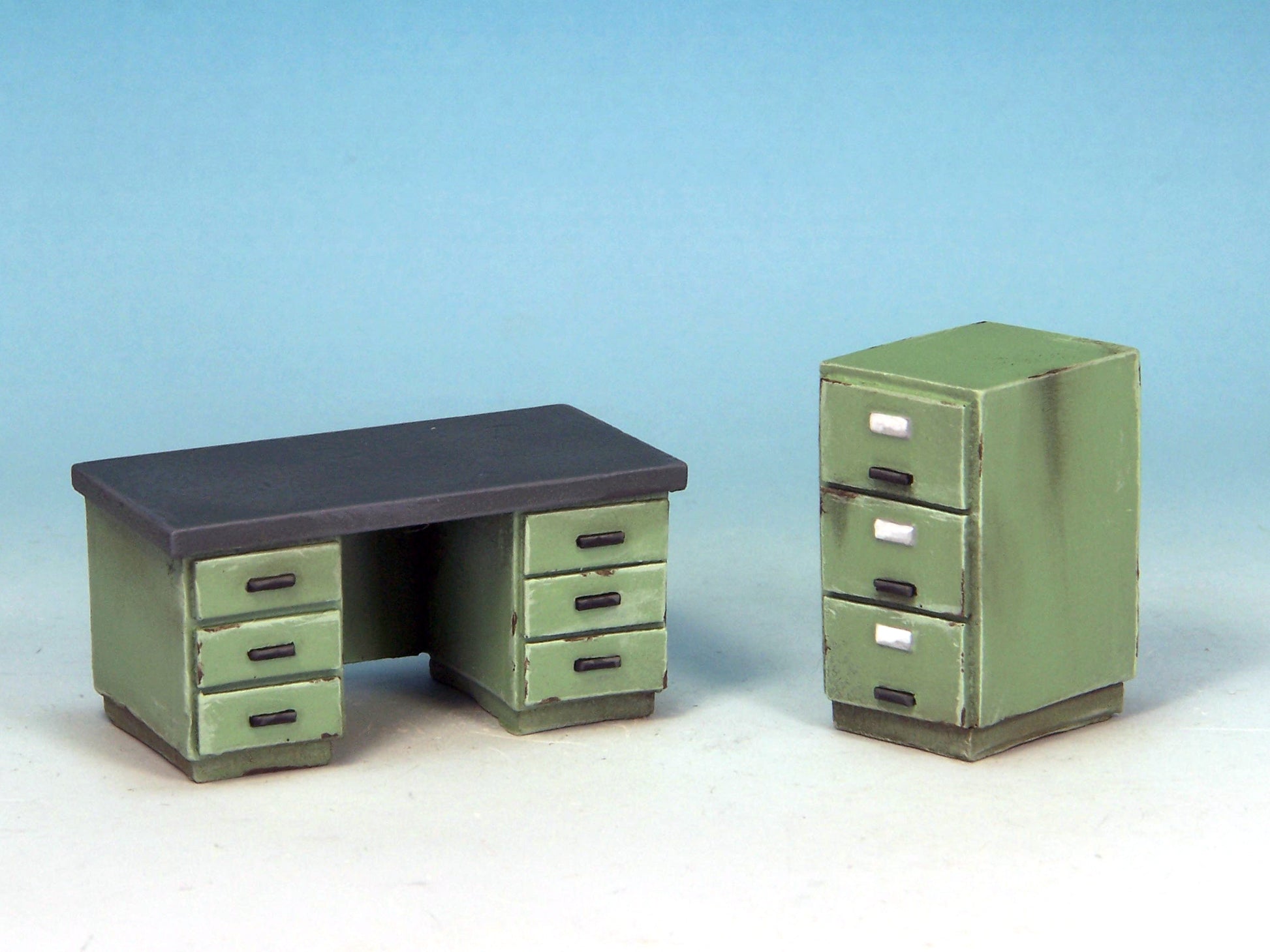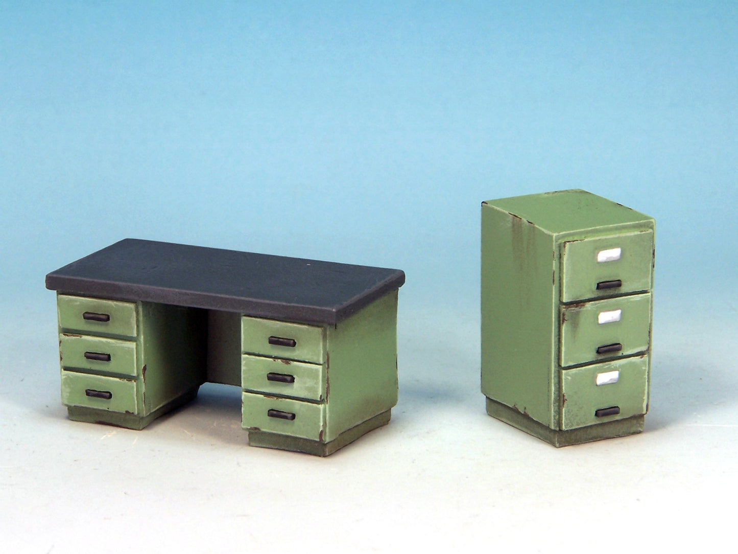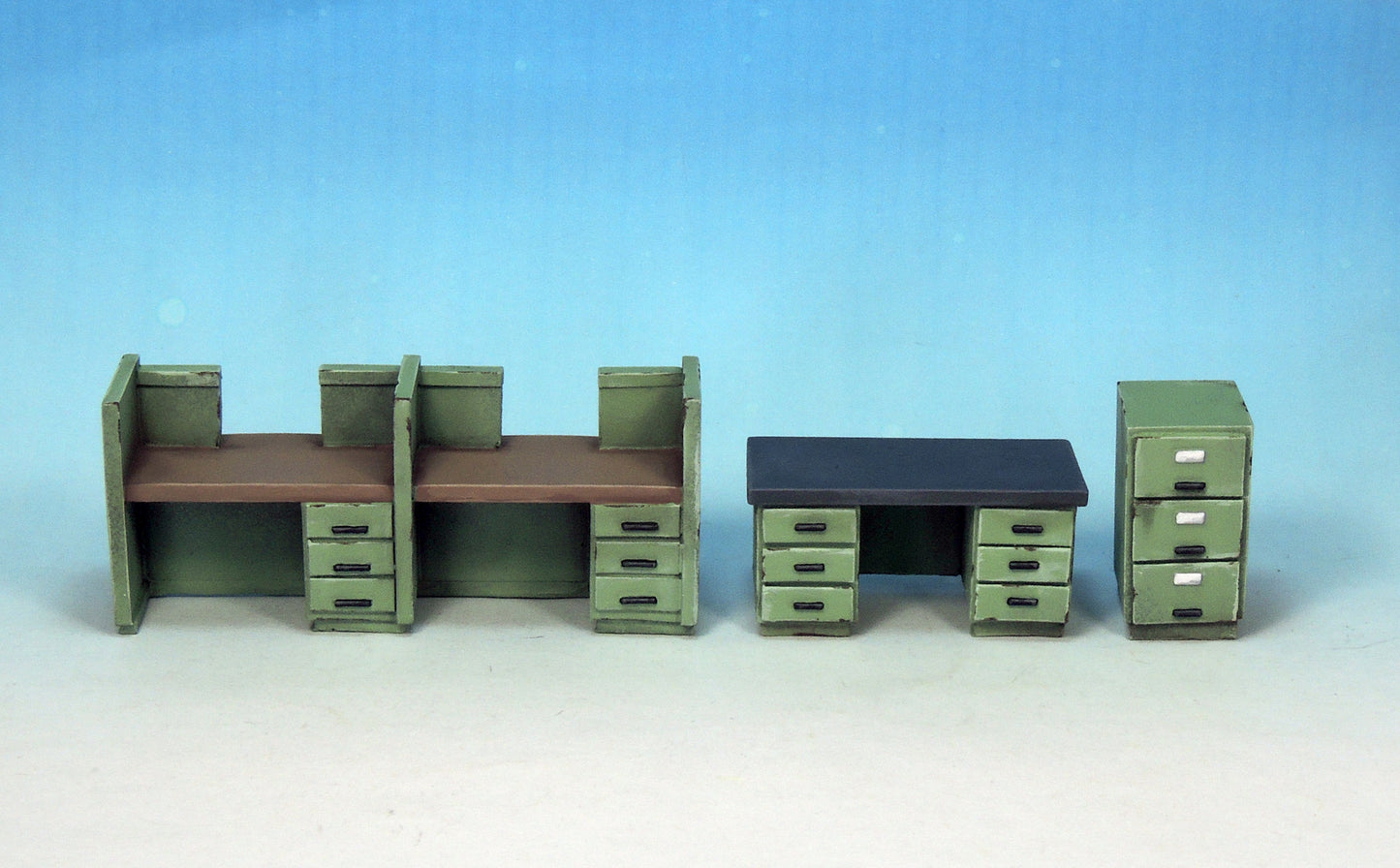 This kit contains nine pieces: vault door (three parts), safety deposit boxes, teller counter, small safe, large safe, filing cabinet and manager’s desk.
