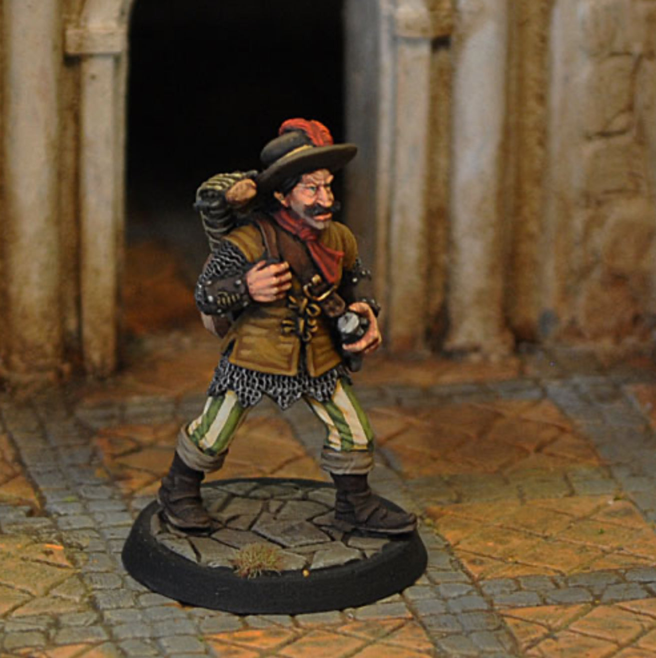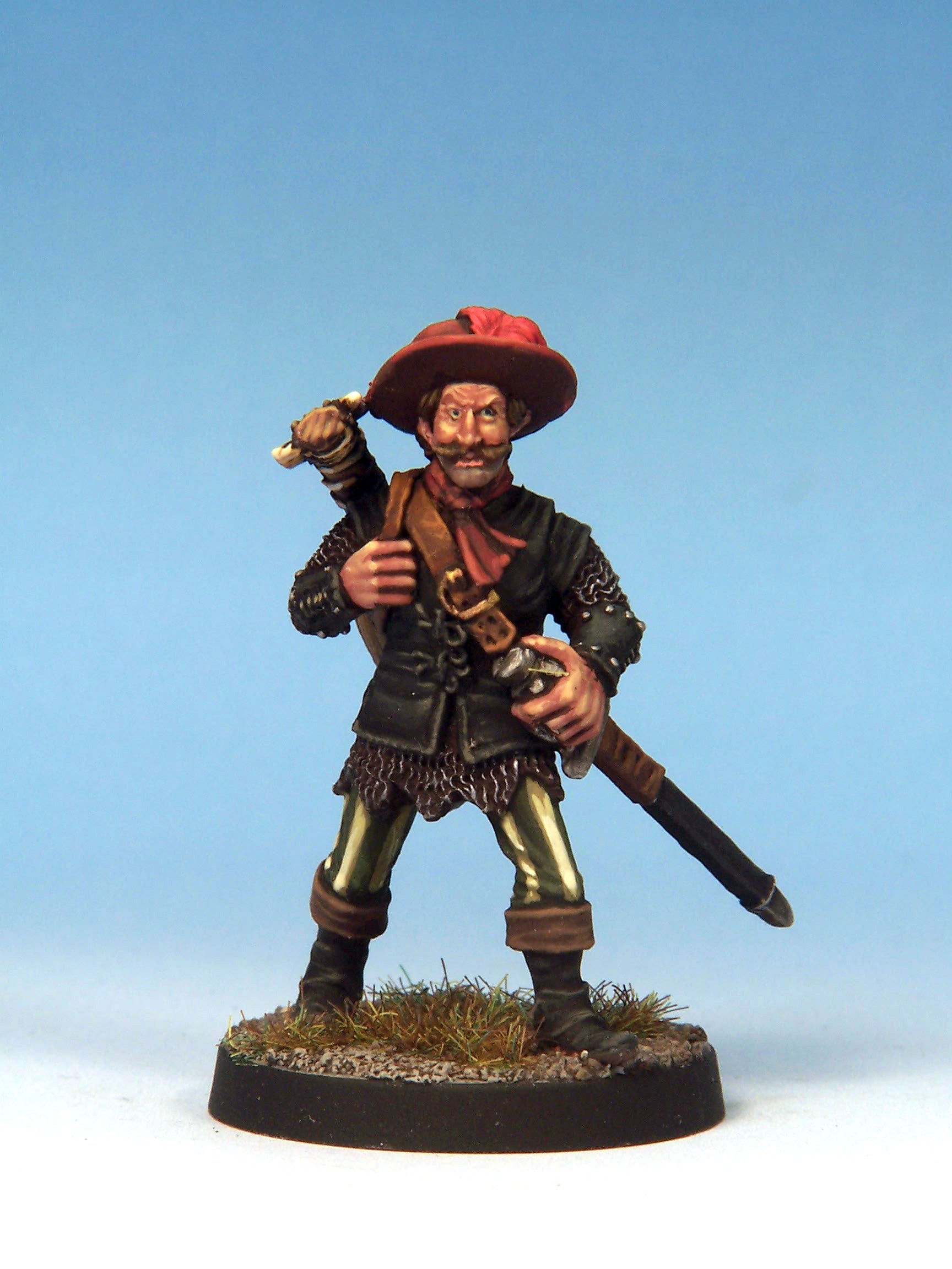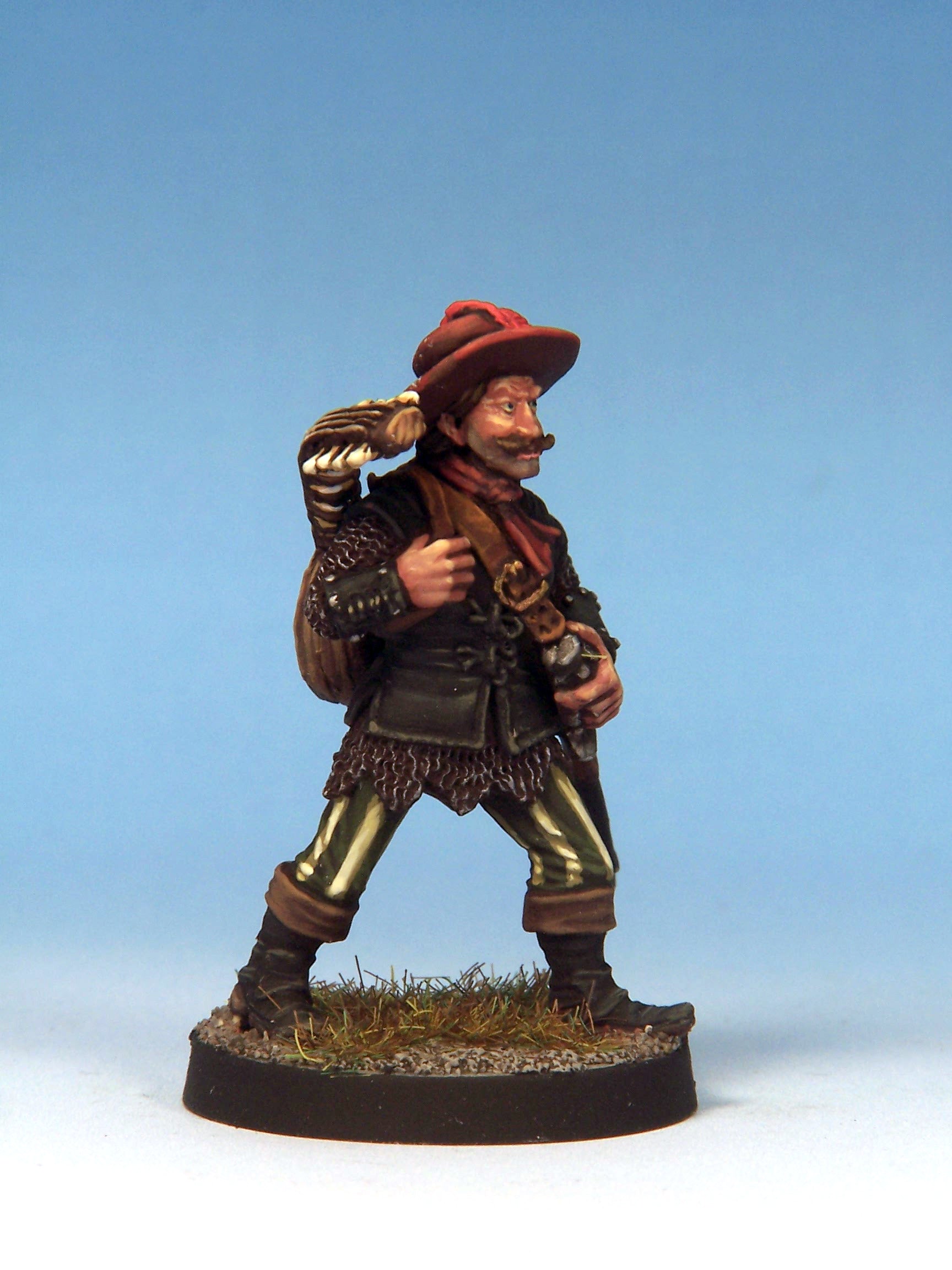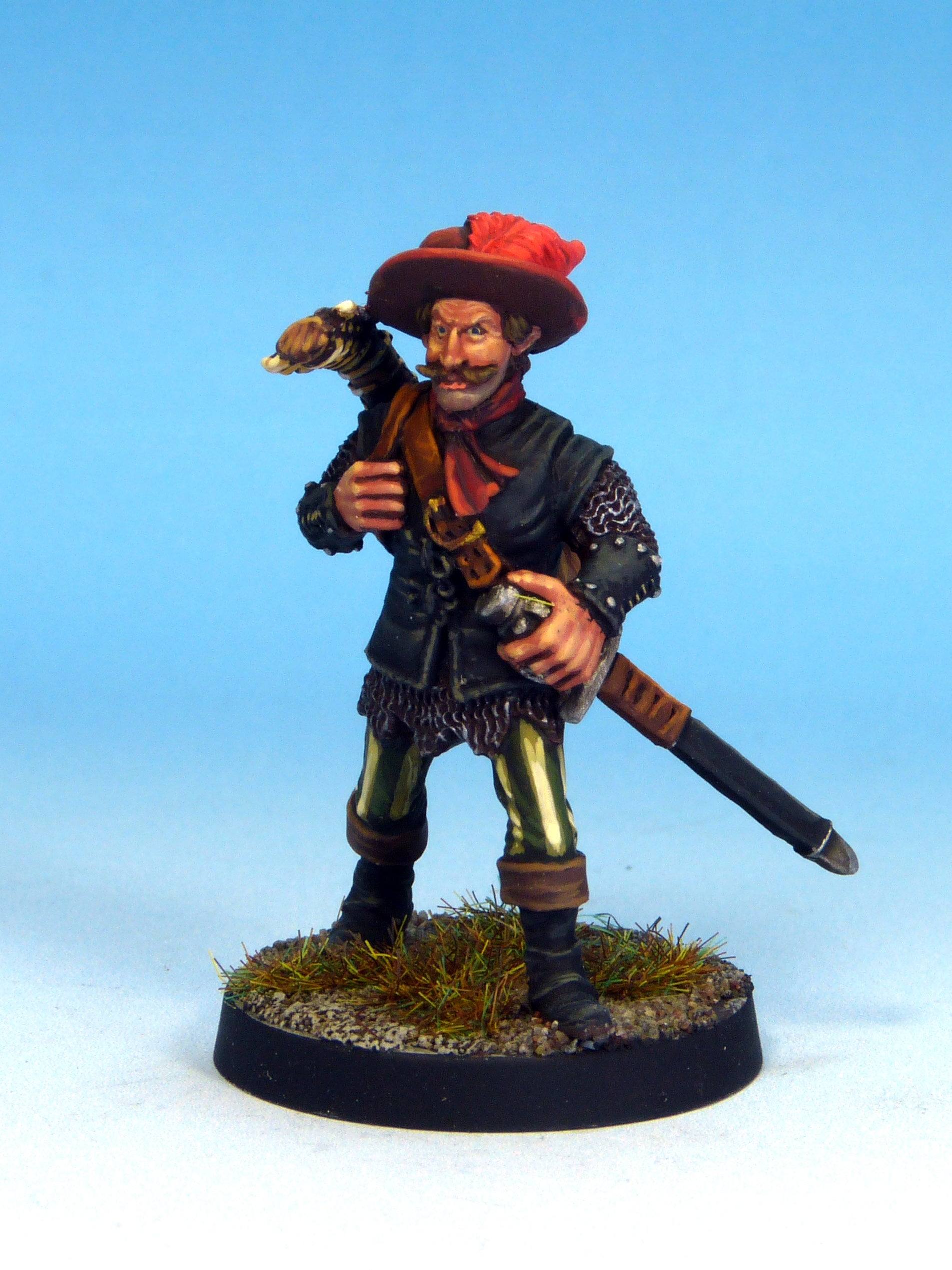 This figure represents a human male bard character wearing light chainmail under a leather jerkin, and a cavalier-style hat. He is armed with a longsword and has a lute slung over his back.