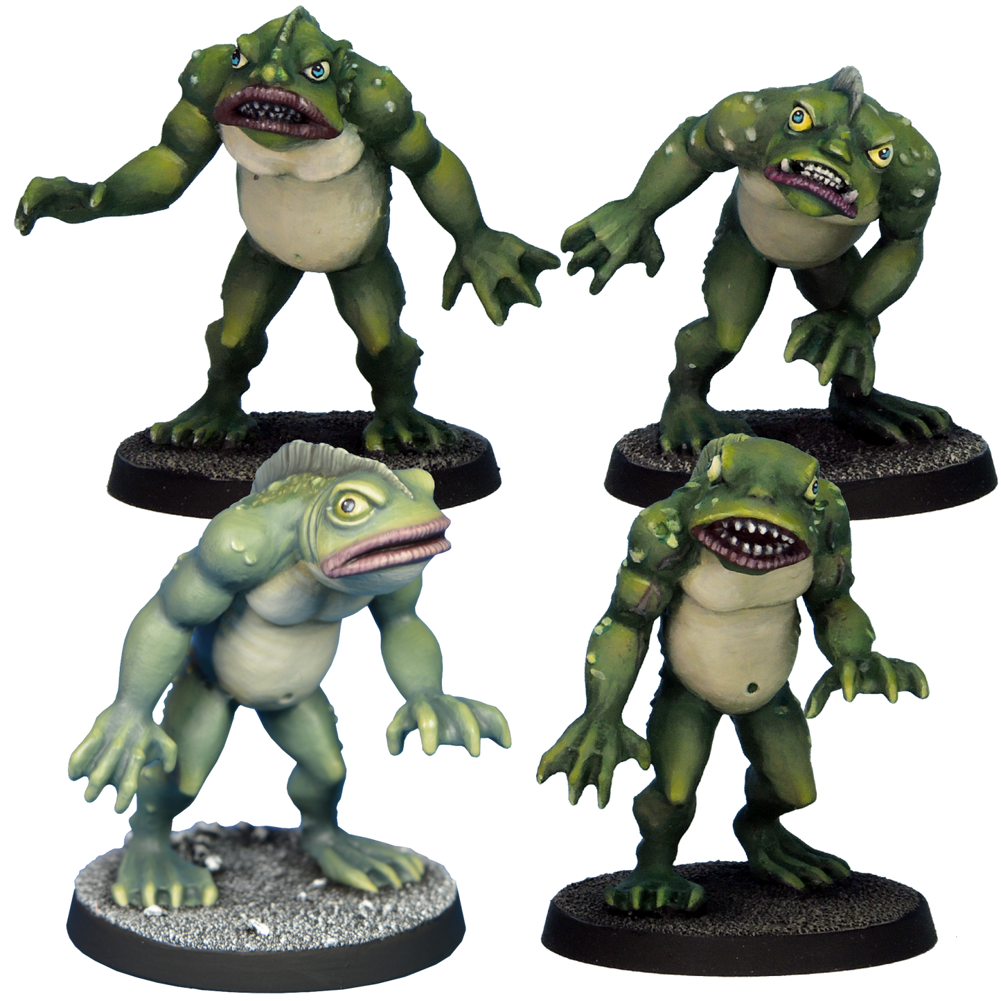 These grotesque, amphibious, bipedal horrors dwell in reefs and submarine caverns where they worship unfathomable, ancient deities. They are known to interbreed with isolated human communities to produce ghastly hybrid offspring. Their staring, unblinking eyes have a faint luminosity and their necks are ridged with palpitating gills.