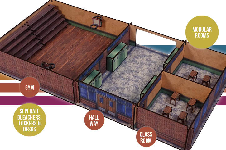 Build your small town with these full colour MDF buildings designed by Sarissa Precision. This bundle includes these modular kits that provide options for assembling your high school in lots of different layouts: