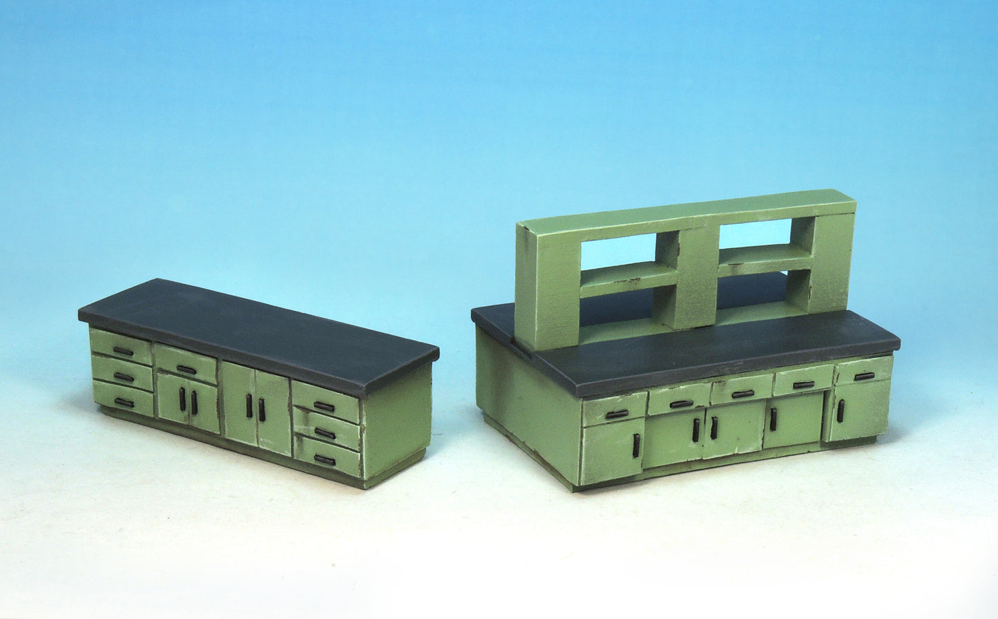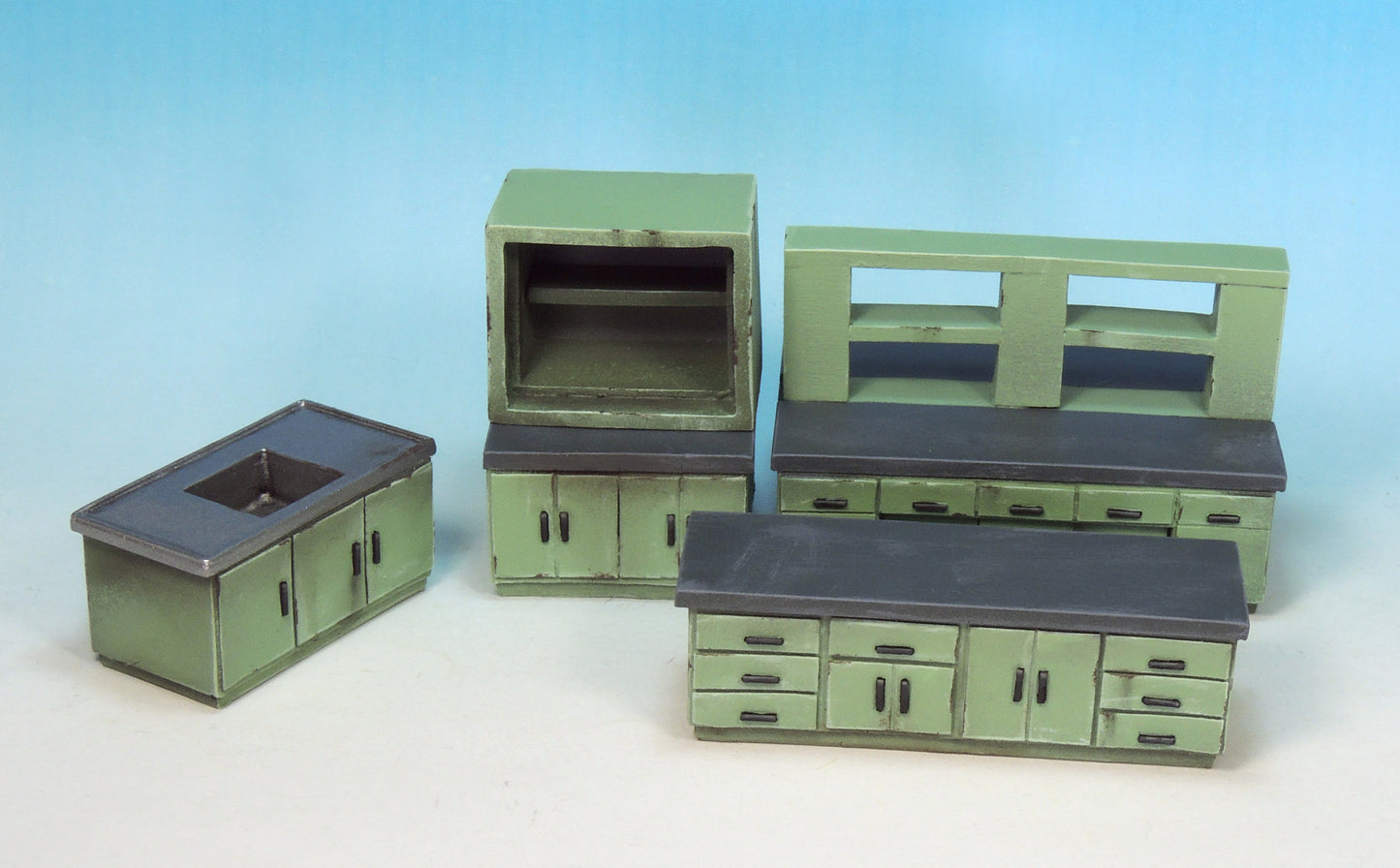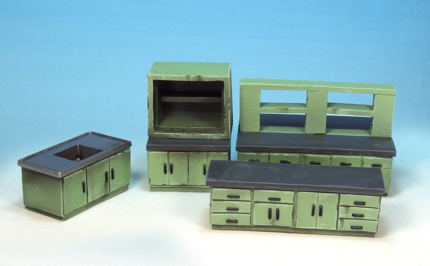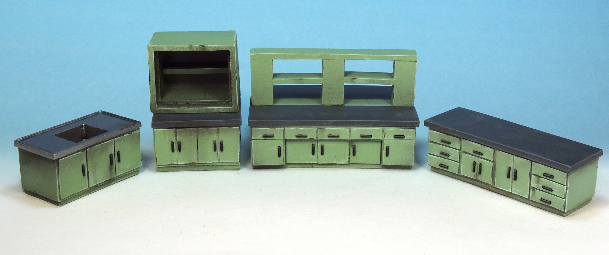 This kit contains six pieces: single sink unit, double sink unit, large cabinet, workbench, monitoring unit and examination bed (two parts).