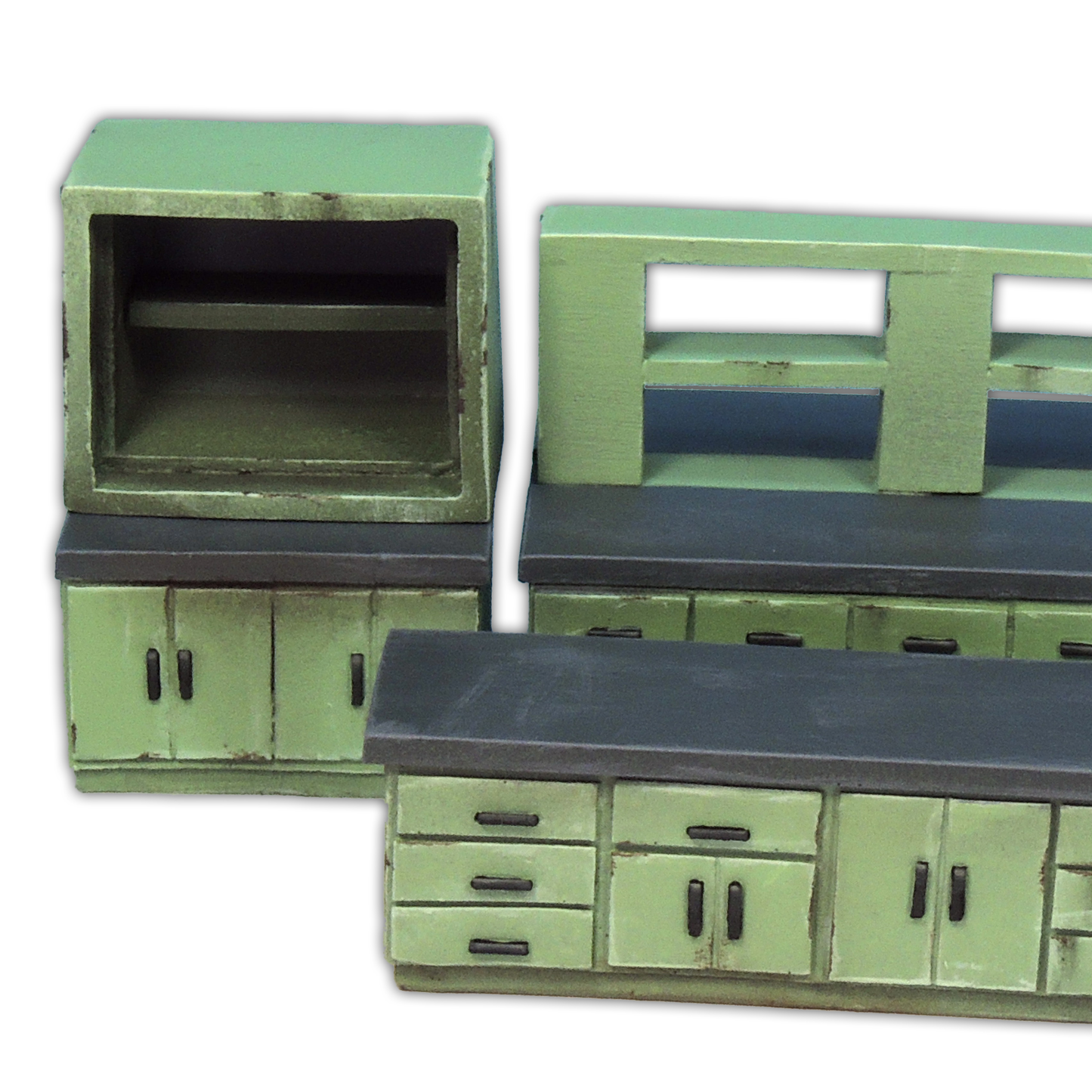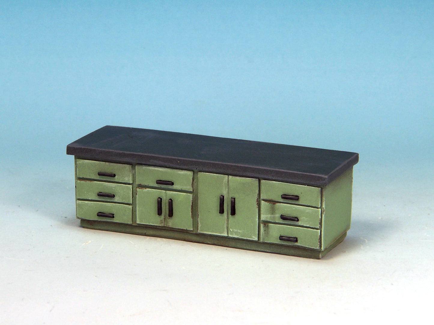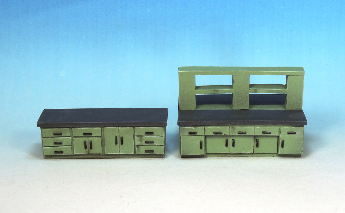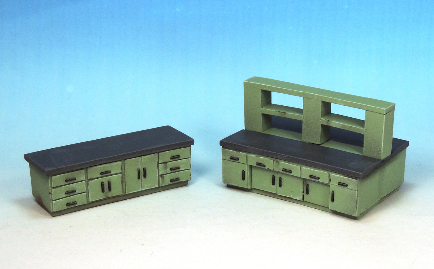 This kit contains six pieces: single sink unit, double sink unit, large cabinet, workbench, monitoring unit and examination bed (two parts).