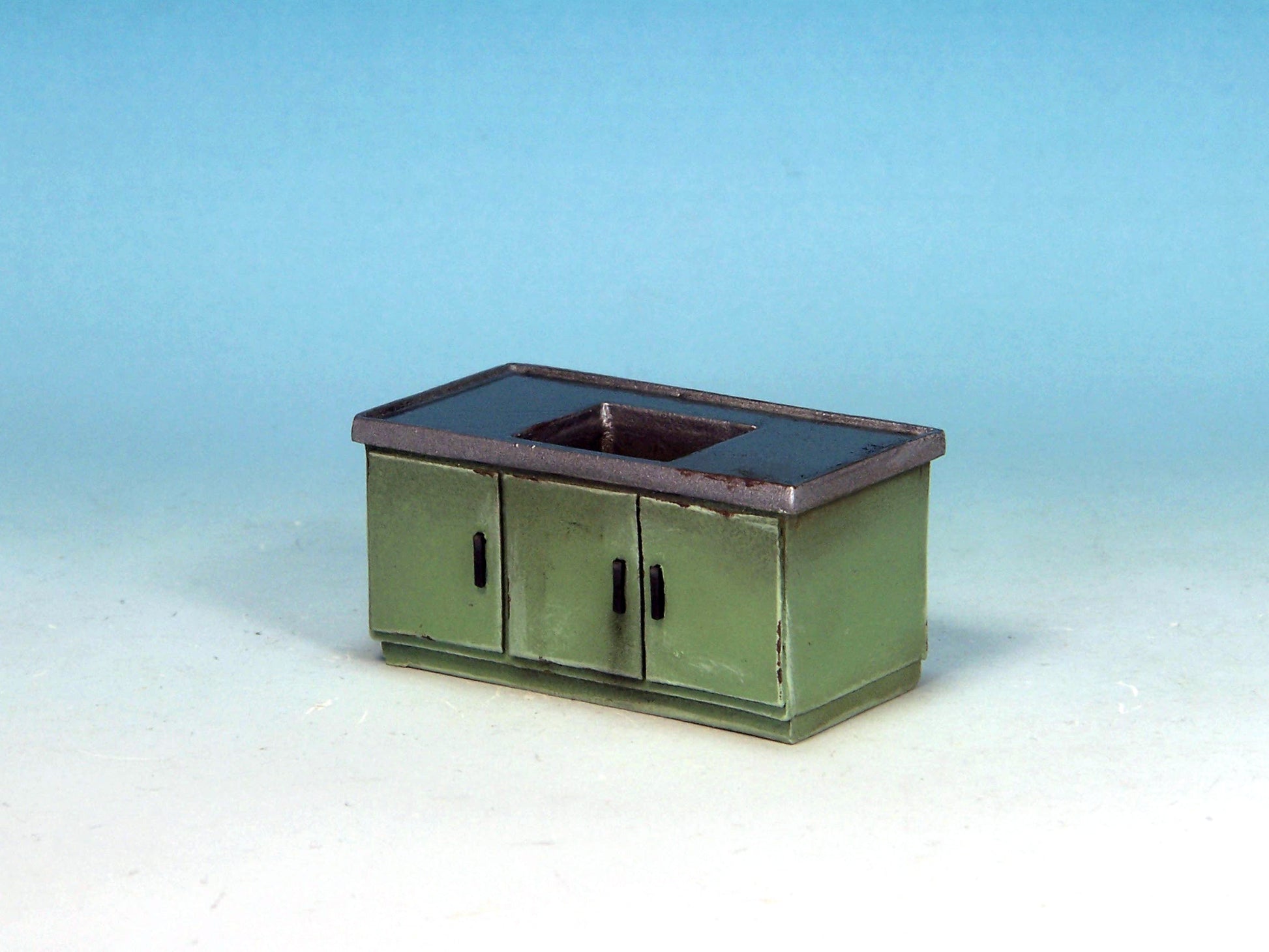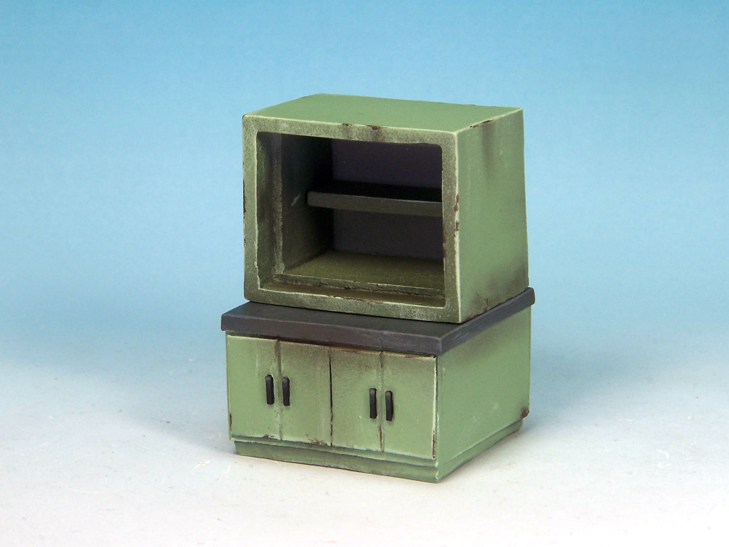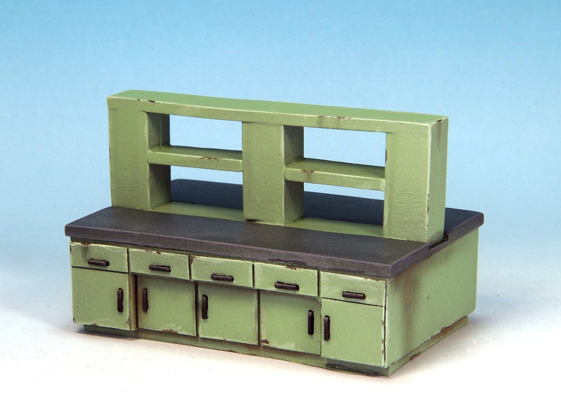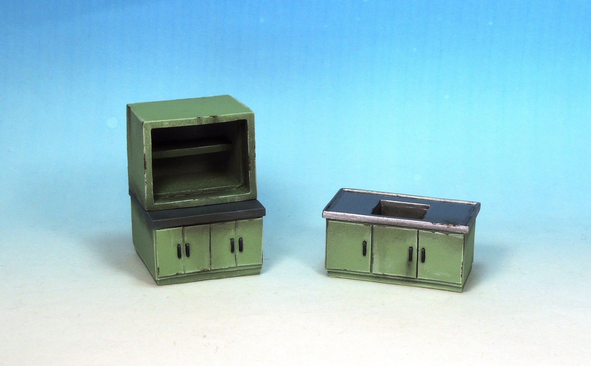 This kit contains six pieces: single sink unit, double sink unit, large cabinet, workbench, monitoring unit and examination bed (two parts).