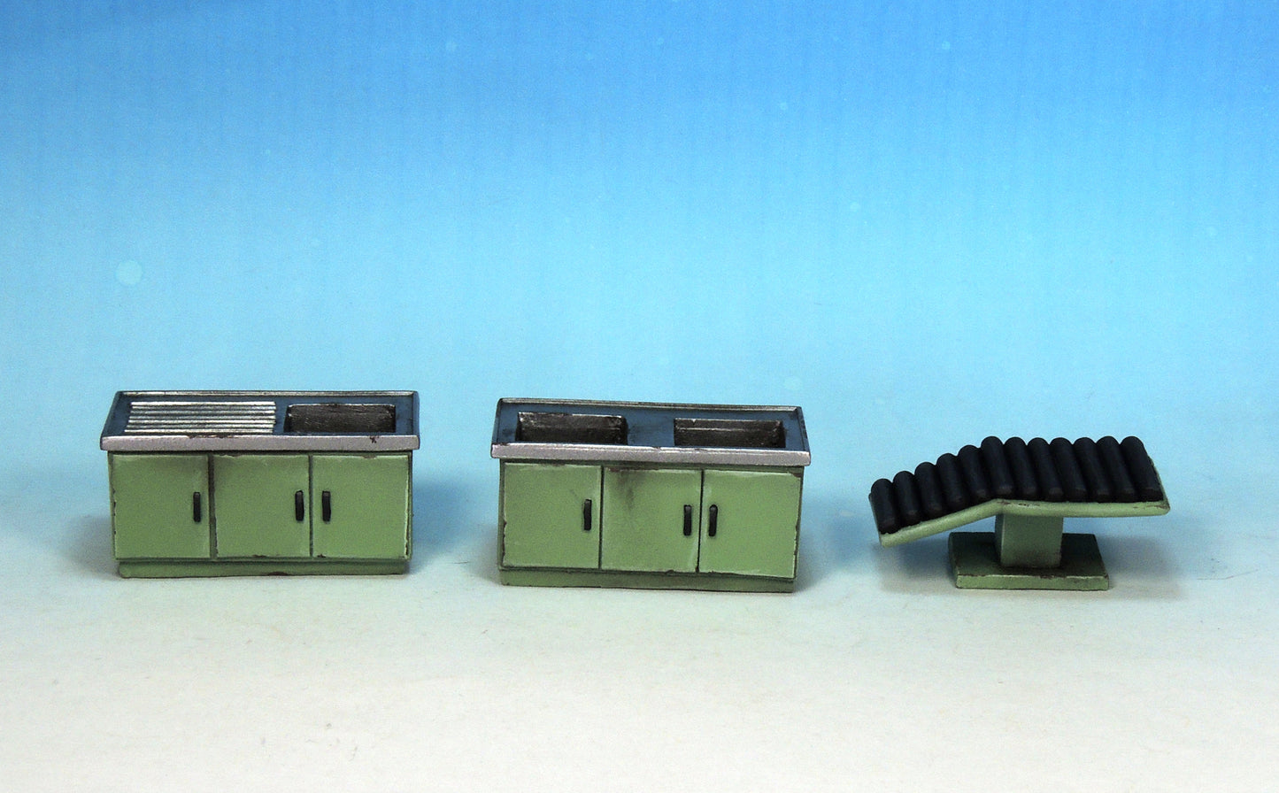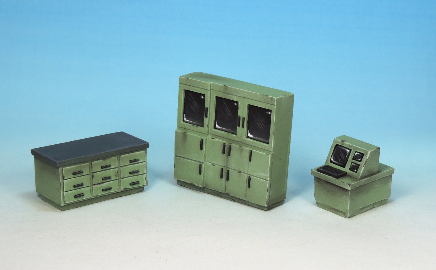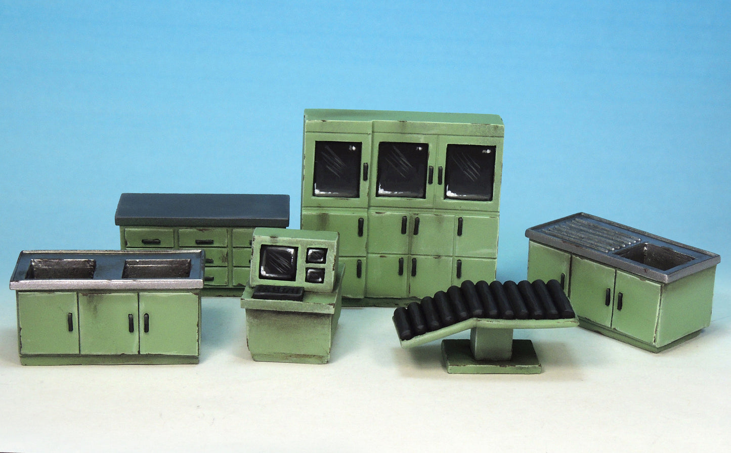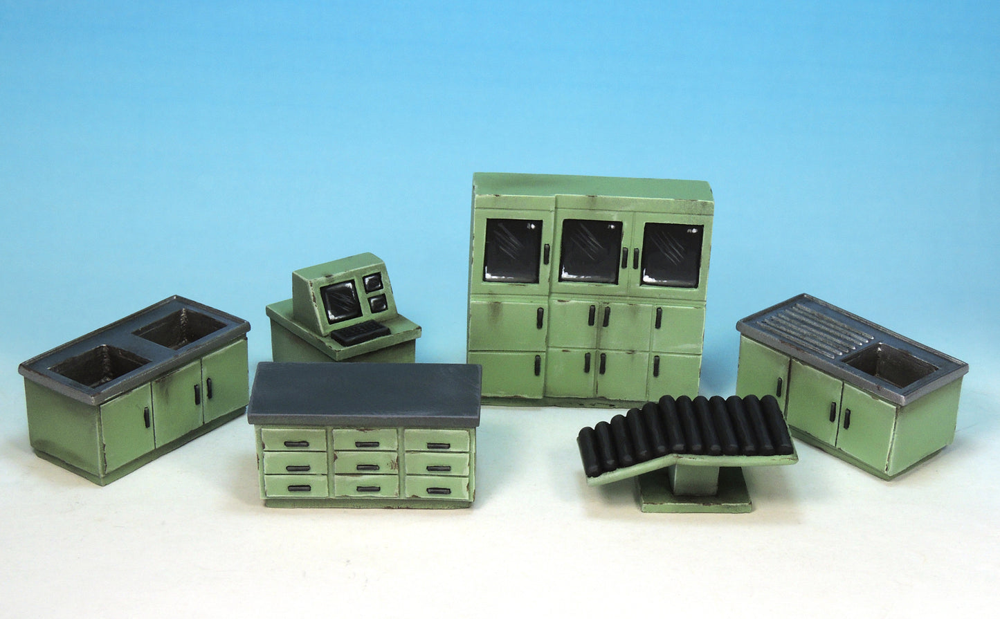 This kit contains six pieces: single sink unit, double sink unit, large cabinet, workbench, monitoring unit and examination bed (two parts).