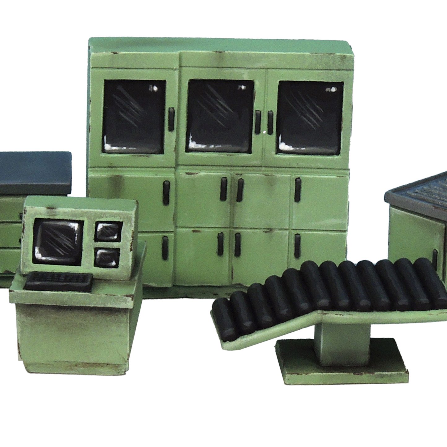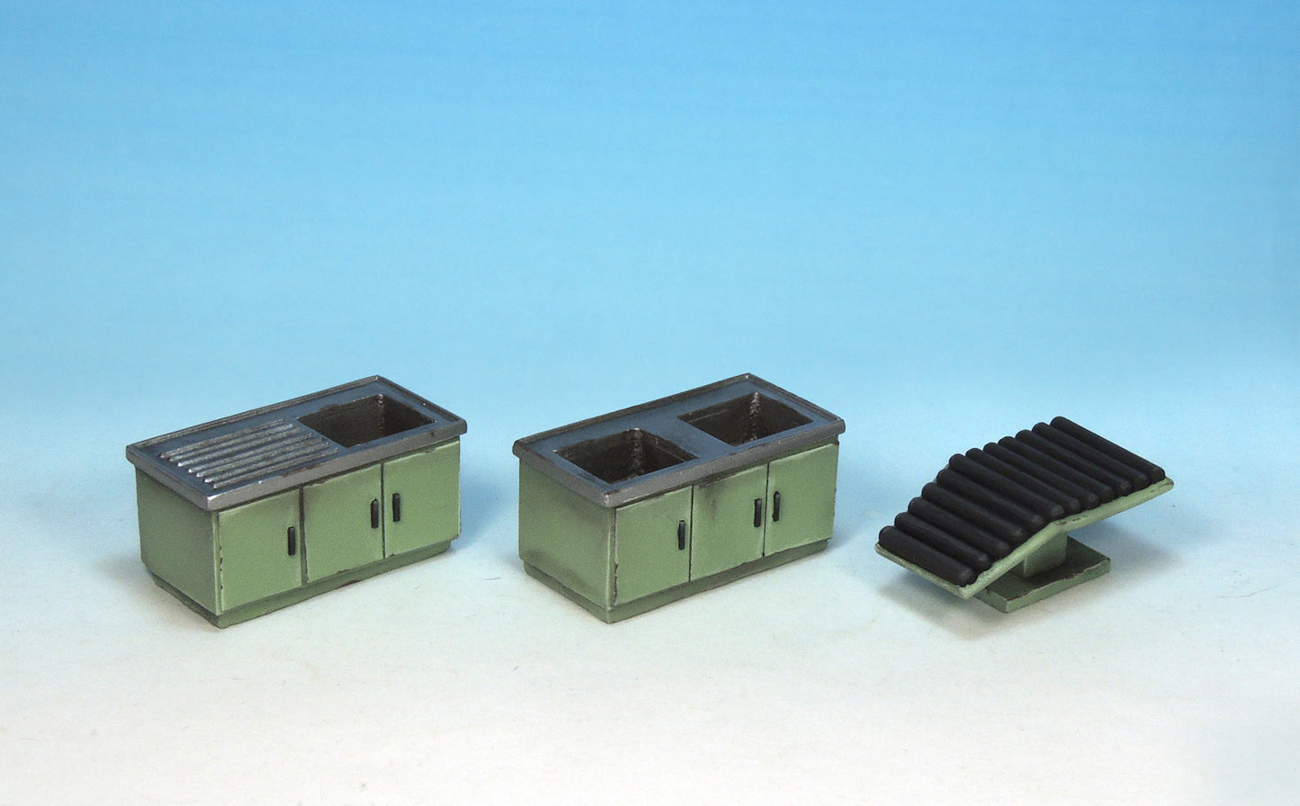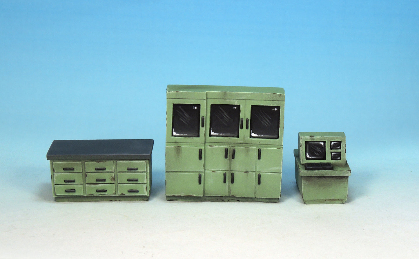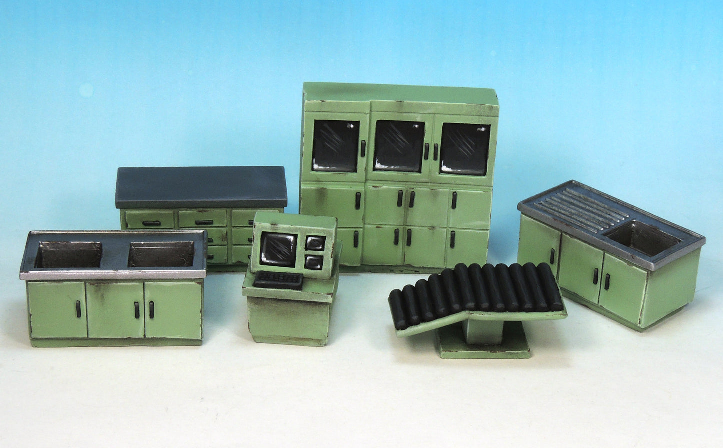 This kit contains six pieces: single sink unit, double sink unit, large cabinet, workbench, monitoring unit and examination bed (two parts).