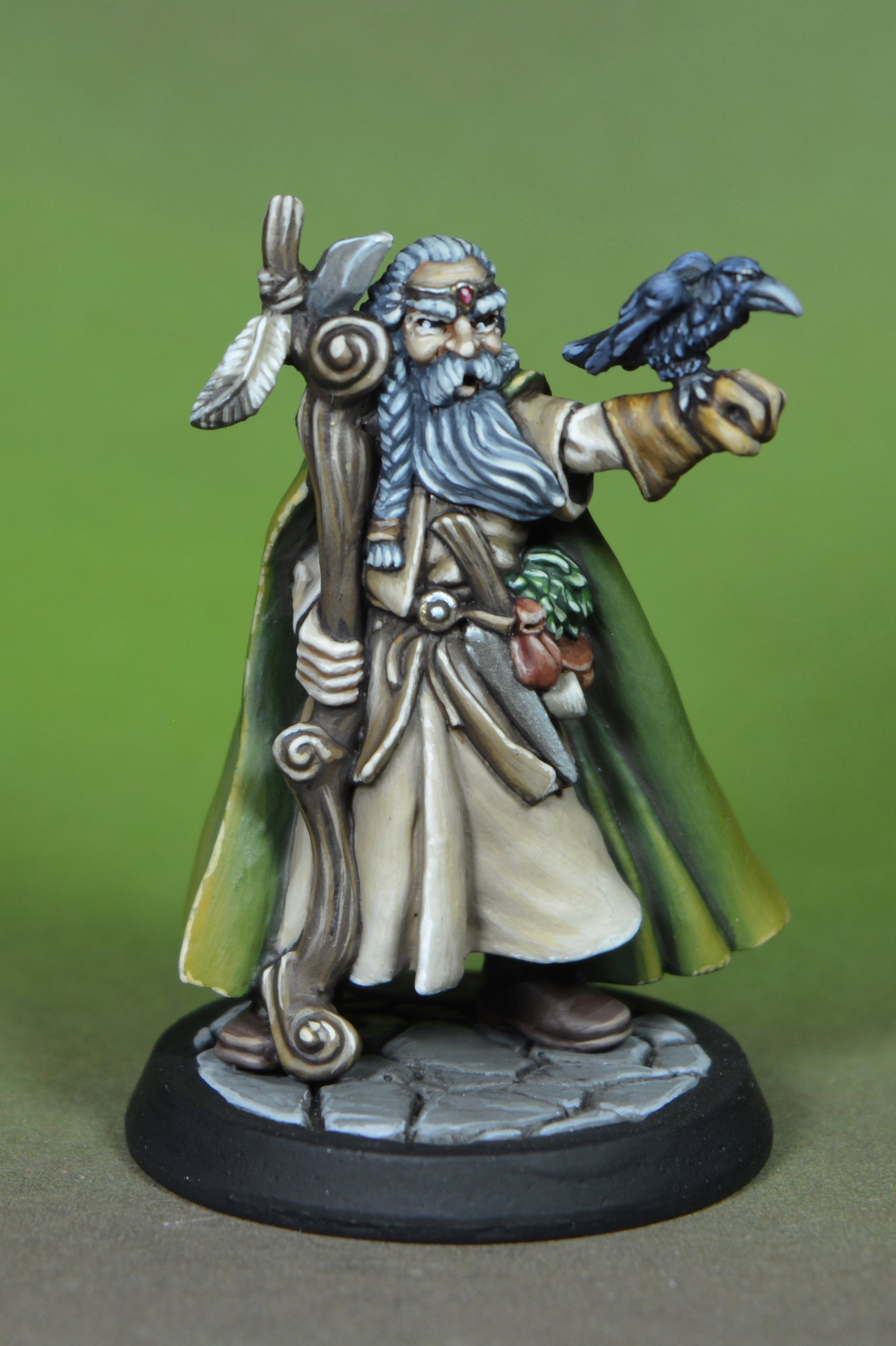 This crazy old druid, is commonly found dwelling in secluded groves in rural areas. This character wears simple robes and a cloak, and he carries an ancient, gnarled wooden staff. His raven familiar perches on his outstretched left hand. It is a single-piece casting which requires no assembly.