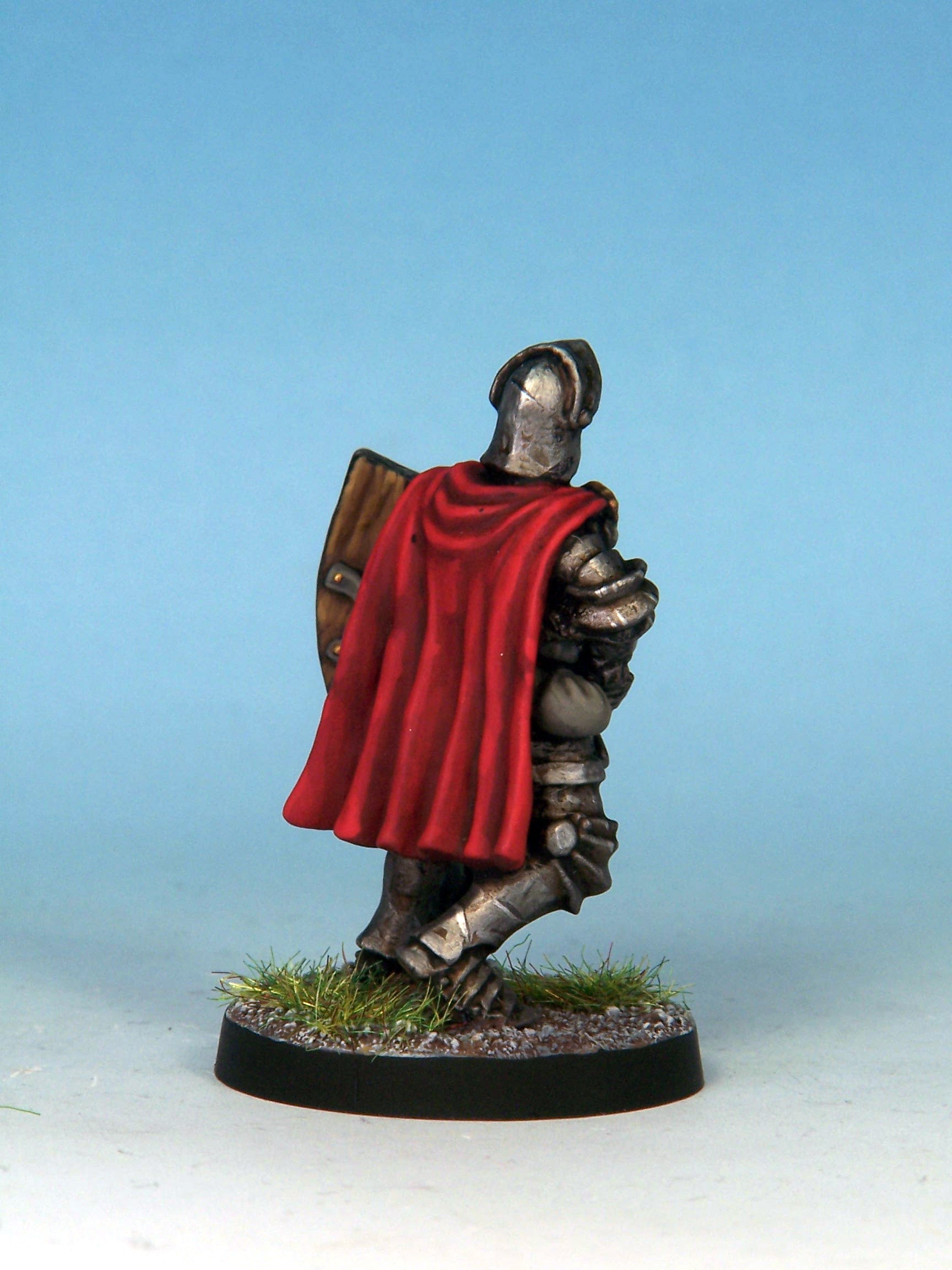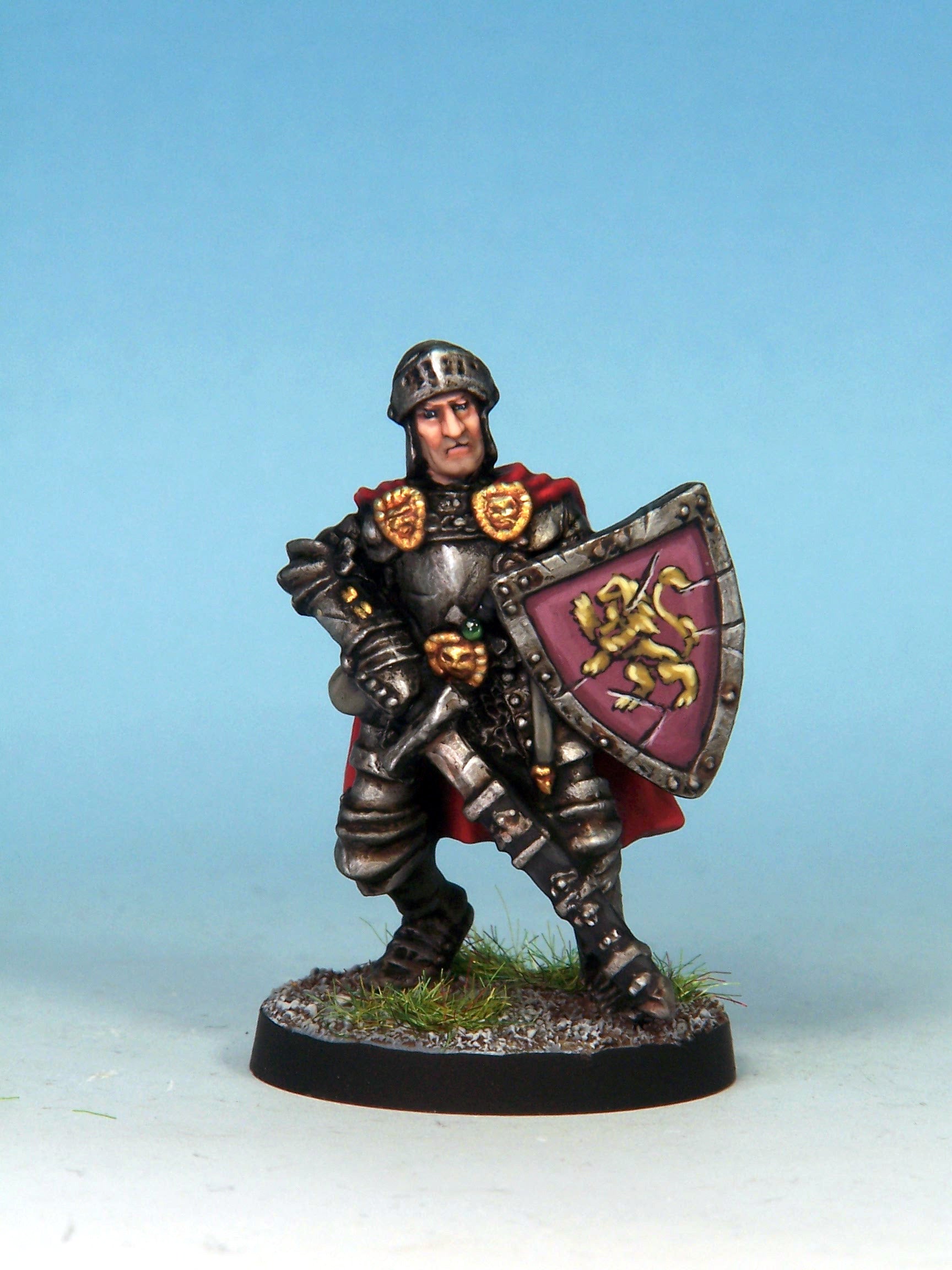 This human male paladin character wears full plate armour and open-faced helm. He is armed with a longsword and heater shield. It is a multi-part casting (2 pieces) which requires assembly.