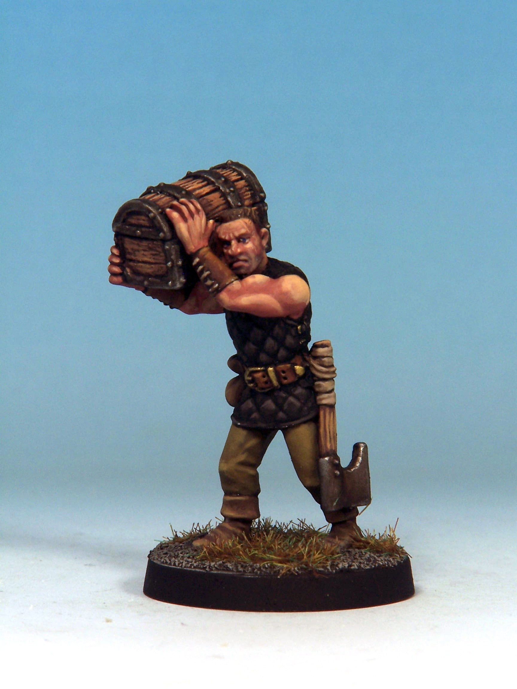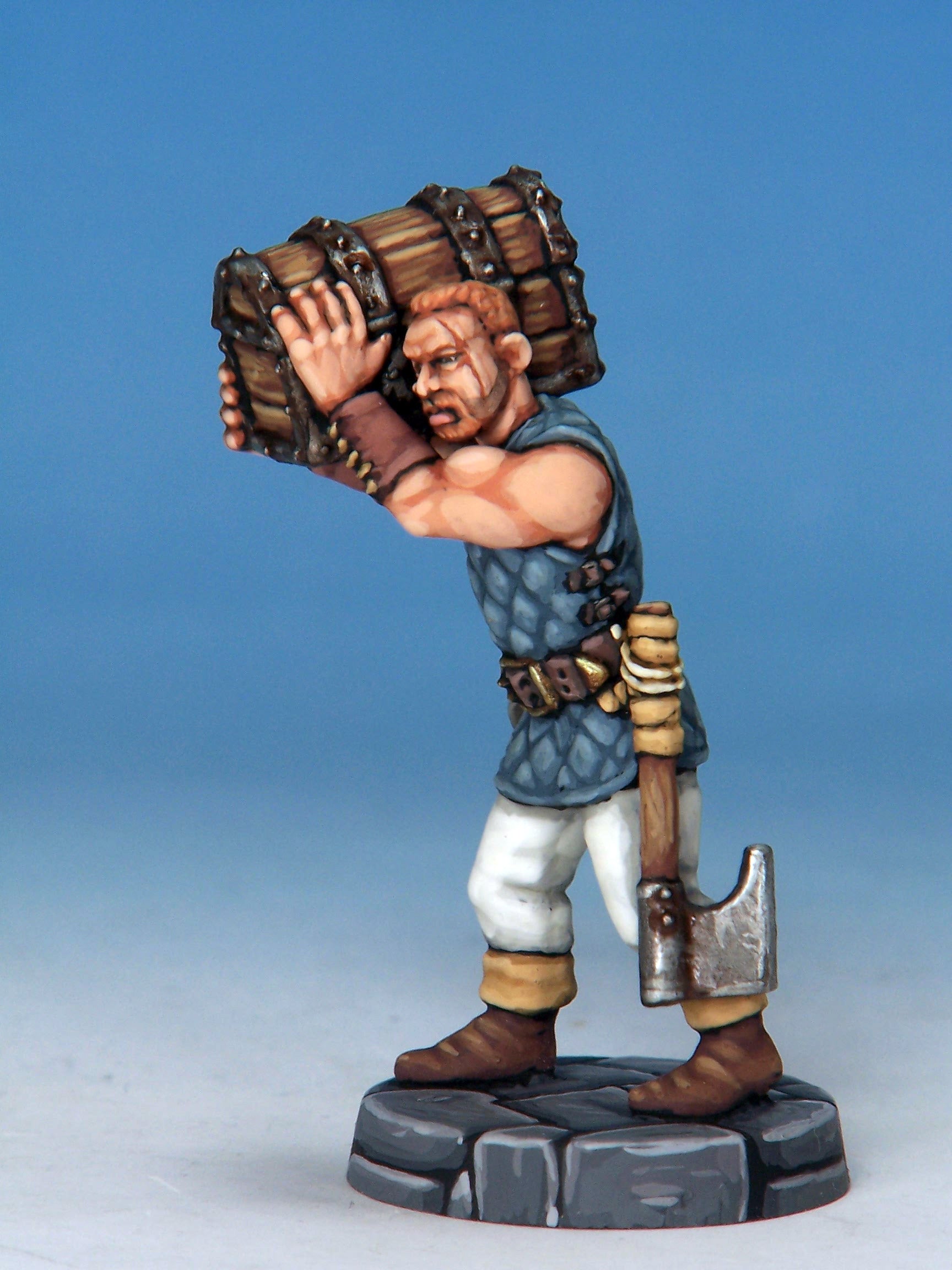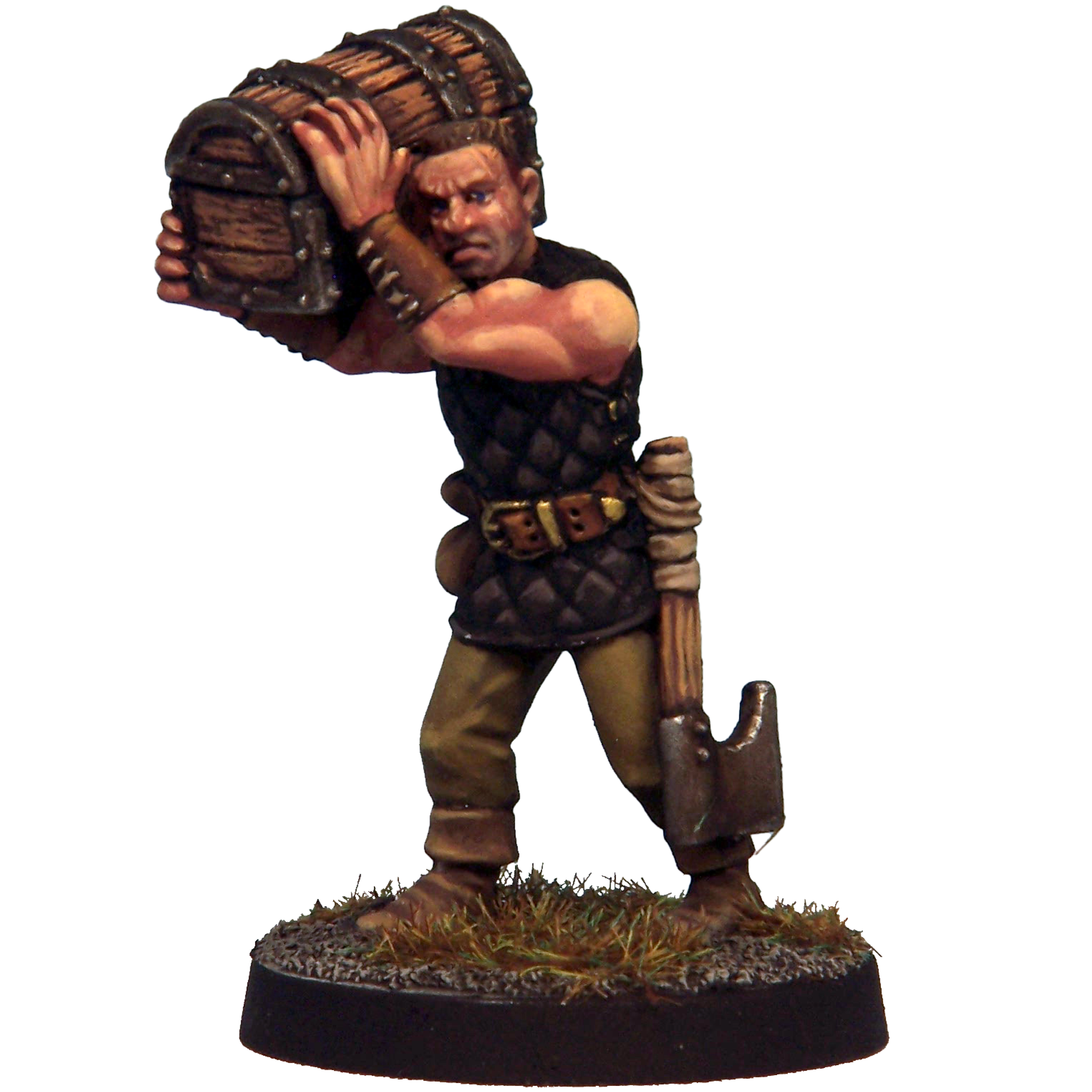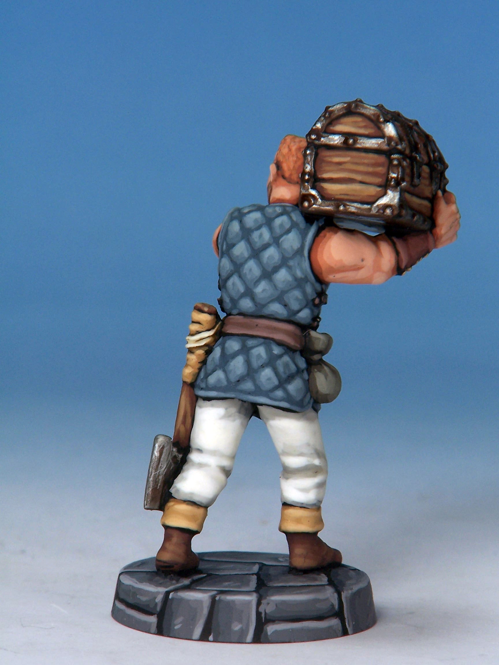 This brawny fellow wears a quilted leather jerkin, and is armed with a battle-axe. He carries a small chest over his shoulder. It is a single-piece casting which requires no assembly.