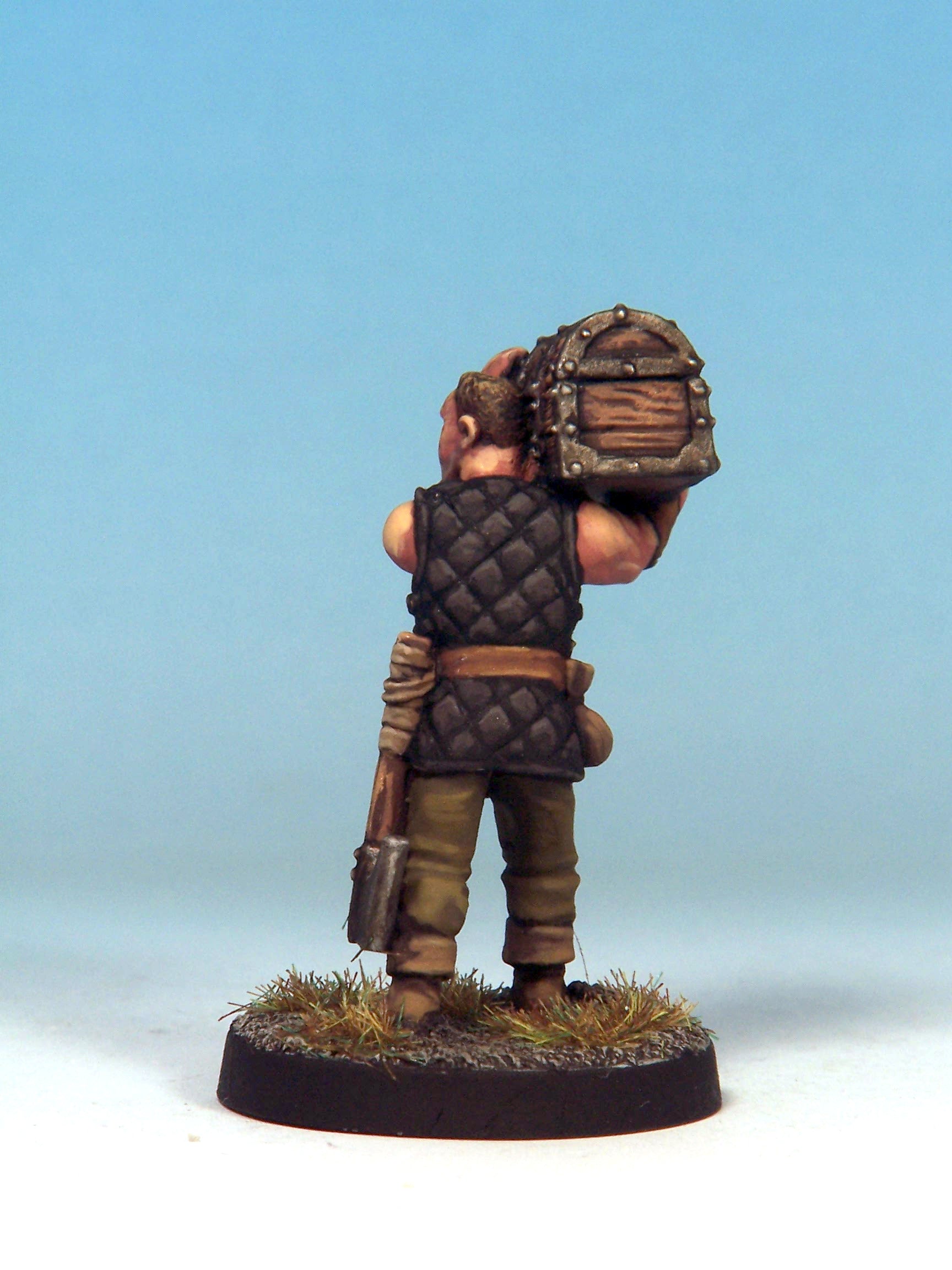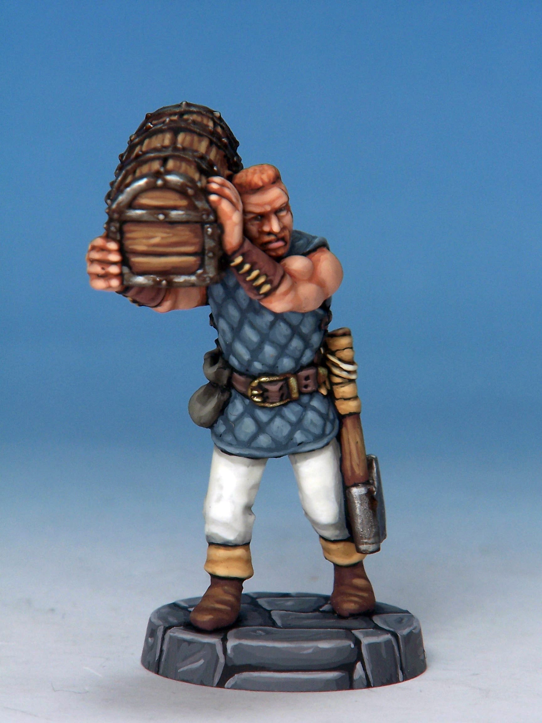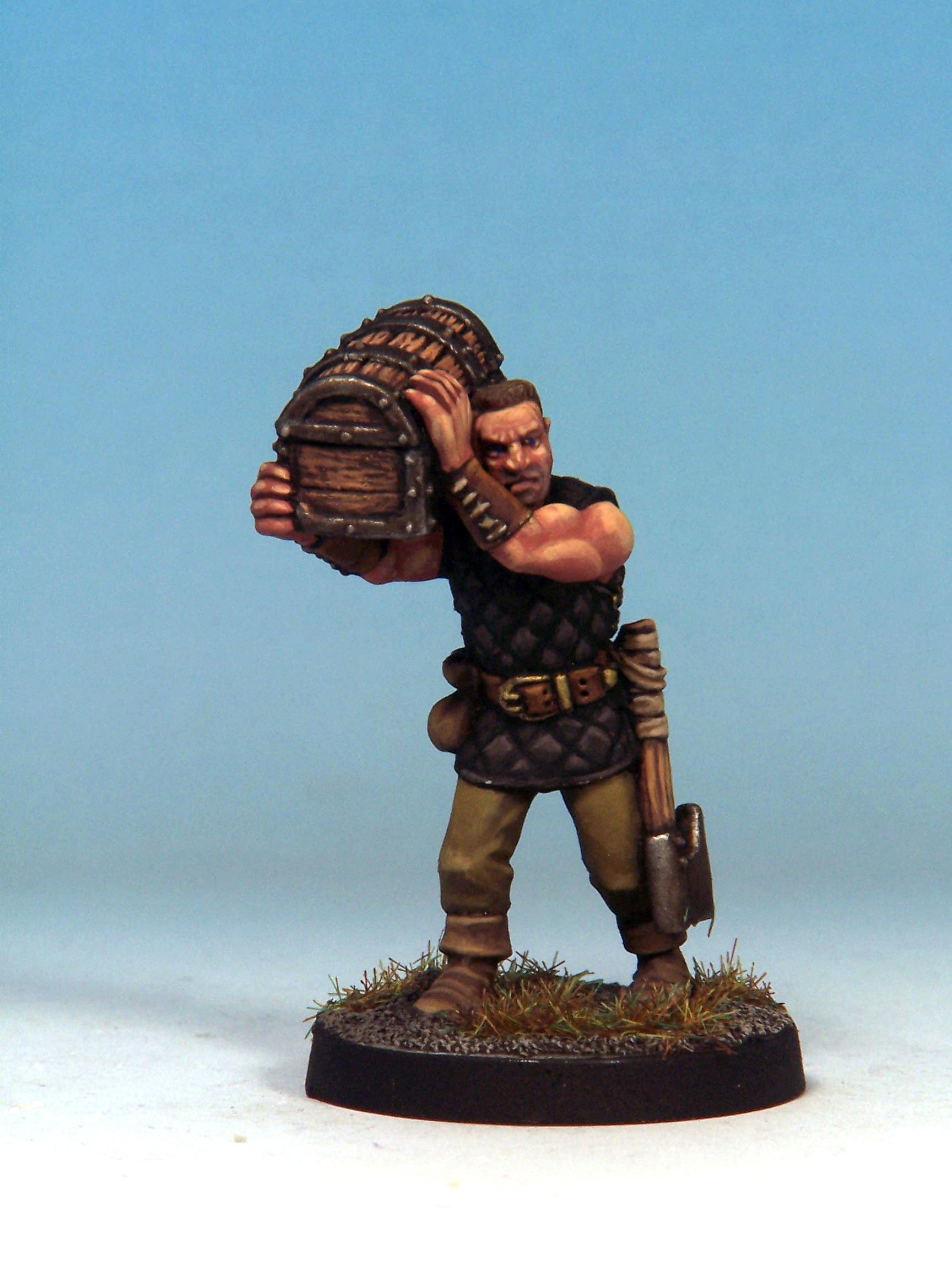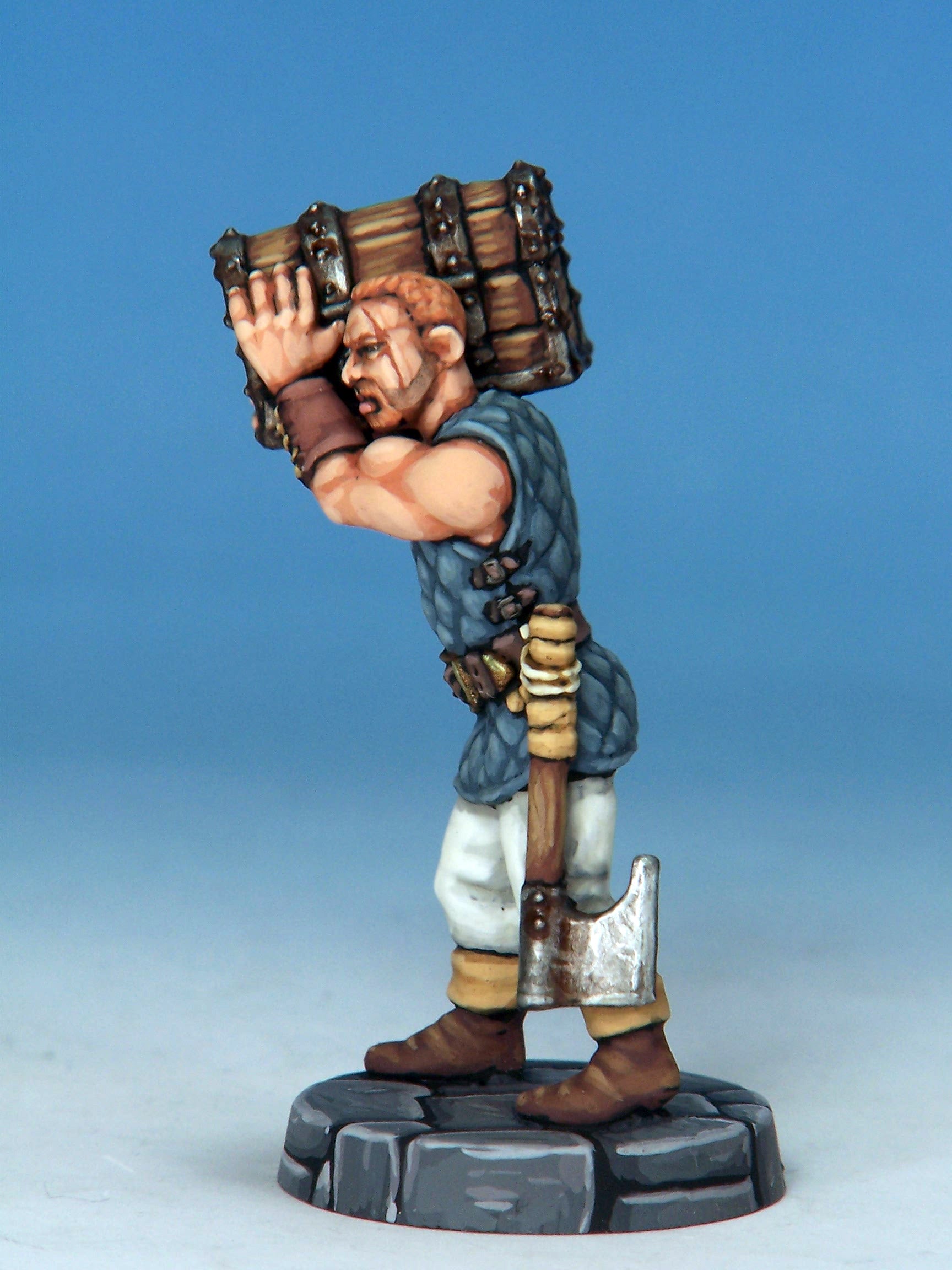 This brawny fellow wears a quilted leather jerkin, and is armed with a battle-axe. He carries a small chest over his shoulder. It is a single-piece casting which requires no assembly.