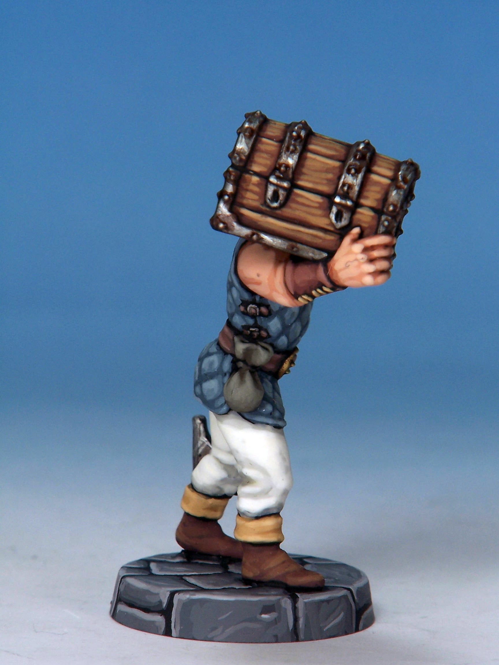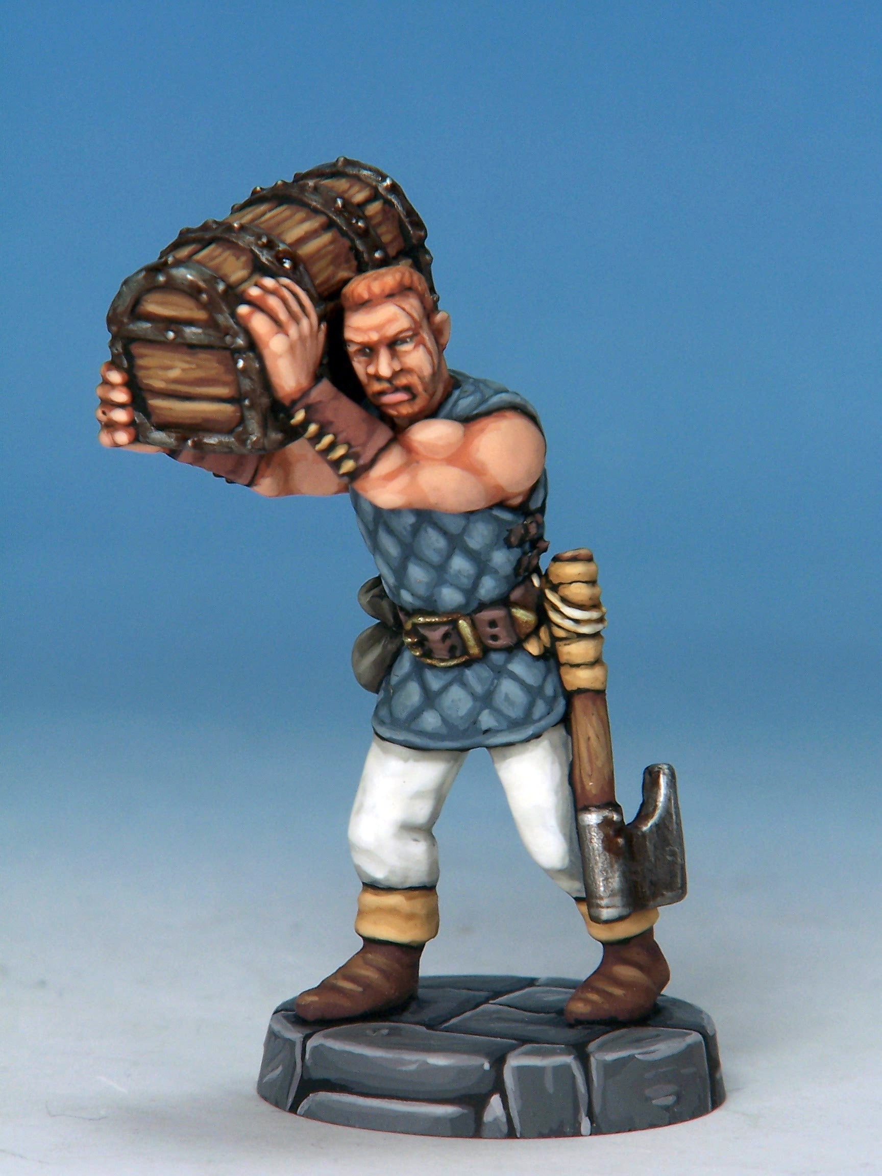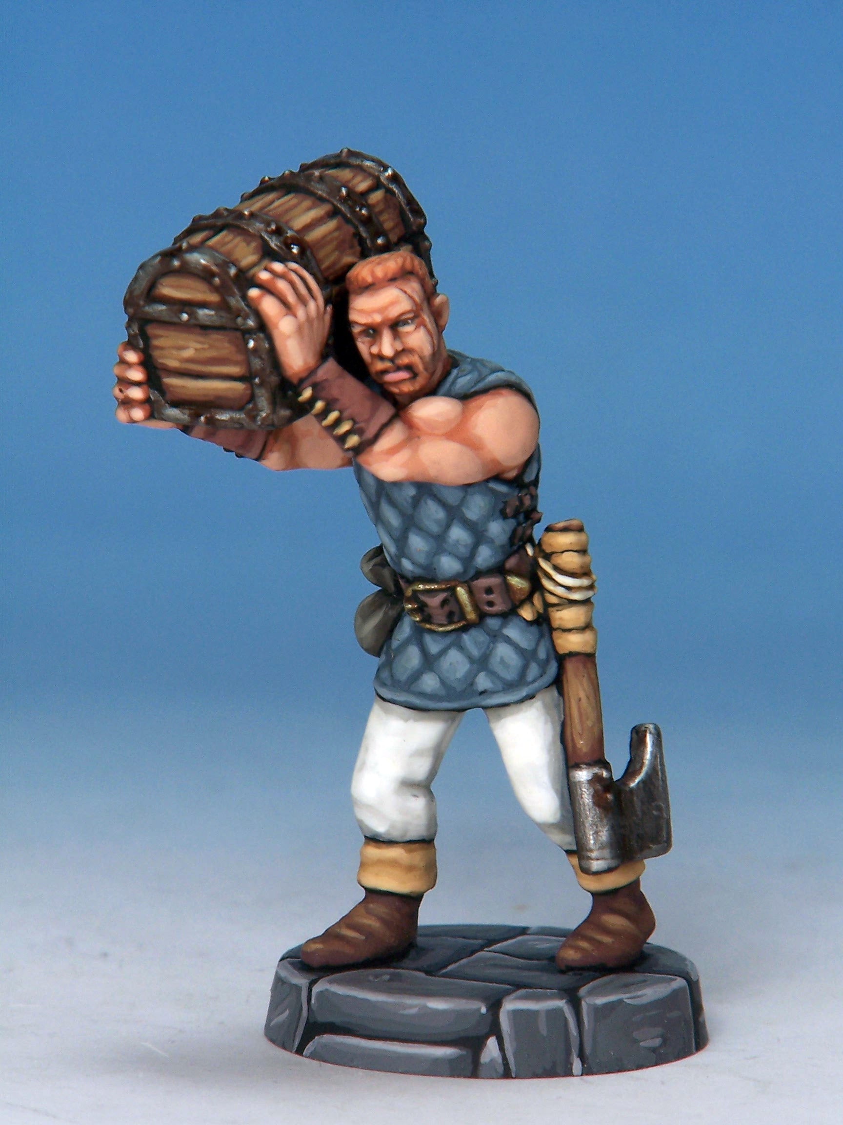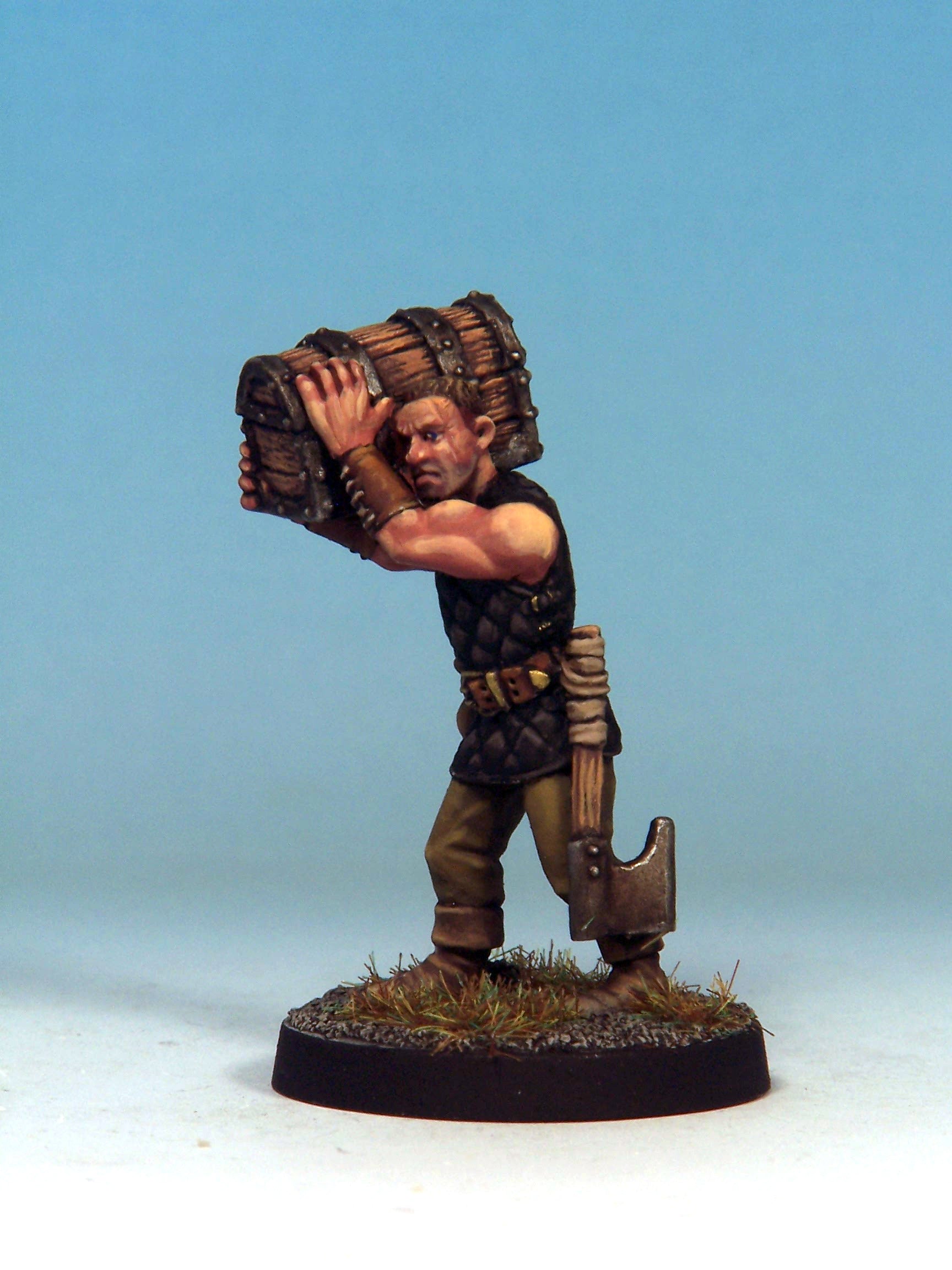 This brawny fellow wears a quilted leather jerkin, and is armed with a battle-axe. He carries a small chest over his shoulder. It is a single-piece casting which requires no assembly.