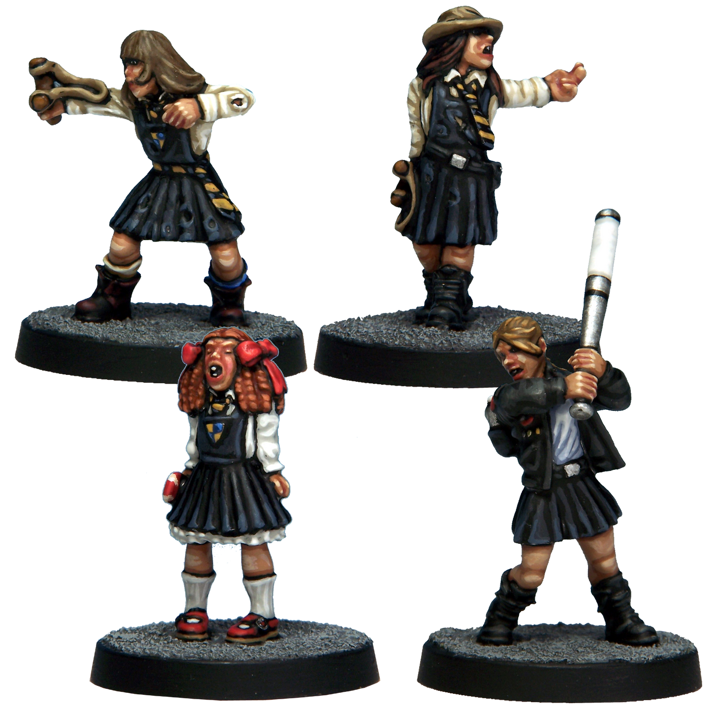 These unruly progeny have risen to the challenge of the end of the world and are ready to take on all-comers. Dorothy loves sport and cooking – she’s armed with a baseball bat and a rucksack full of homemade explosives. Then we have three delightful fourth formers, two are equipped with ladles of attitude and lethal catapults, while “Violent” Elizabeth is just ready to “thcweam and thcweam”!