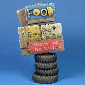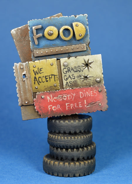 This five piece kit is sold unassembled and includes a central post (4.8cm high) and four separate signs ( two plain, one Food, one Route 66) allowing any configuration you like.