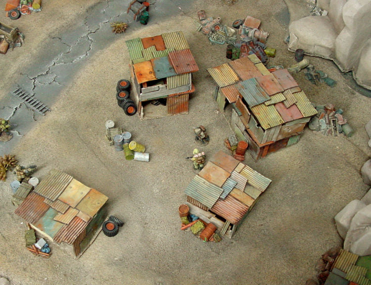 This set consists of enough parts to build the pictured squatter settlement. Due to the modular construction, it is possible to build up to seven individual building from the parts, the pictured four buildings, or even only one single giant complex!