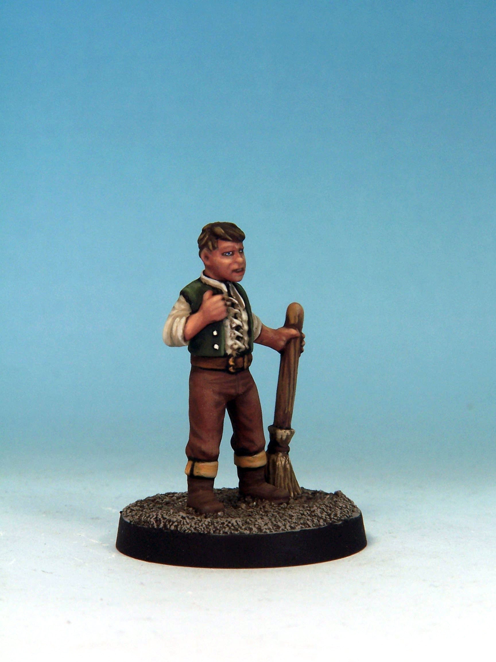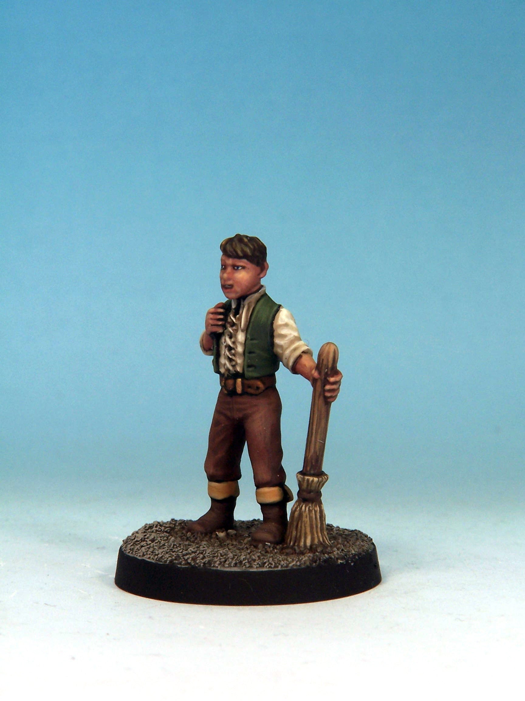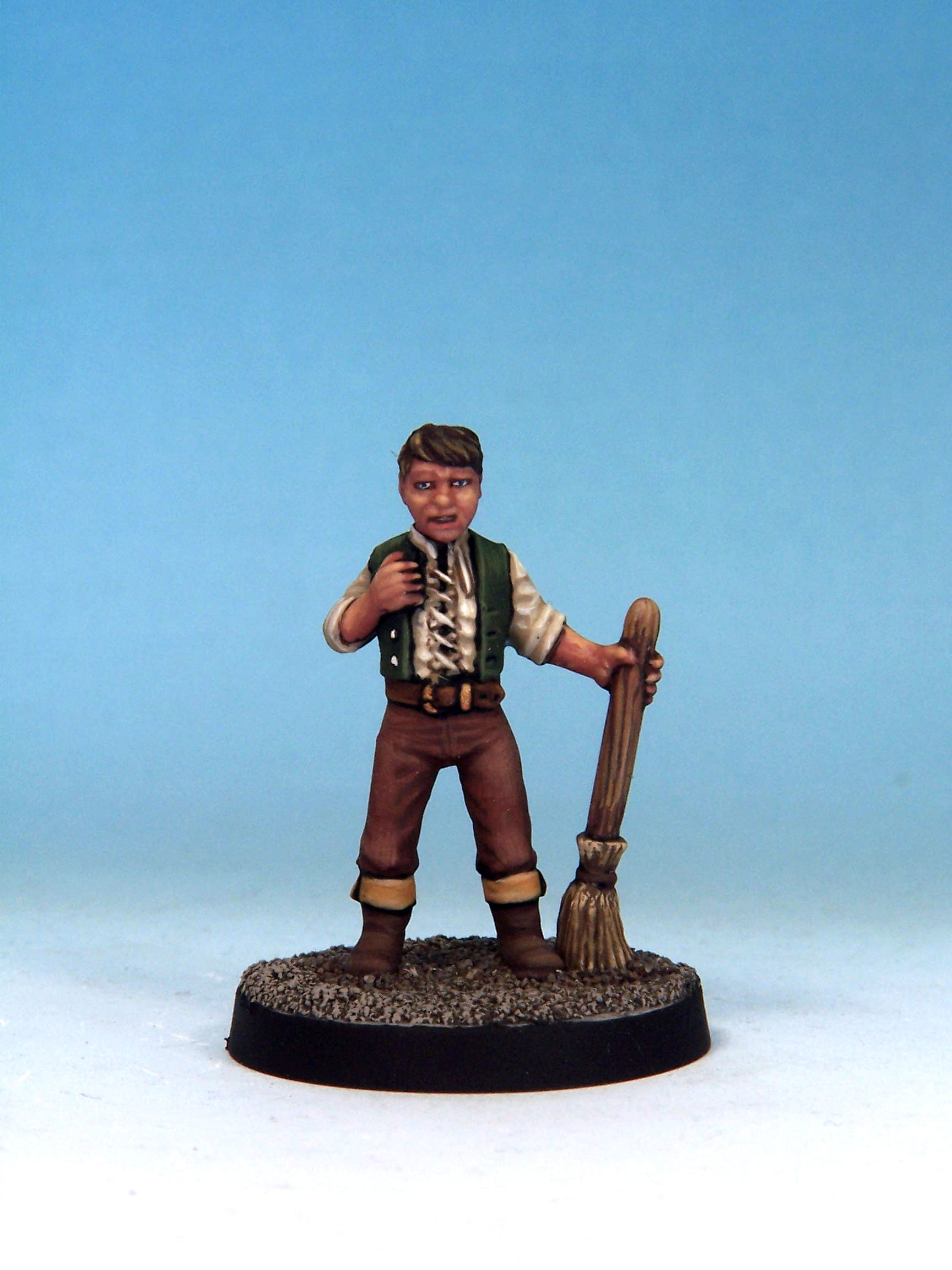 This figure represents a stable boy, a young employee of a fantasy tavern or livery stables. He wears plain clothes and carries a besom broom, which smells strongly of horse manure! It is a single-piece casting which requires no assembly.