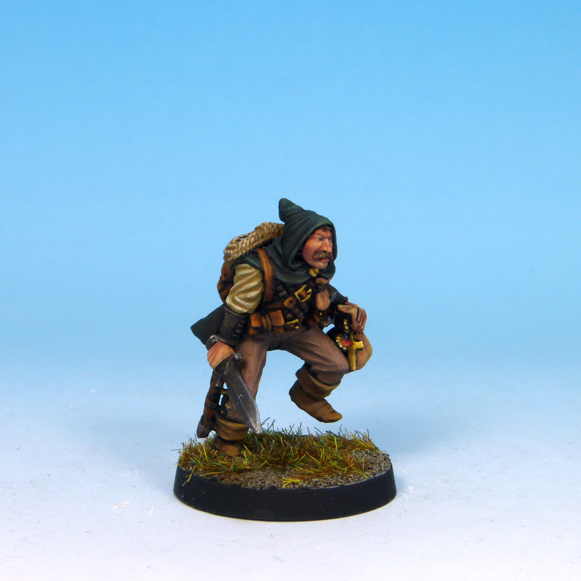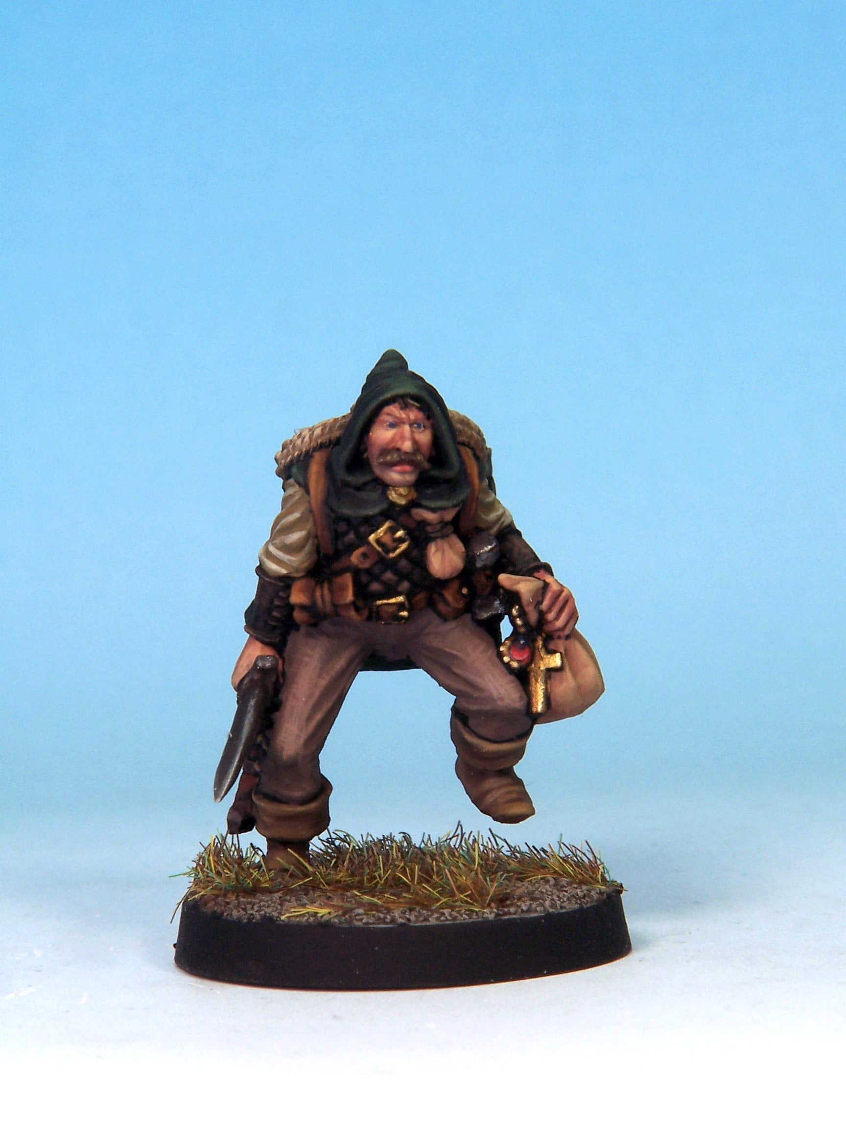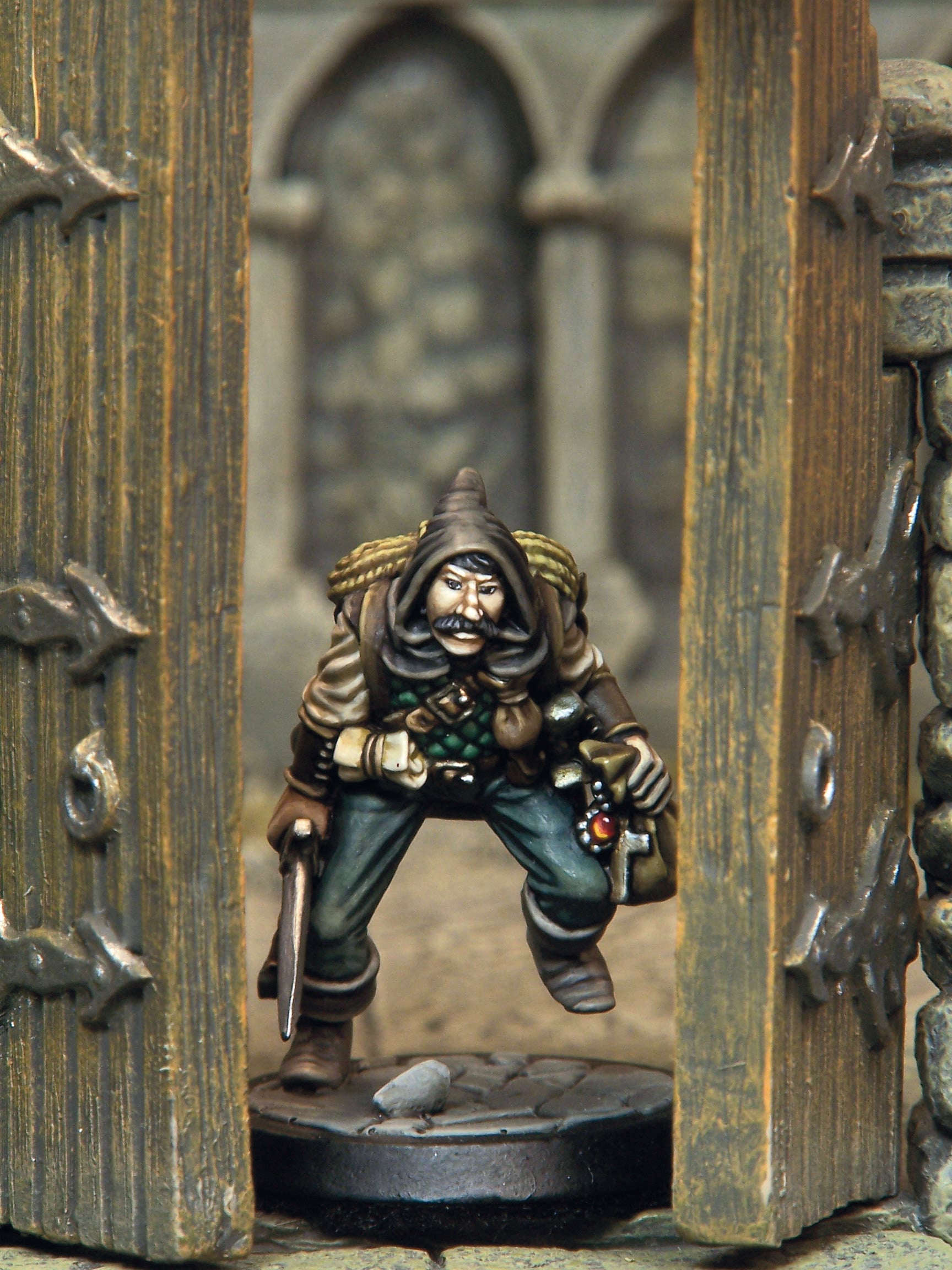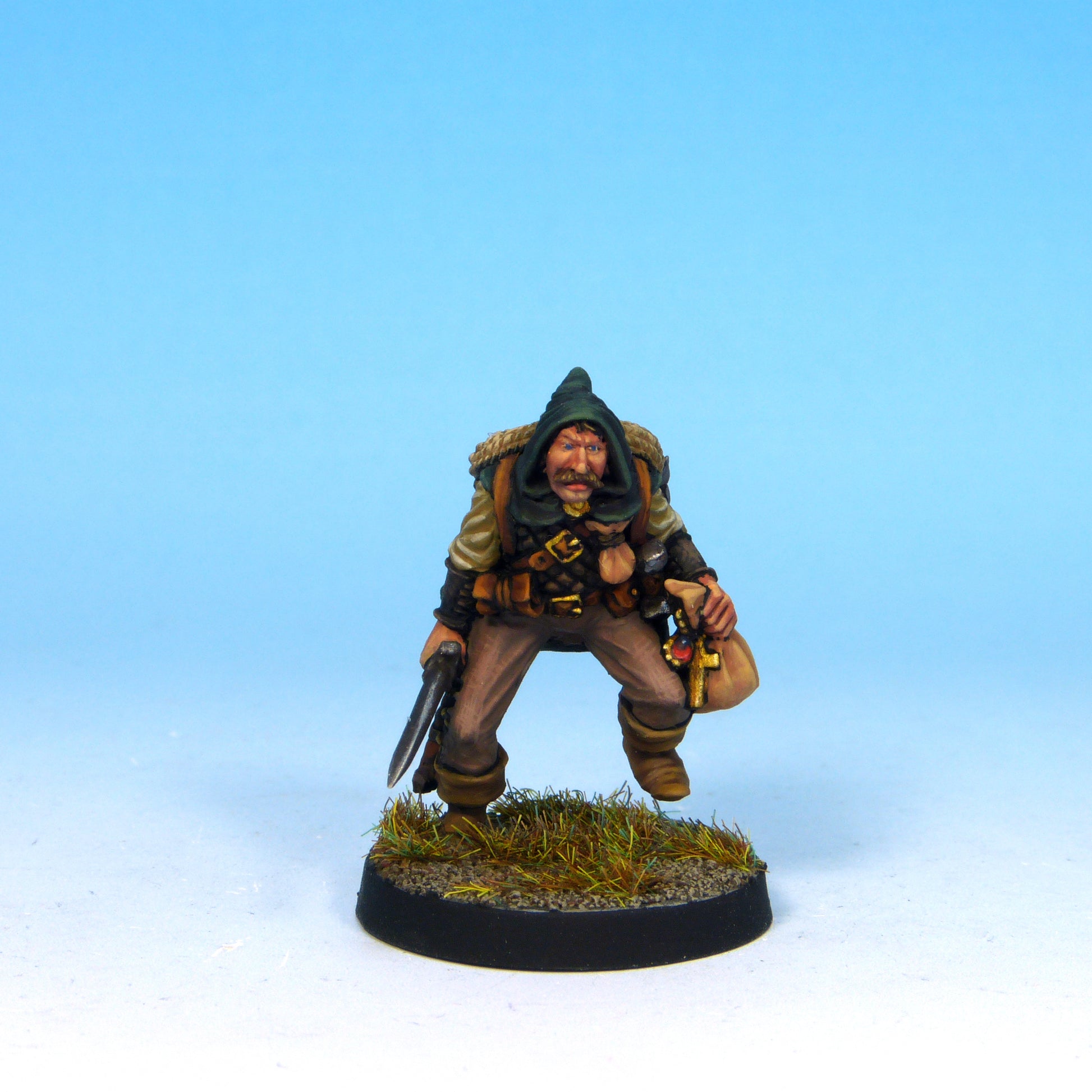 This hooded thief in leather armour, is fleeing the scene with short-sword and a sack of loot! He will backstab any dungeon denizens that may cross the path of your adventuring party!