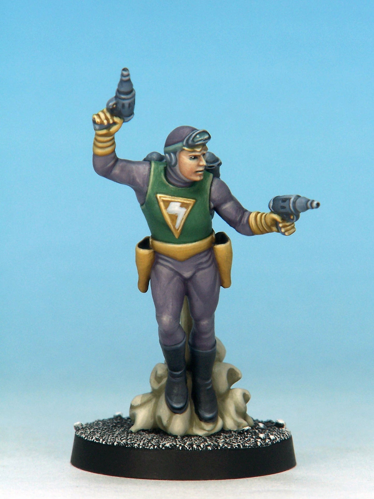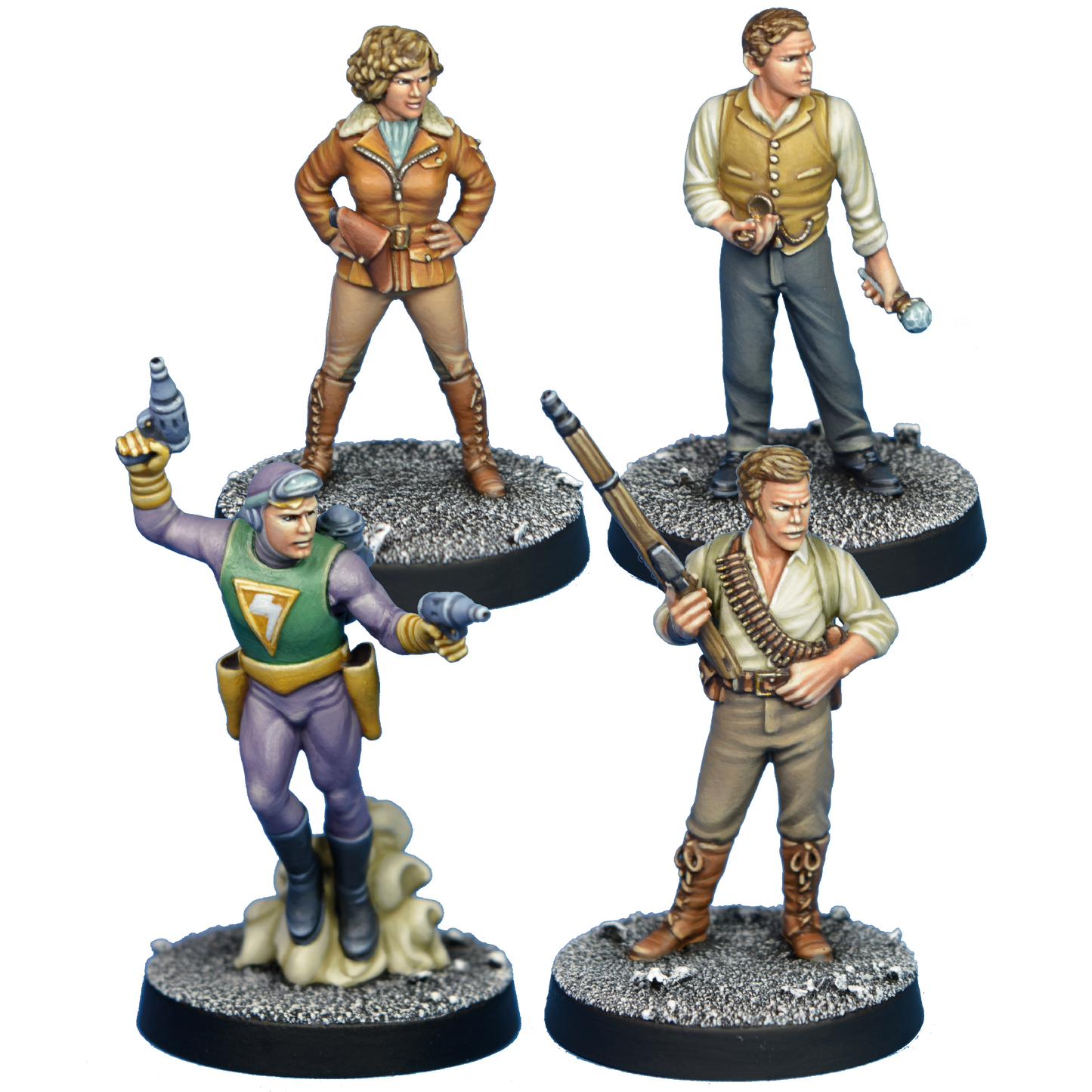 From across the ages, come these four pulp heroes. This pack contains a Time Traveller, a Flying Ace, a Fortune Hunter and a Jet Pack Hero.