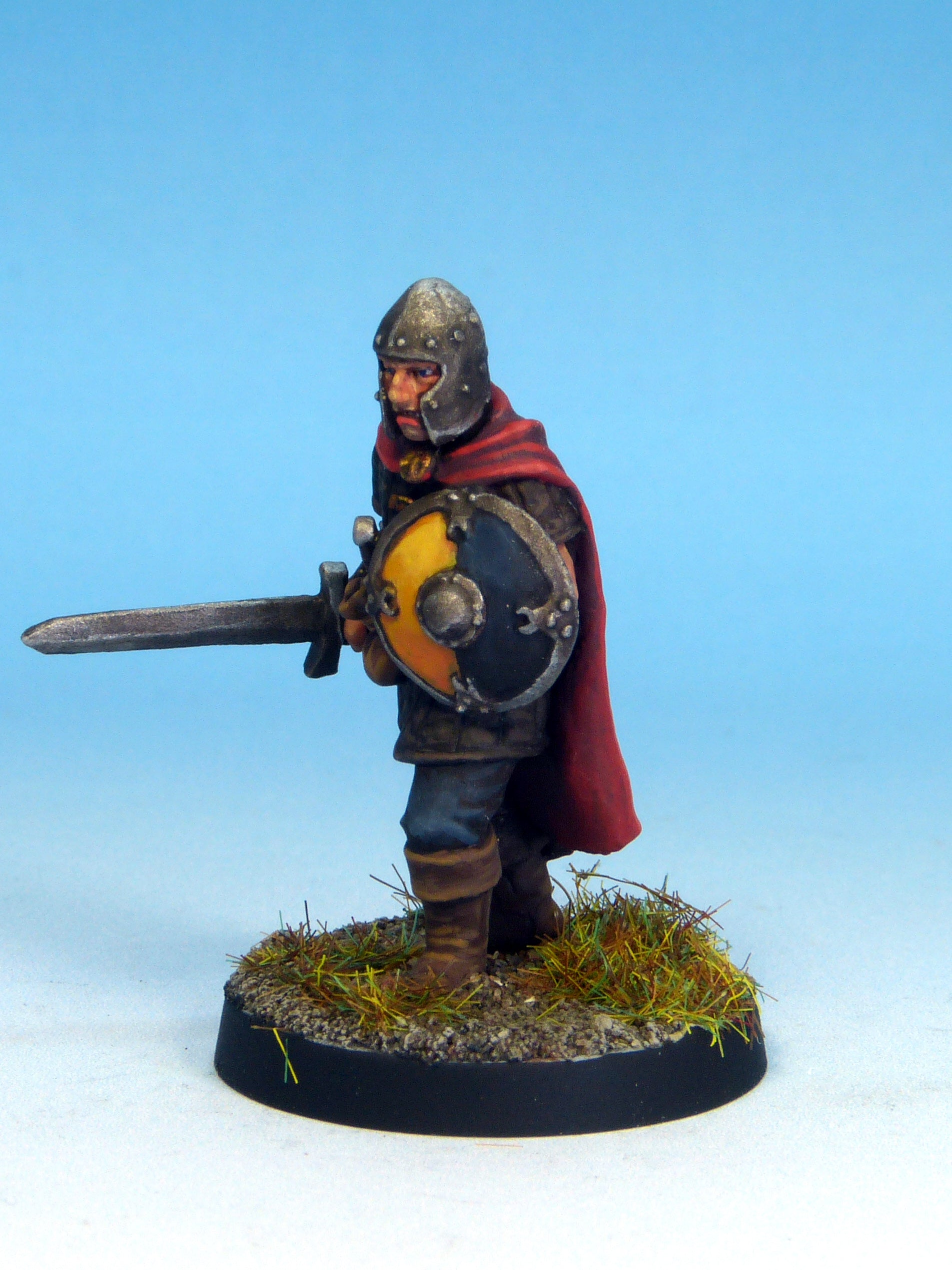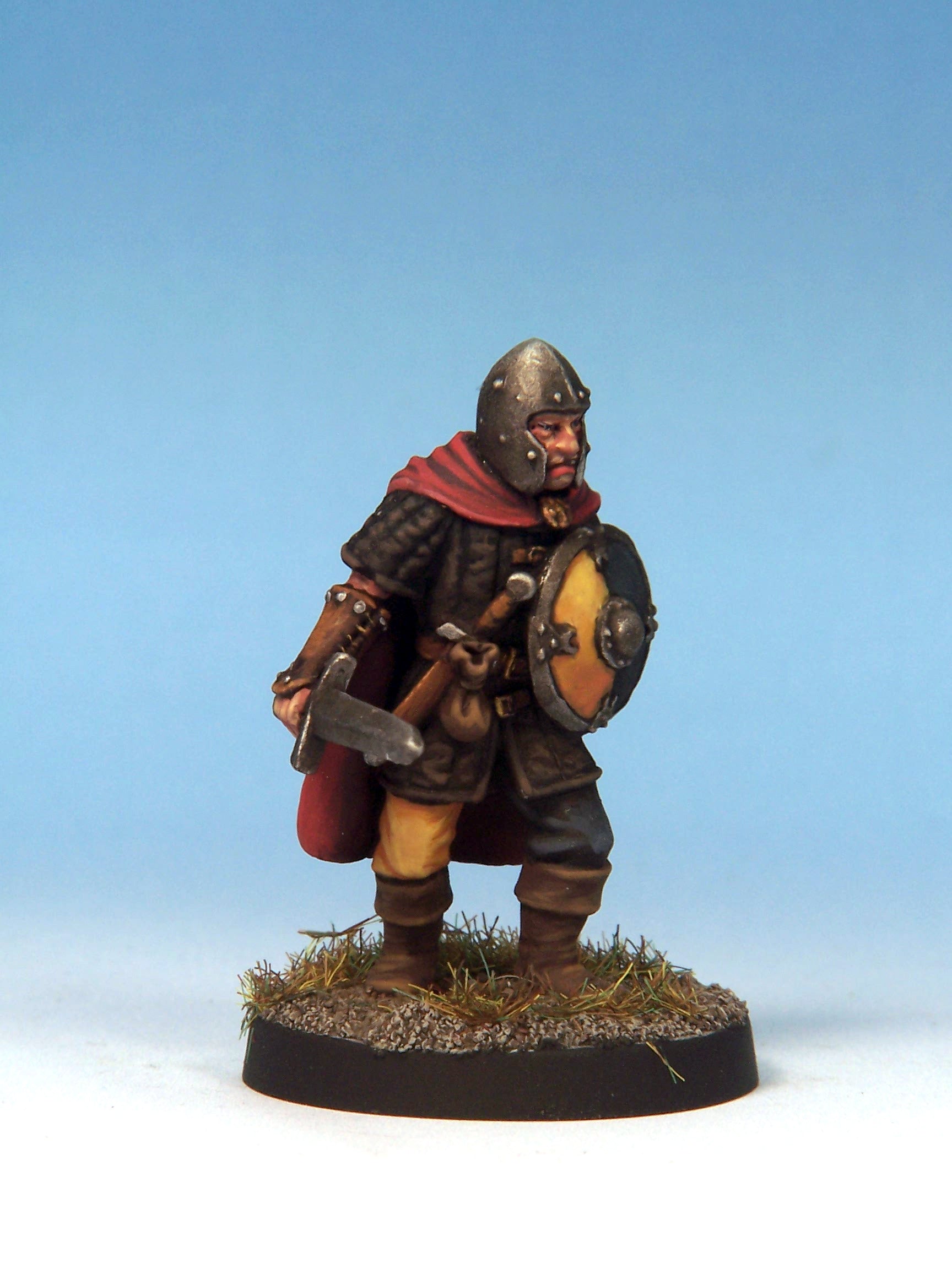 This figure represents a member of the town watch. He wears a padded leather jerkin and steel ‘barbuta’ helmet. He is armed with a longsword and shield, and wears a cloak to guard against the chill of the cold night air. It is a multi-piece casting (2 parts) which requires assembly.