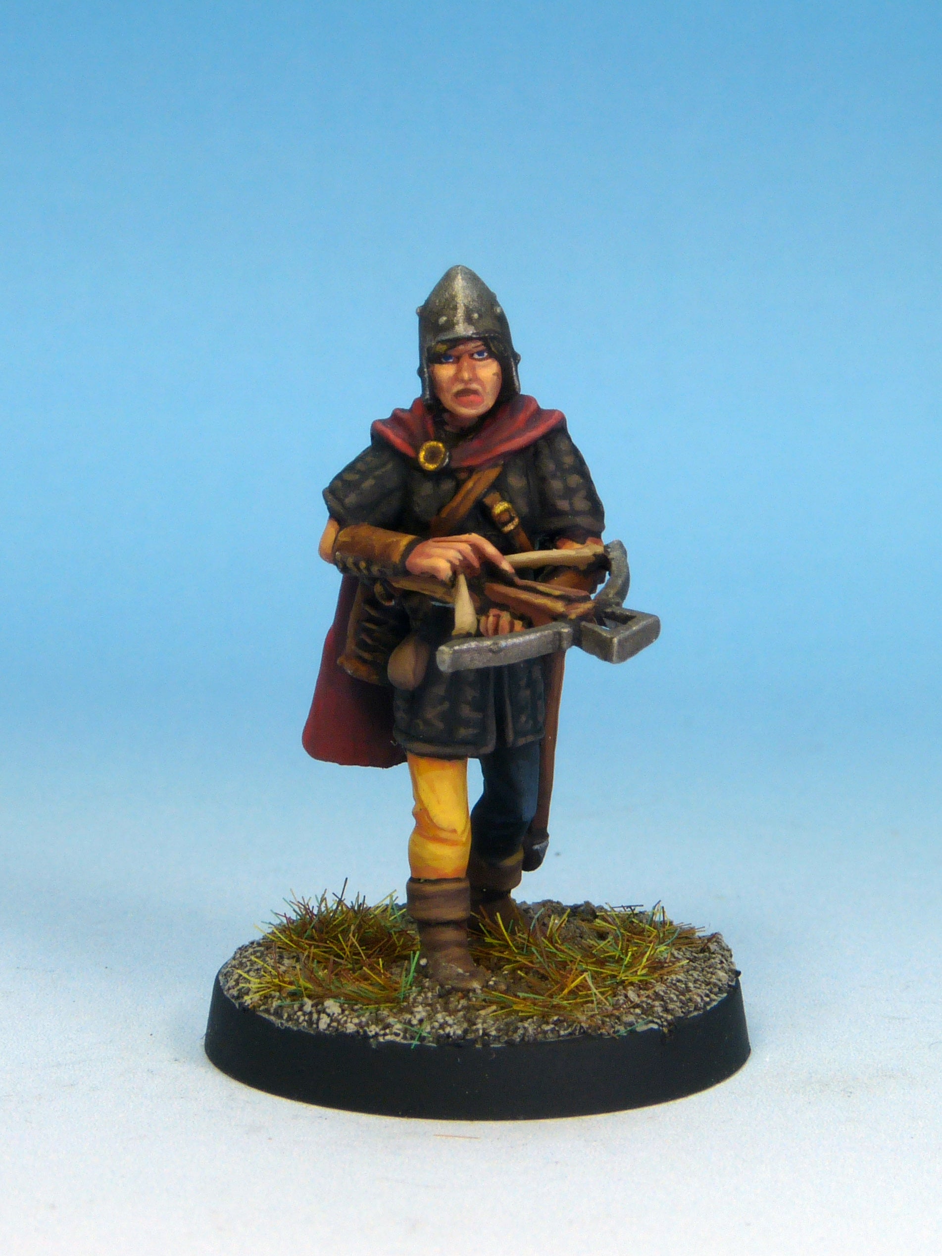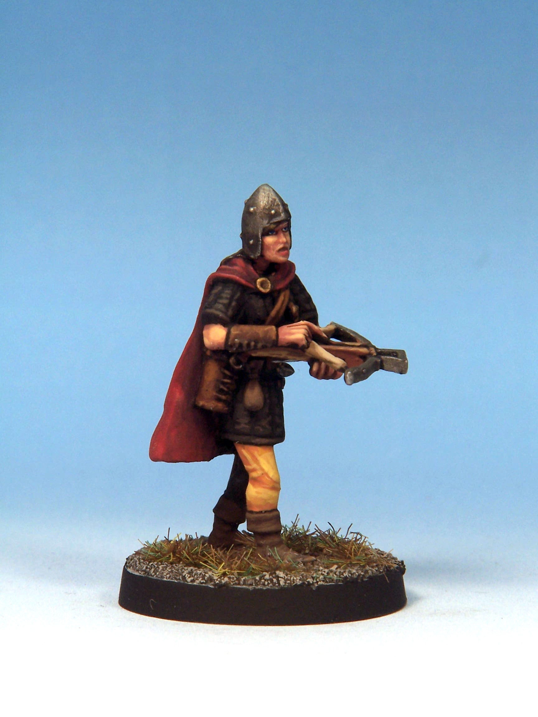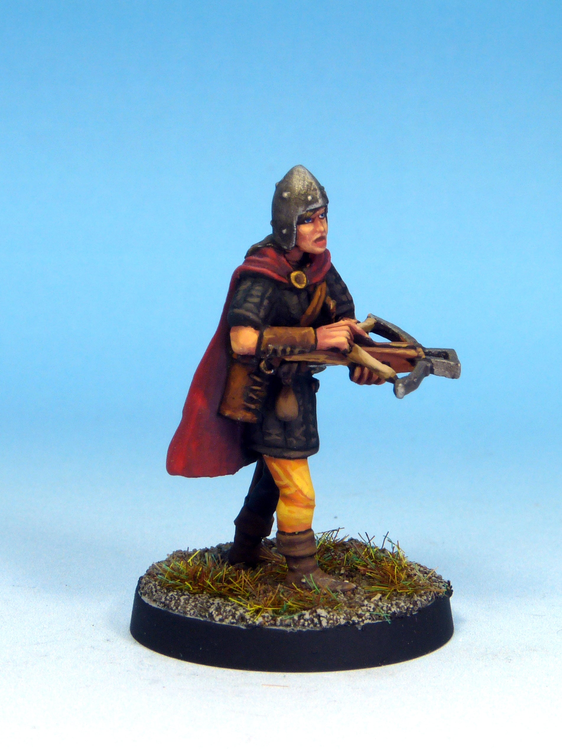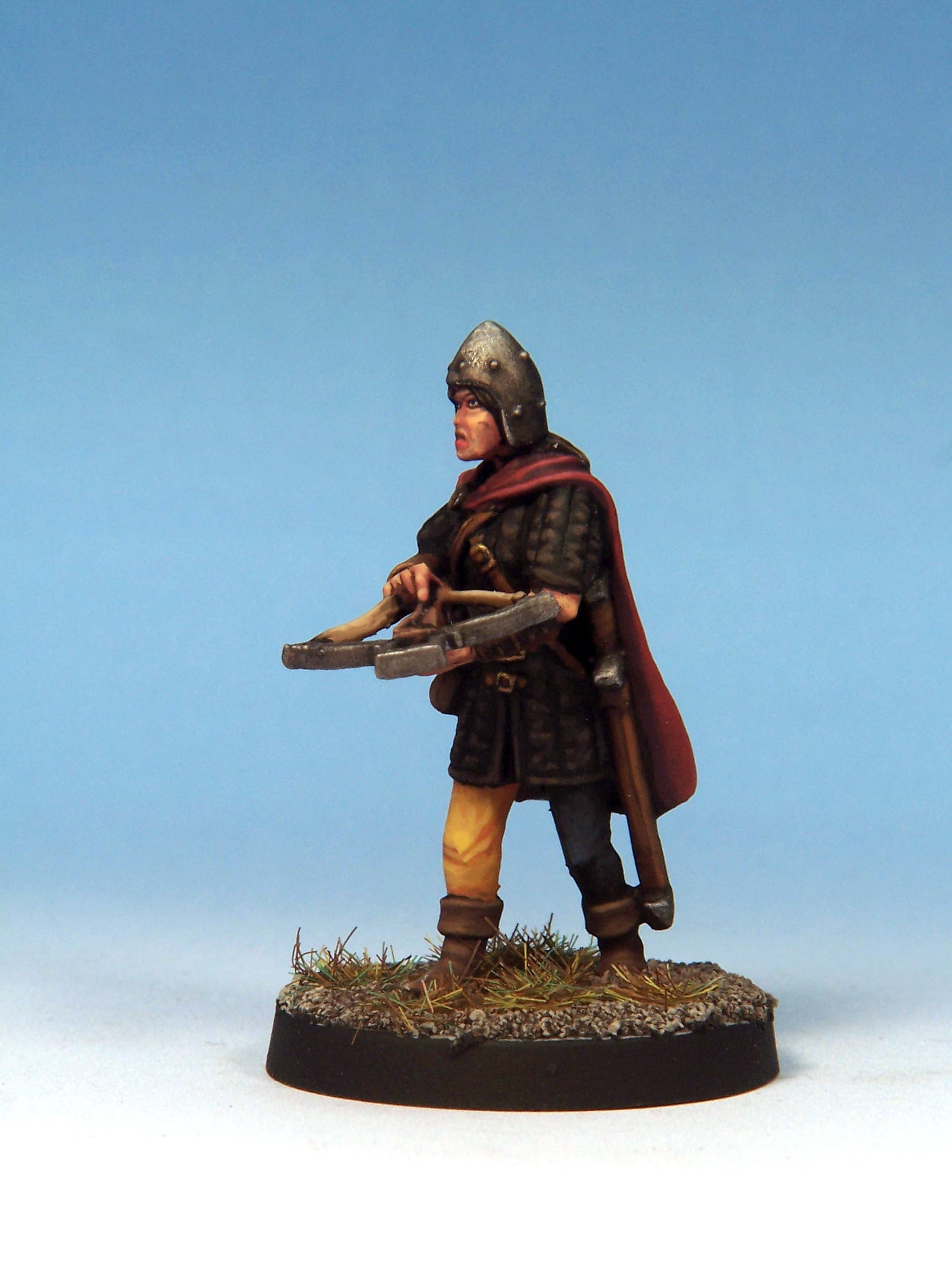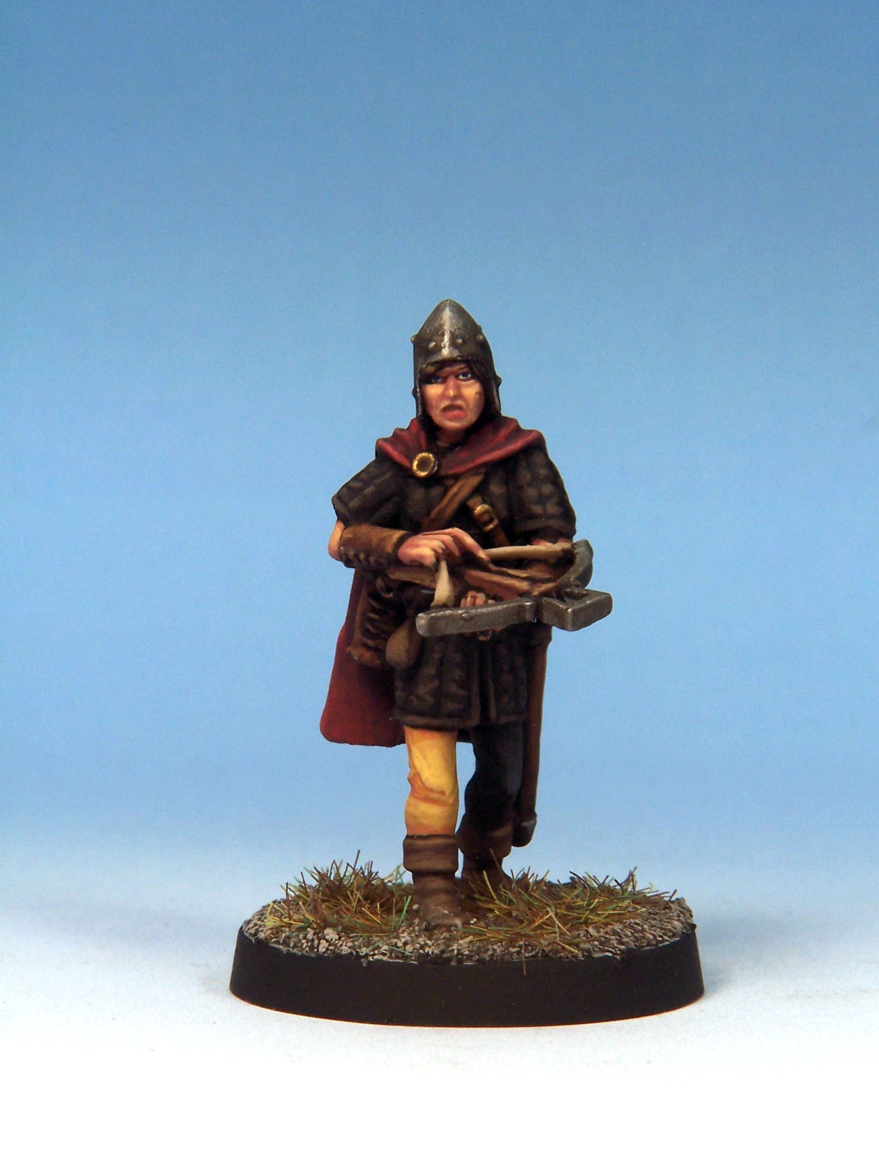 This figure represents a guardswoman in the town watch guard. She wears a padded leather jerkin and steel ‘barbuta’ helmet. She is armed with a light crossbow, and wears a cloak to guard against the chill of the cold night air. It is a multi-piece casting (2 parts) which requires assembly.