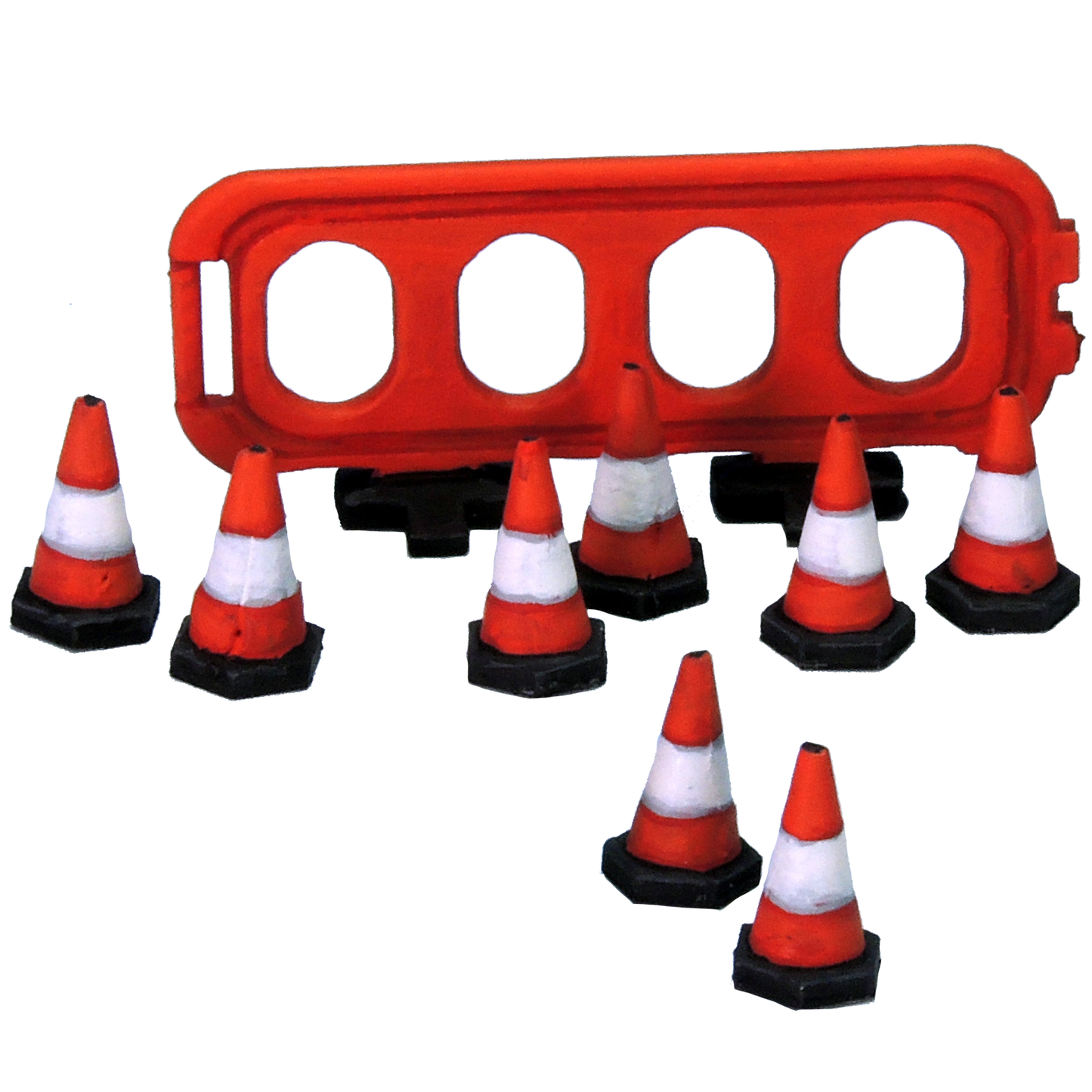 Zone off your streets with these cones and safety barriers. Eight cones and one barrier (in three parts) included in this set – Barrier measures 45mm long and 20mm high.