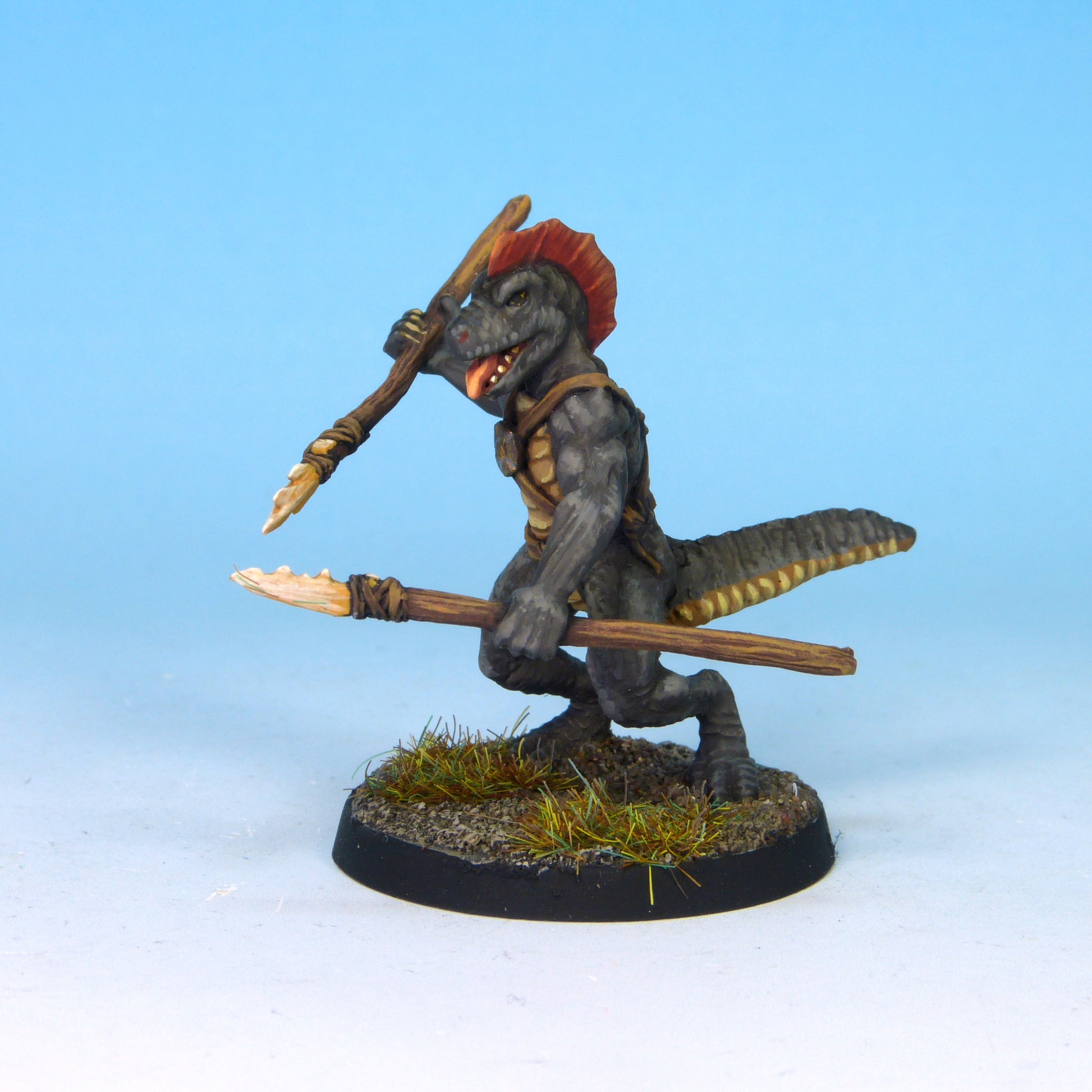 These aggressive reptile-men are commonly found in upper levels of caverns and dungeons. They have chameleon-like camouflage abilities, and give off an unholy stench when angered. They are tough and unpleasant foes for a low-level party! This creature is armed with a pair of javelins and stands 32mm tall.
