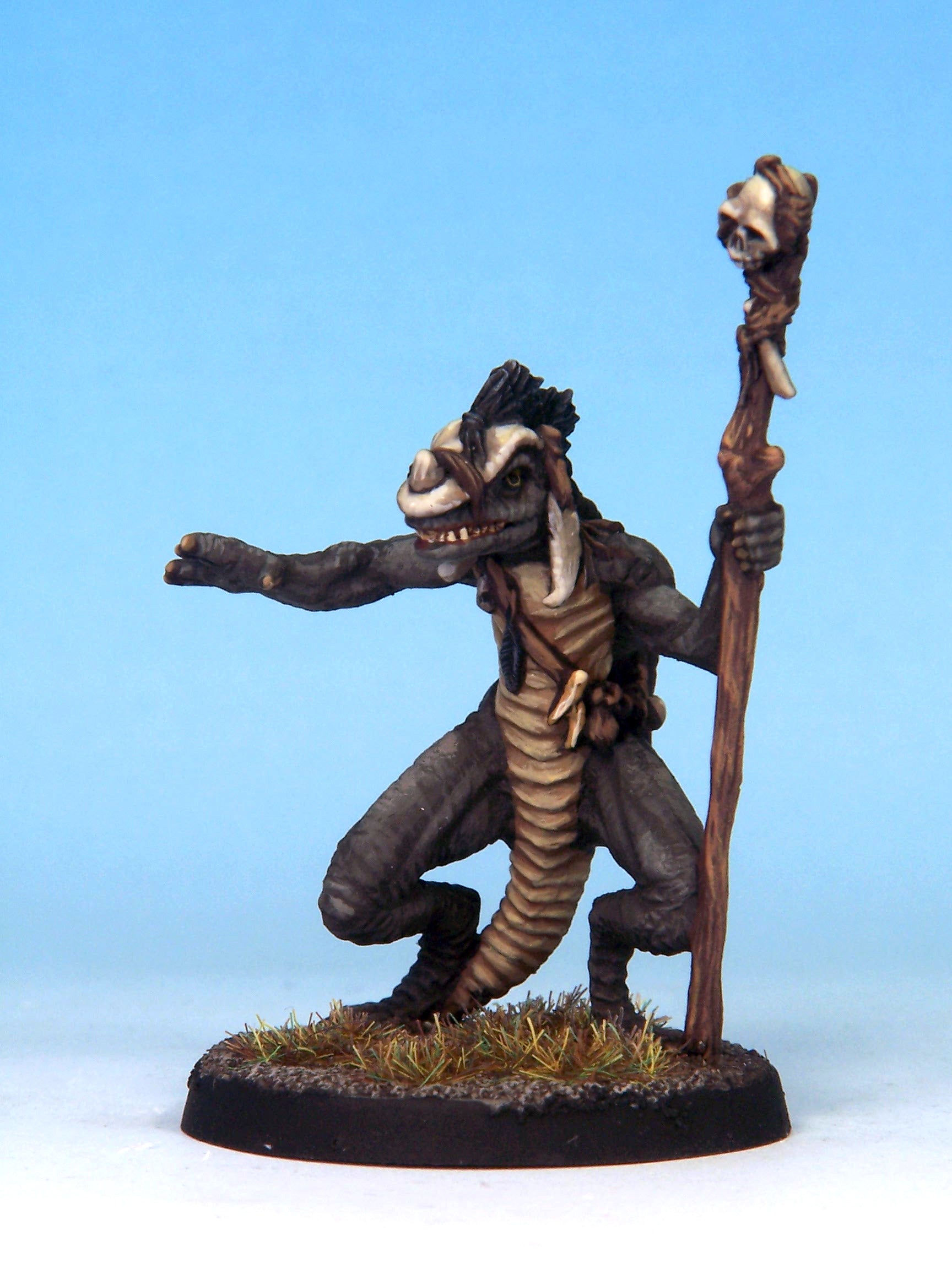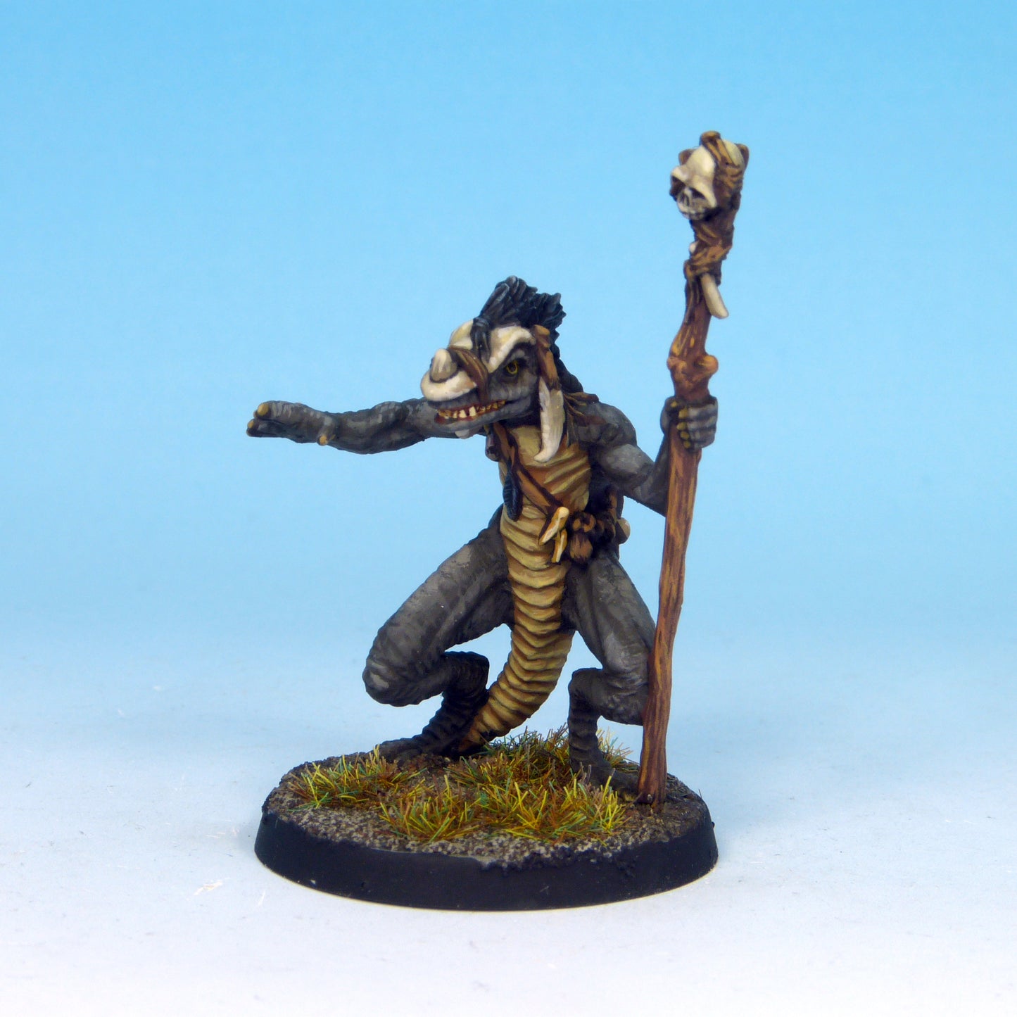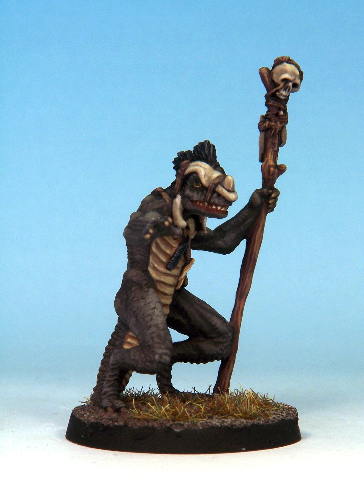 A shamanic spell-caster of a tribe of troglodytes; aggressive reptile-men, commonly found in upper levels of caverns and dungeons. They have chameleon-like camouflage abilities, and give off an unholy stench when angered. They are tough and unpleasant foes for a low-level party! This creature is armed with wooden staff and wears a skull head-dress.
