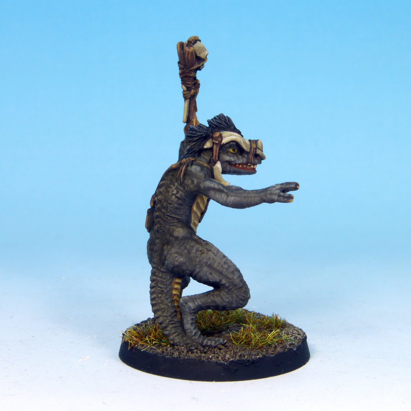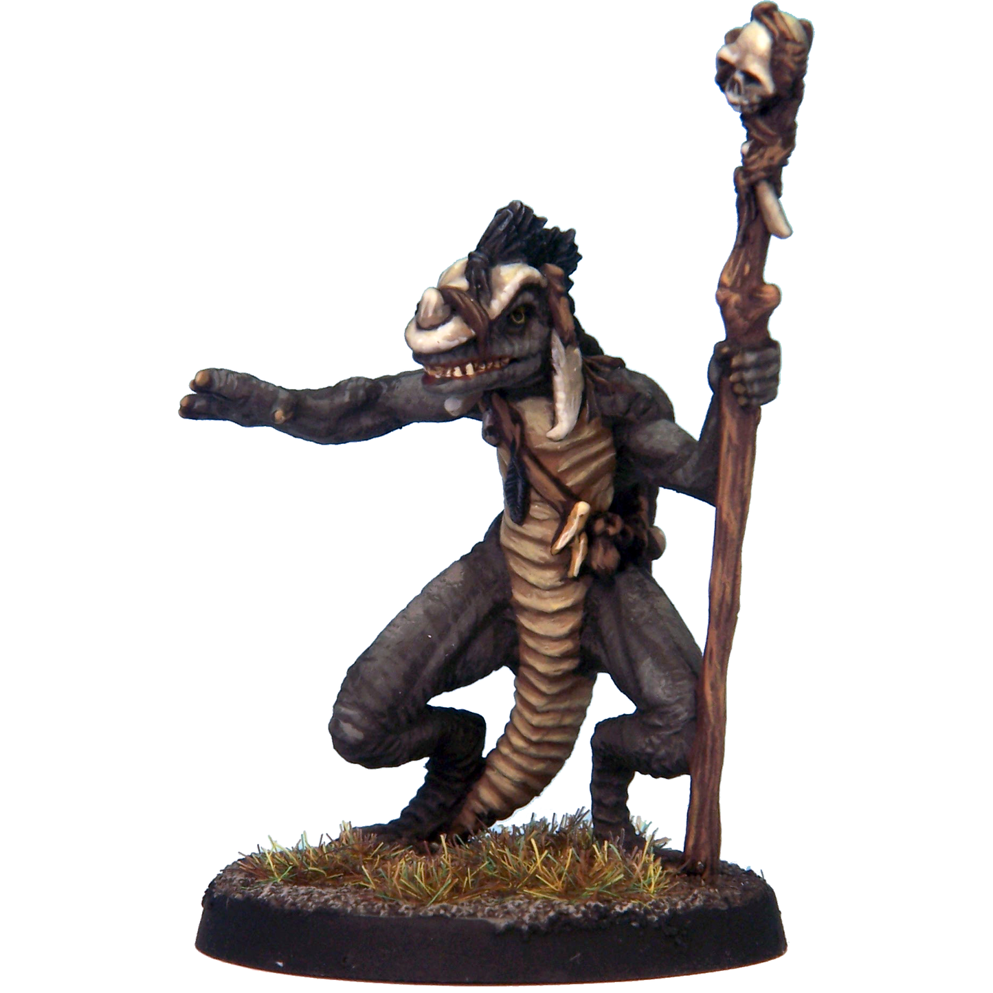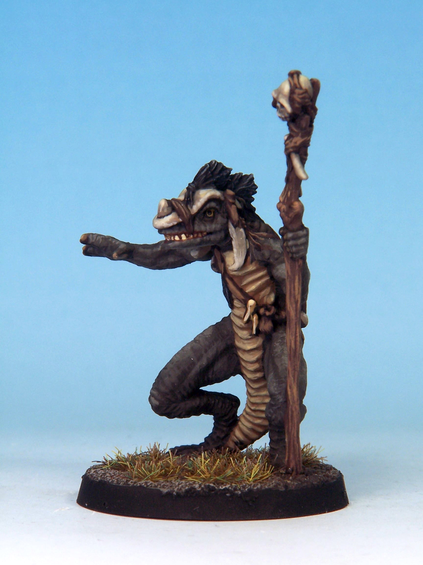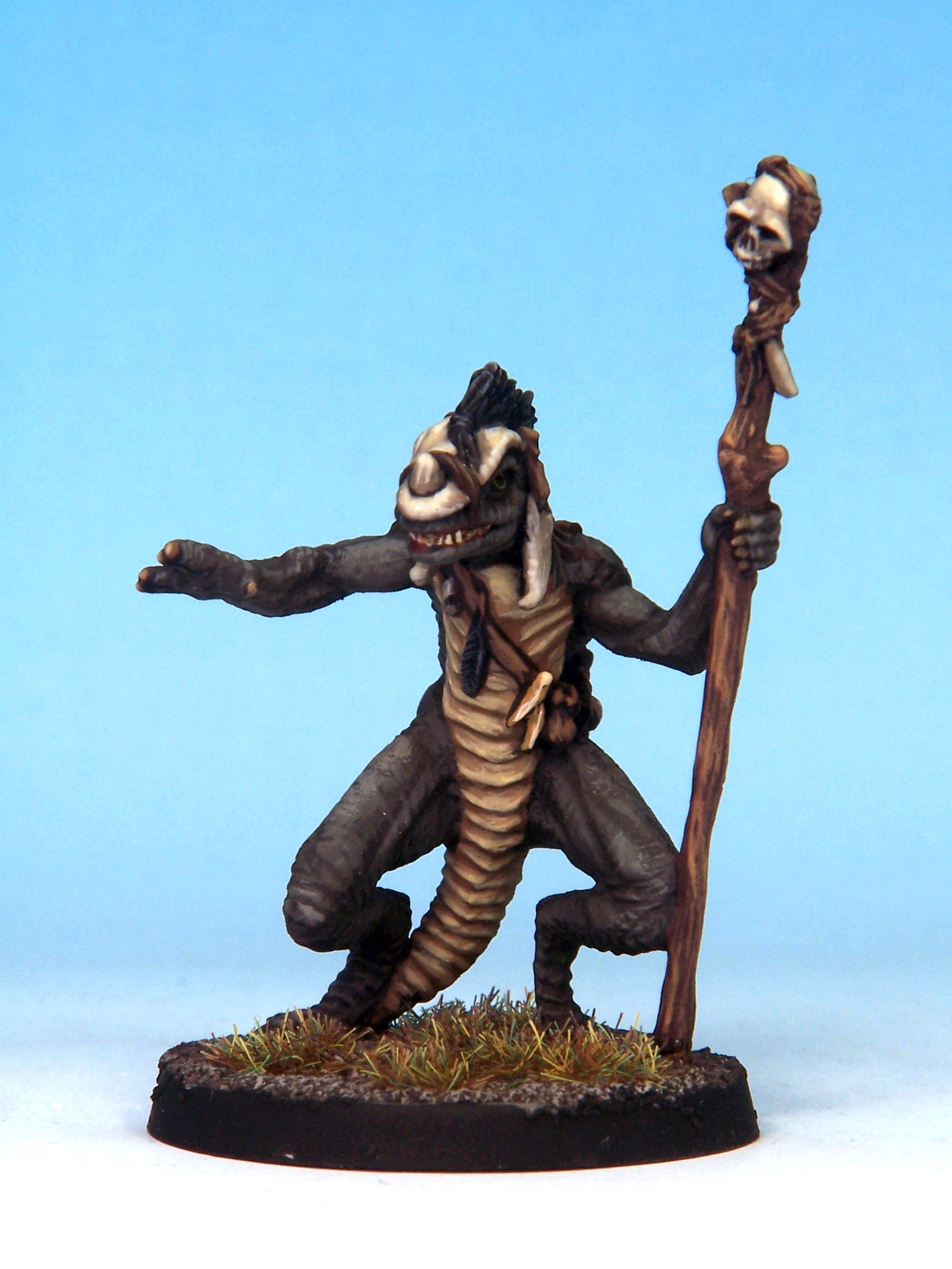 A shamanic spell-caster of a tribe of troglodytes; aggressive reptile-men, commonly found in upper levels of caverns and dungeons. They have chameleon-like camouflage abilities, and give off an unholy stench when angered. They are tough and unpleasant foes for a low-level party! This creature is armed with wooden staff and wears a skull head-dress.